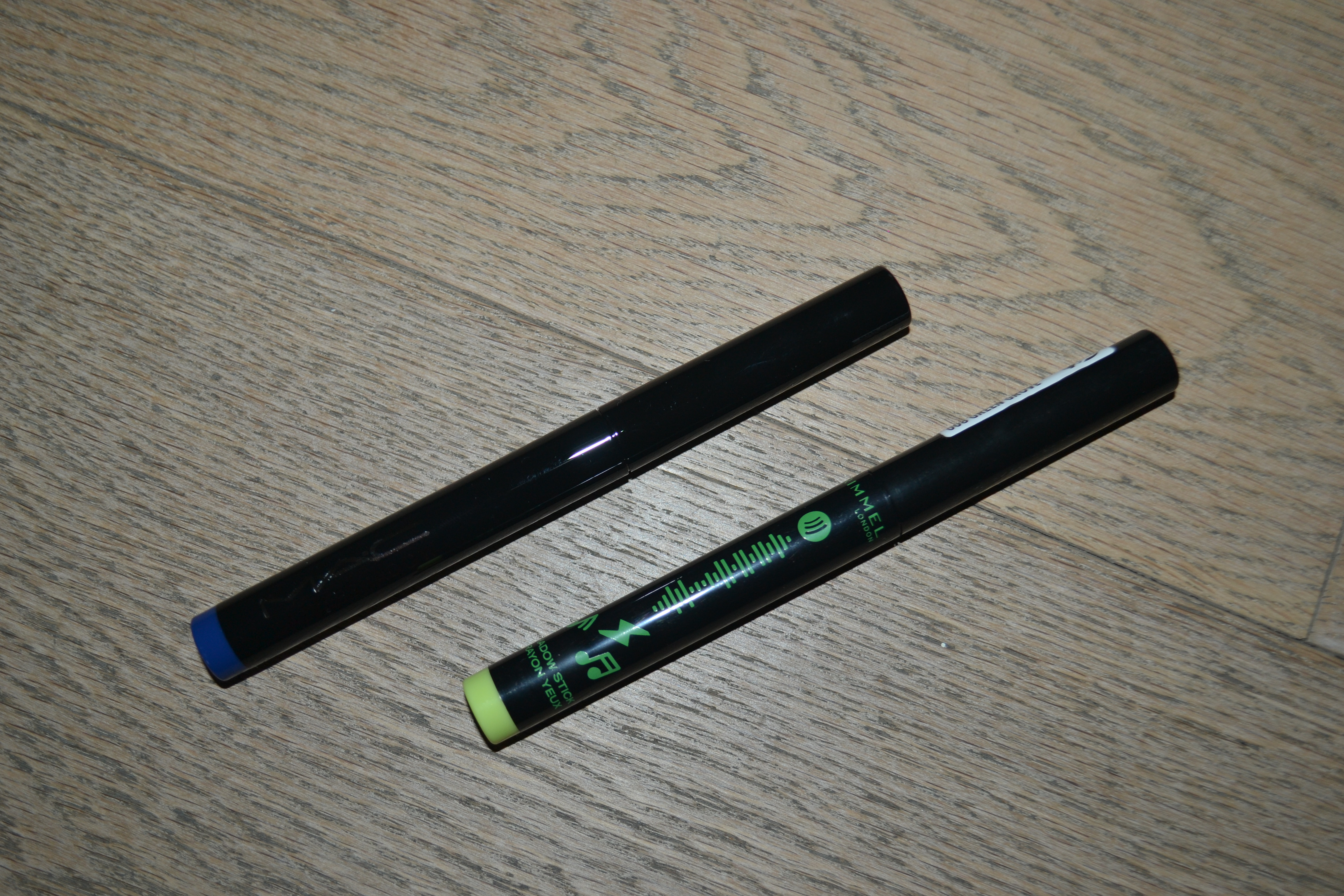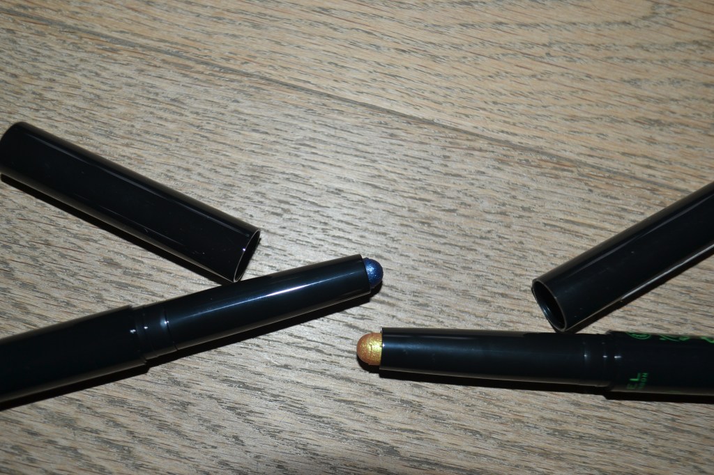 Let’s move on to eye products. I got two eyeshadow sticks; the MAC Dazzleshadow eye shadow stick in Bedazzled Denim and the Rimmel Turn Up the Volume Wonder shadow stick in 008 Green Grove. Both are really pretty.