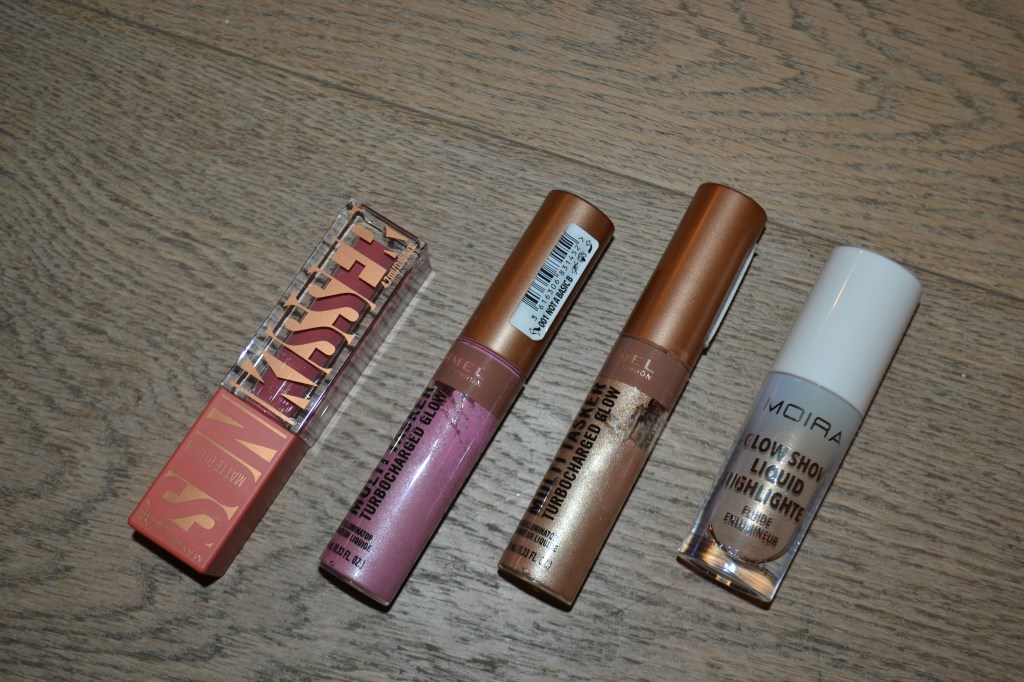 These are the other cheek products I bought. I got the Maybelline Sunkisser matte liquid blush in 38 Pink Ripple, the Rimmel Turbocharged Glow in 001 Not A Basic B and 004 Chelsea Glow, and the Moira Glow Show liquid highlighter in 001 Vanilla Bliss. I haven’t worn the Maybelline Sunkisser matte liquid blush yet, but it was love at first sight with the other three products. I’m wearing the Rimmel Turbocharged Glows here, and I was so impressed by the application, the pigmentation, the finish, and the wear.
