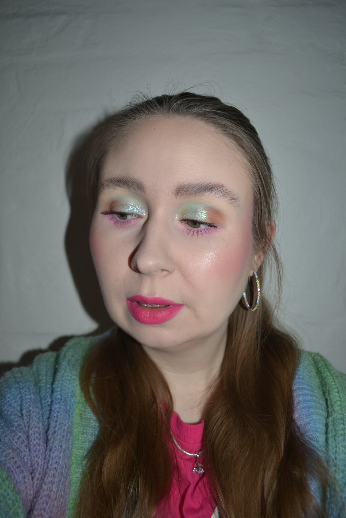 (Base: primer – e.l.f. Cosmetics Liquid Poreless Putty primer, foundation – Colourpop Pretty Fresh hyaluronic acid tinted moisturizer (shade: Fair 1 N), concealers – e.l.f. Cosmetics Putty Color-Correcting Eye Brightener (shade: Fair) + Colourpop Pretty Fresh hyaluronic creamy concealer (shade: Fair 10 N), powders – Essence Harley Quinn Pink loose setting powder in 01 Harley Vibes + e.l.f. Cosmetics Halo Glow setting powder in Light. Face make-up: bronzer – Catrice Melted Sun liquid bronzer in 005 Tan Lines, blush – Essence Juicy Bomb Party Jelly blush in 01 Cassis Crush, highlighter – R.E.M. Beauty Eclipse glow stick in Fembot. Eye make-up: base – MAC Pro Longwear Paint Pot in Painterly, eyeshadows – Wicked Widow Beauty Resurrection palette (shades: Divine Light + Afterlife + Crypt + Growth + Revenant + Serenity) + MAC Dazzleshadow liquid eyeshadow in Crumbled Diamonds, mascara – L’Oréal Panorama volume million mascara in Black, eyeliner – Oden’s Eye Solmåne gel liner in 009 Sky Blue. Eyebrows: NYX Lift & Snatch! Brow Tint Pen in Ash Brown + e.l.f. Cosmetics Brow Lift. Lips: NYX Slim lip pencil in Fuchsia + Fenty Beauty Fenty Icon Velvet liquid lipstick in Smurf’Melon)