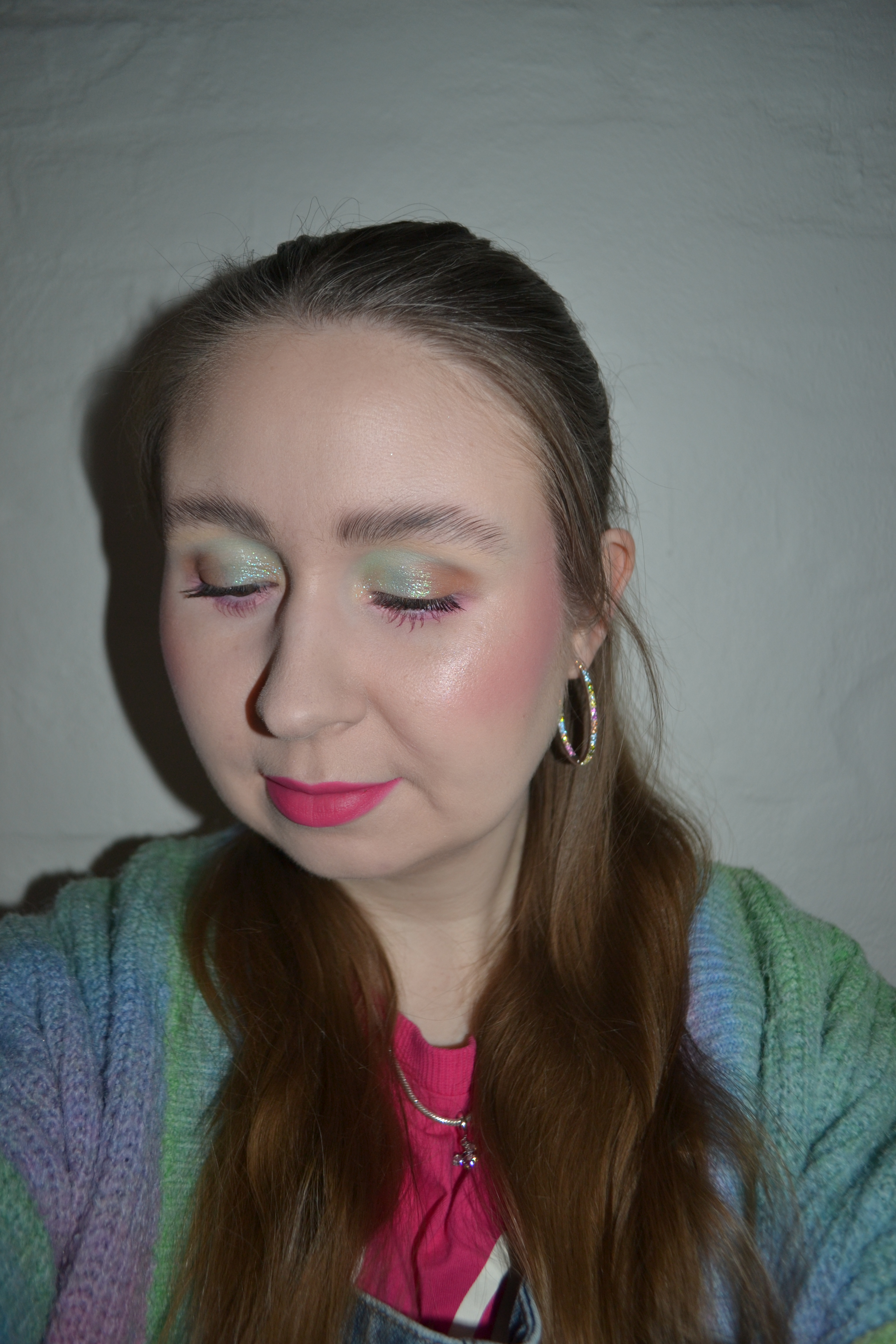 (Base: primer – e.l.f. Cosmetics Liquid Poreless Putty primer, foundation – Milk Makeup Hydro Grip gel tint (shade: 2), concealers – e.l.f. Cosmetics Putty Color-Correcting Eye Brightener (shade: Fair) + Natasha Denona Hy-Glam concealer (shade: N1), powder – Rare Beauty Always An Optimist Soft Radiance setting powder in Light. Face make-up: bronzer – Glam Shop Z Fioletem bronzer in Chocolate, blush + highlighter – Natasha Denona Love Glow Cheek palette (shades: Glow Cream Base (blush) + Glow Impact Powder (highlighter) + Diamond Powder (highlighter)). Eye make-up: base – MAC Pro Longwear Paint Pot in Painterly, eyeshadows – Essence Soft Touch eyeshadow in 01 The One + MAC Metamorphosis Face & Eye palette (shades: Cherry Sangria + Calypso Coral + Hot Honey + Daffodillionaire + Lavender Lemonade + Daft Pink), mascara – Maybelline Lash Sensational Sky High mascara (shade: Burgundy Haze), eyeliner – Catrice Eyepencil in C01 Ruby Noel. Eyebrows: NYX Lift & Snatch! Brow Tint Pen in Ash Brown + e.l.f. Cosmetics Brow Lift. Lips: Colourpop Bratz Lippie pencil in Angel + Cosmic Beauty tinted lip oil in Ritual)