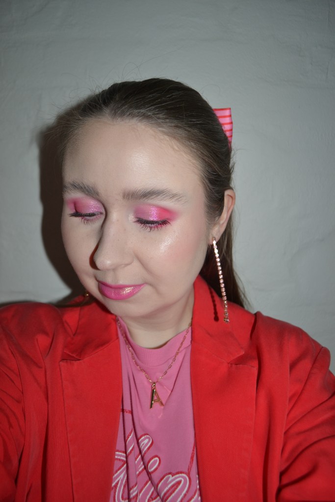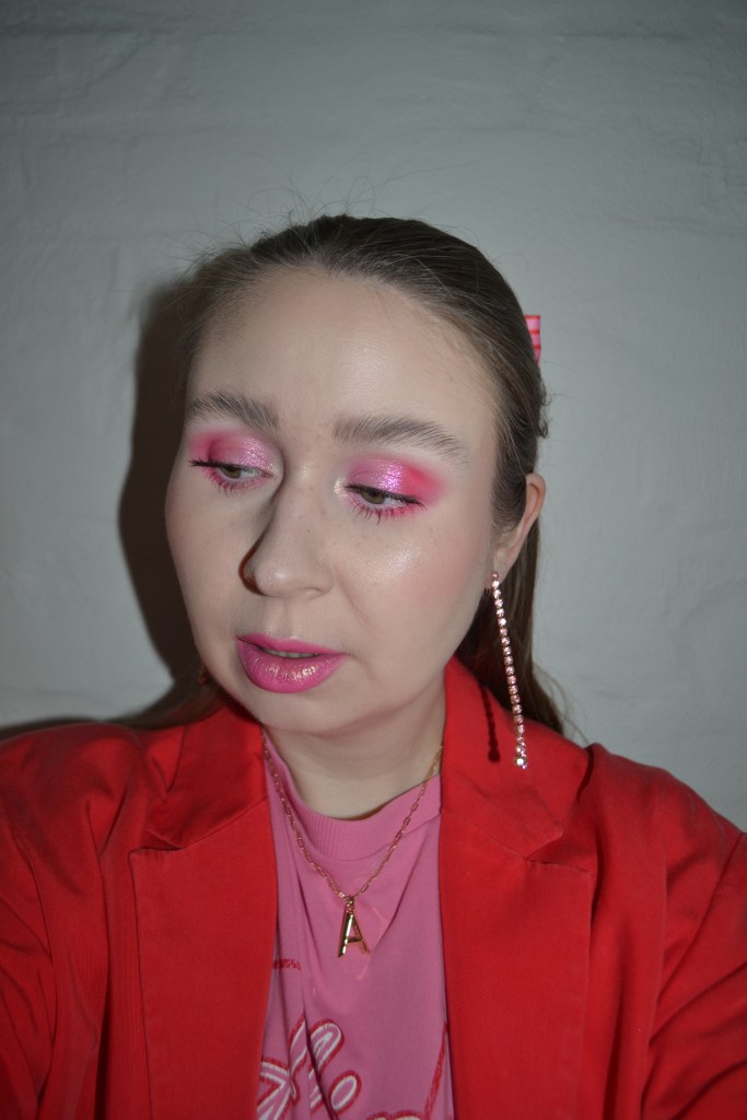 Here’s the make-up I wore with this outfit. I didn’t want to spend to much time doing my make-up that day, so I went for a quick and simple eye look with a pop of pink on the lips and cheeks.
