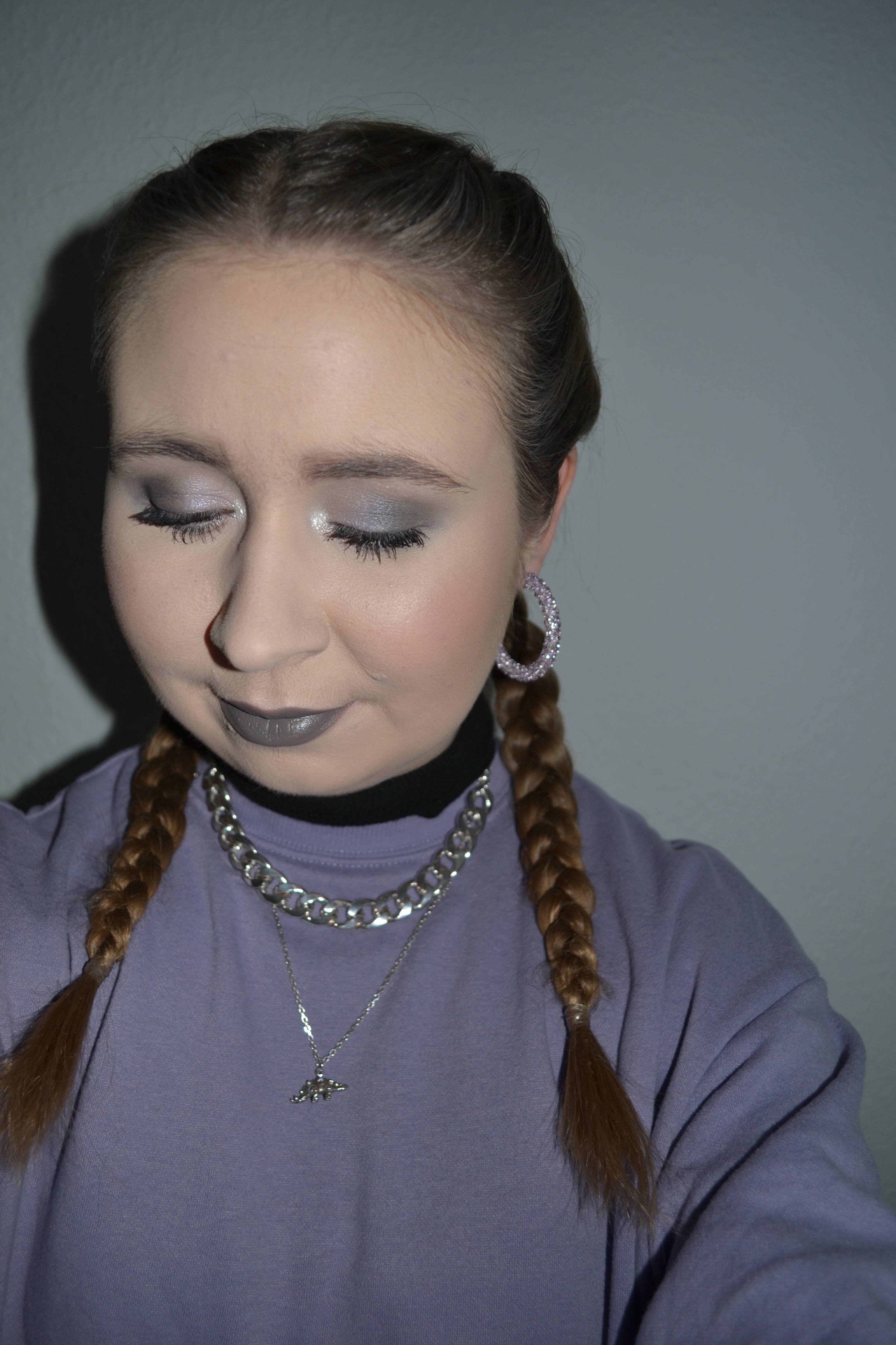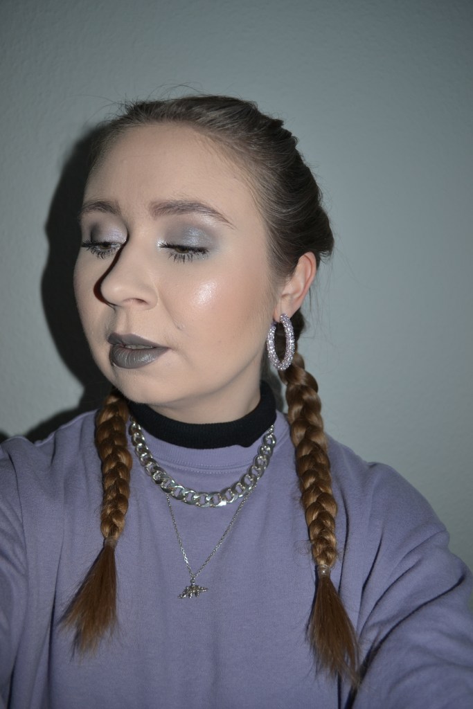 (Base: primer – e.l.f. Poreless Putty Primer, foundation – Maybelline Fit Me Matte + Poreless foundation (shade: 110 Porcelain), concealer – L’Oréal Infaillible More Than Concealer (shade: 322 Ivory), powders – e.l.f. HD Undereye setting powder in Sheer + Rimmel Clear Complexion Clarifying powder in 021 Transparent. Bronzer – Milani Silky Matte Bronzing powder in Sun Light, blusher – MAC Prism powder blush, highlighter – Sleek Highlighting palette in Solstice (shade: Hemisphere). Eye make-up: base – MAC Pro Longwear Paint Pot in Painterly, eyeshadows – Jeffree Star Cremated palette (shades: Casket Ready + Diamond Ashes) + Essence Hello New York eyeshadow palette 03 (shades: 2. + 3. + 4. + 5. shade 1. row), mascara – L’Oréal Lash Paradise mascara, eyeliner – MAC Dual Powerprint eye pencil (shade: Be Cool Bb). Eyebrows: Maybelline Brow Ultra Slim pencil in Medium Brown + e.l.f. Clear Brow & Lash Mascara. Lips: Essence Invisible Kiss transparent lipliner in 01 Multitalent Wonder + Jeffree Star Velvet Trap lipstick in Drill Sergeant)