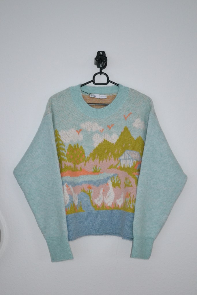 I have one more Zara piece to show you. There was just something about this idyllic nature print and the pastel colours that drew me to this jumper, and so far I’ve had a lot of fun styling it.