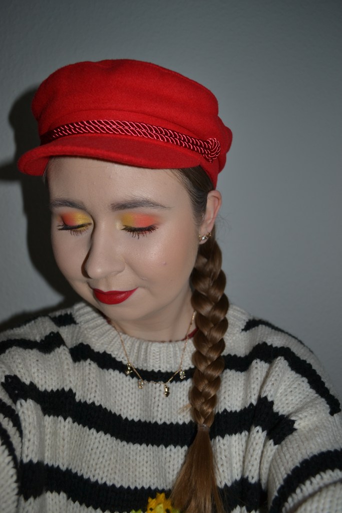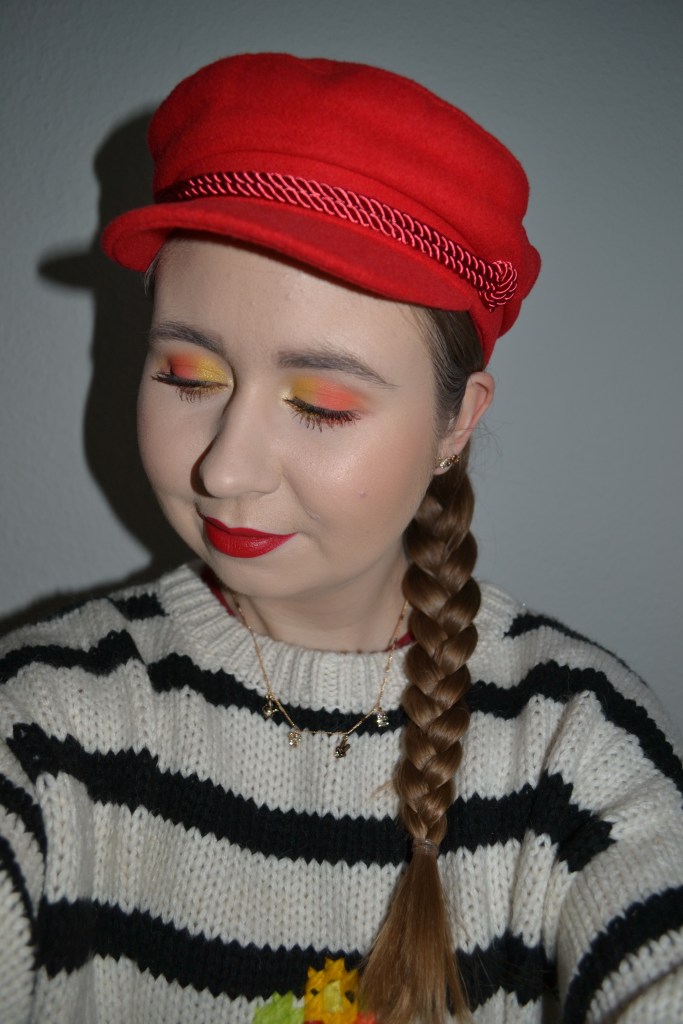 (Base: primer – Wet n Wild Prime Focus Primer Serum, foundation – Maybelline Dream Urban Cover foundation (shade: 100 Warm Ivory), concealers – L’Oréal Infaillible More Than Concealer (shade: 322 Ivory) + Maybelline Fit Me concealer (shade: 05), powders – e.l.f. HD Undereye setting powder in Sheer + Rimmel Clear Complexion Clarifying powder in 021 Transparent. Face make-up: bronzer – Maybelline City Bronzer in 100 Light Cool, blusher – MAC Good Health, Great Wealth powder blush duo (shade: Modern Mandarin), highlighter – MAC Extra Dimension Skinfinish in Postmodernist Peach. Eye make-up: base – MAC Pro Longwear Paint Pot in Painterly, eyeshadows – Jeffree Star Jawbreaker palette (shades: Virgin + Lemon Drop + Jawbreaker) + Jeffree Star Mini Breaker palette (shade: Orange Crush) + MAC Goldenrod eyeshadow, mascara – L’Oréal Air Volume Mega mascara, eyeliners – NYX Vivid Brights eyeliner in She Bang + NYX Epic Wear Liner Stick in Cosmic Yellow. Eyebrows: Maybelline Brow Ultra Slim pencil in Medium Brown + e.l.f. Clear Brow & Lash Mascara. Lips: Gosh Velvet Touch lipliner in 004 Simply Red + Jeffree Star Velvet Trap lipstick in The Perfect Red)
