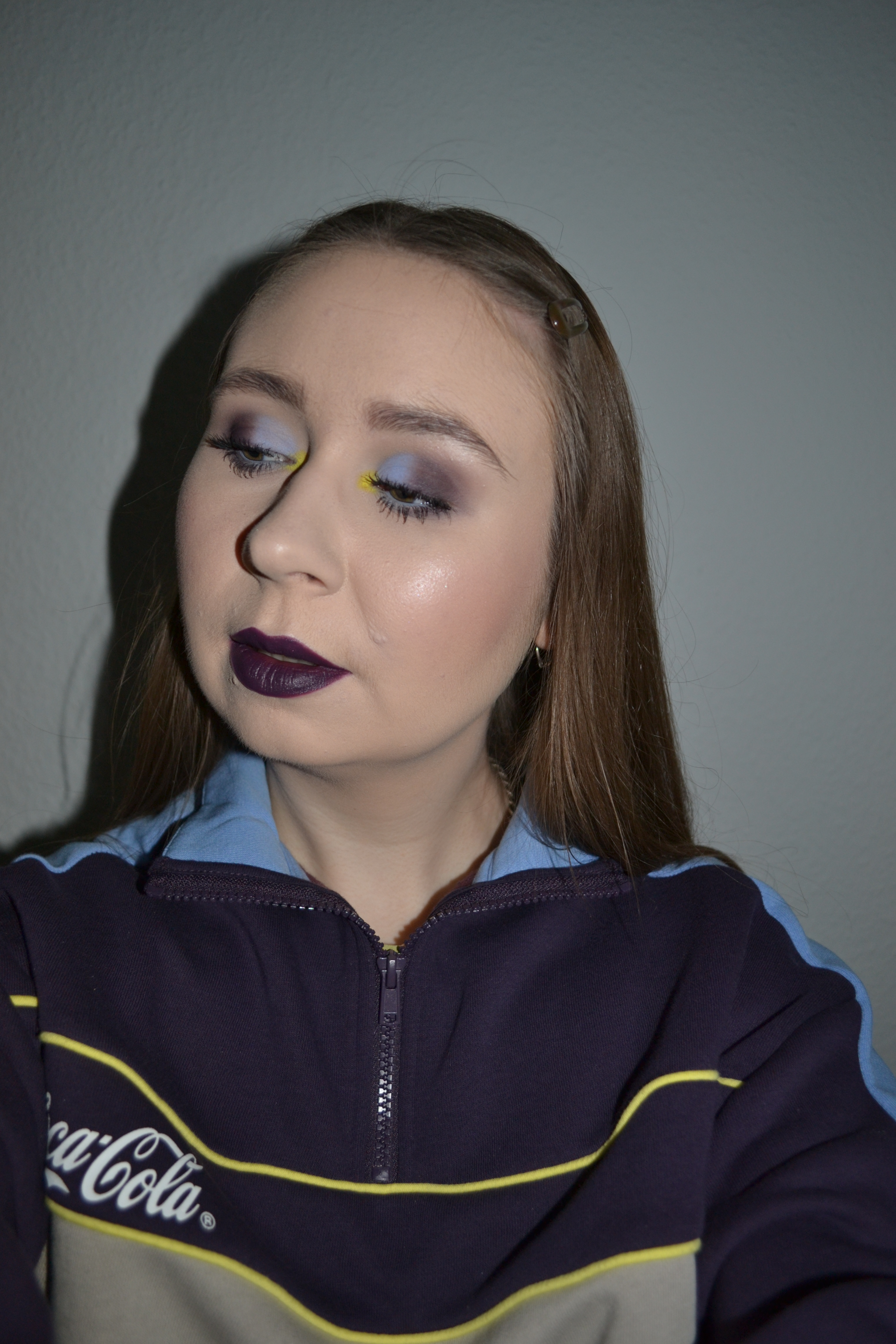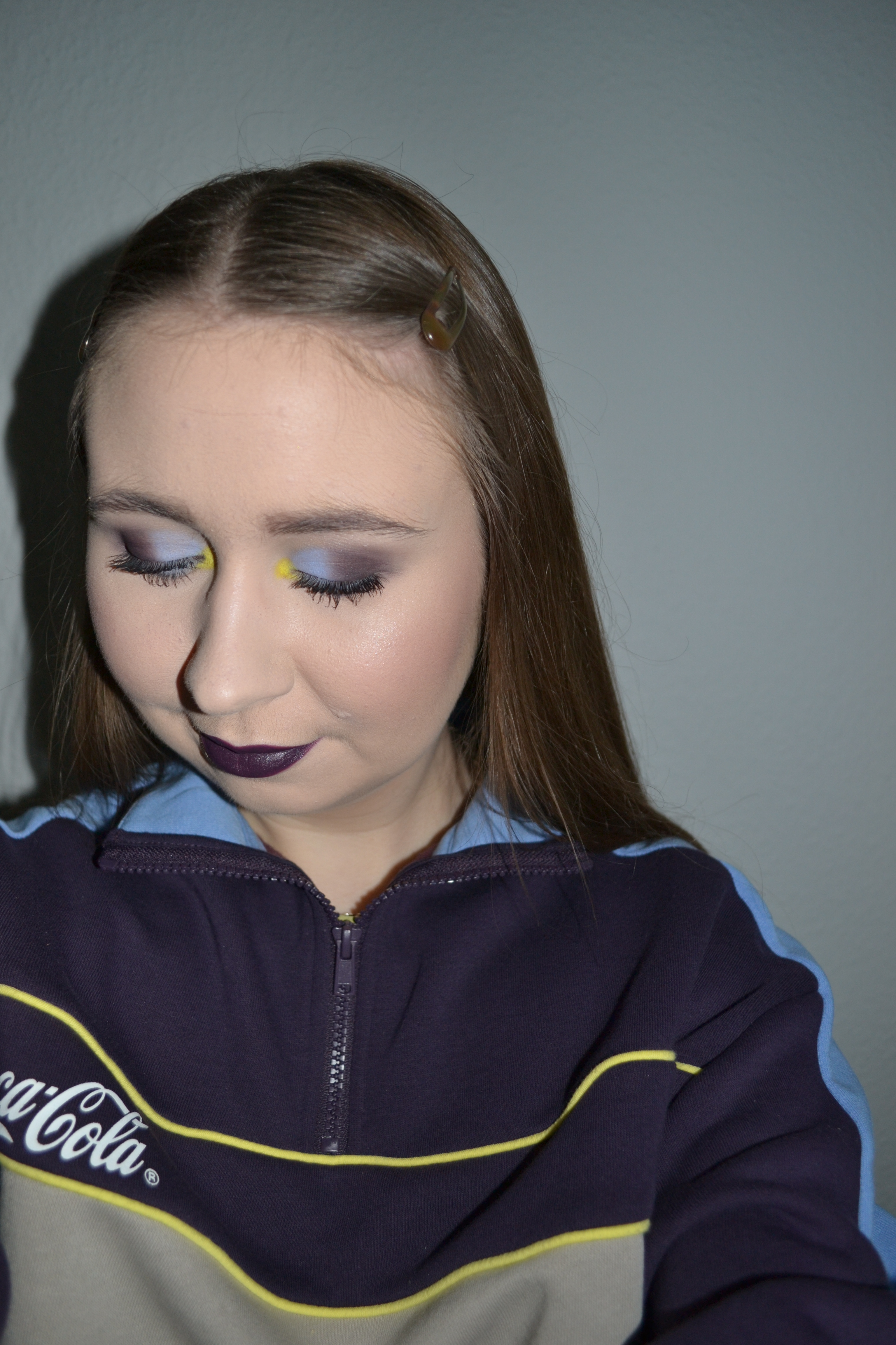 Here’s the make-up I wore with this outfit. I’ve never paired together these colours for a make-up look before, but they’re obviously matching my sweatsuit, and I think it’s such an unusual and fun colour scheme.