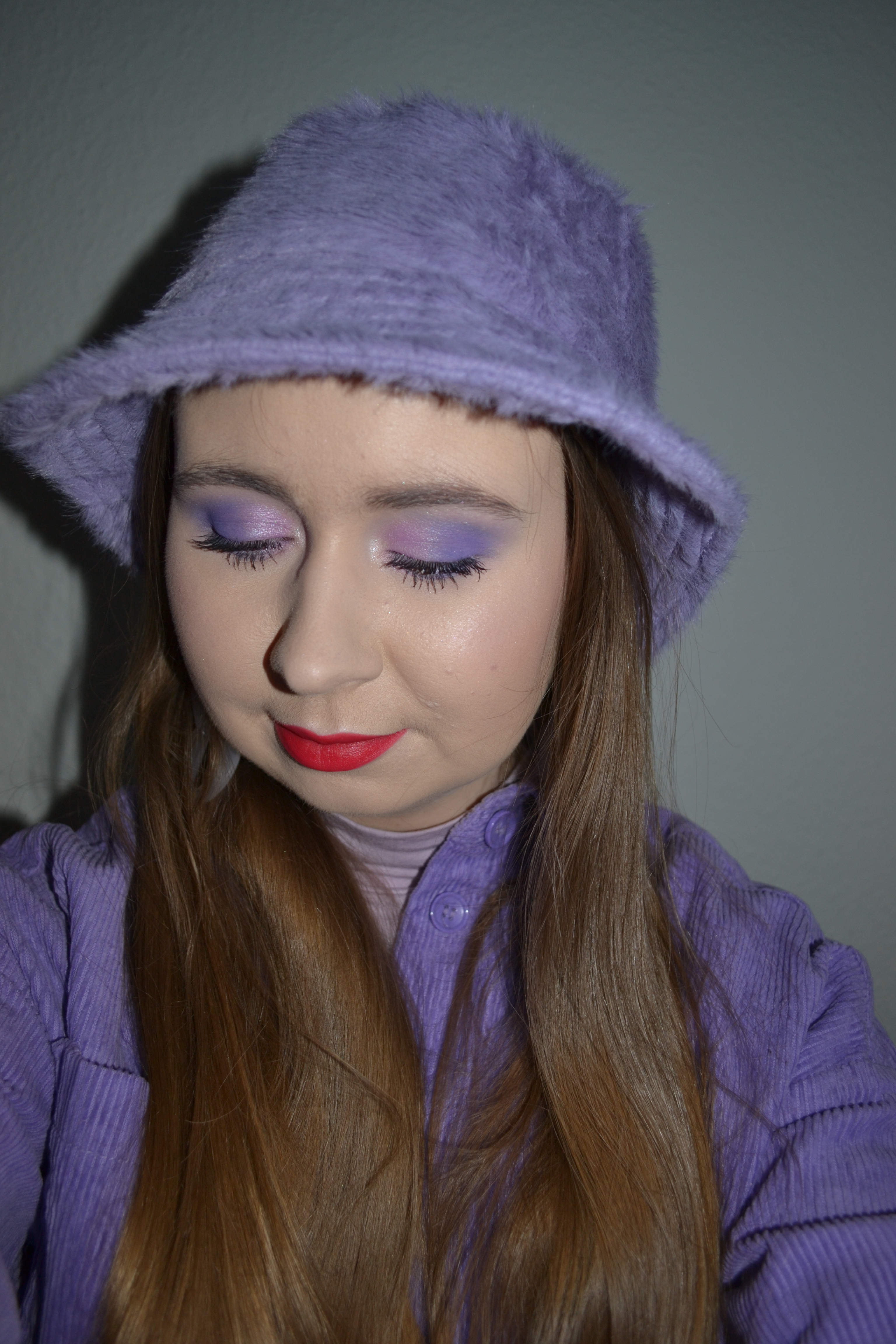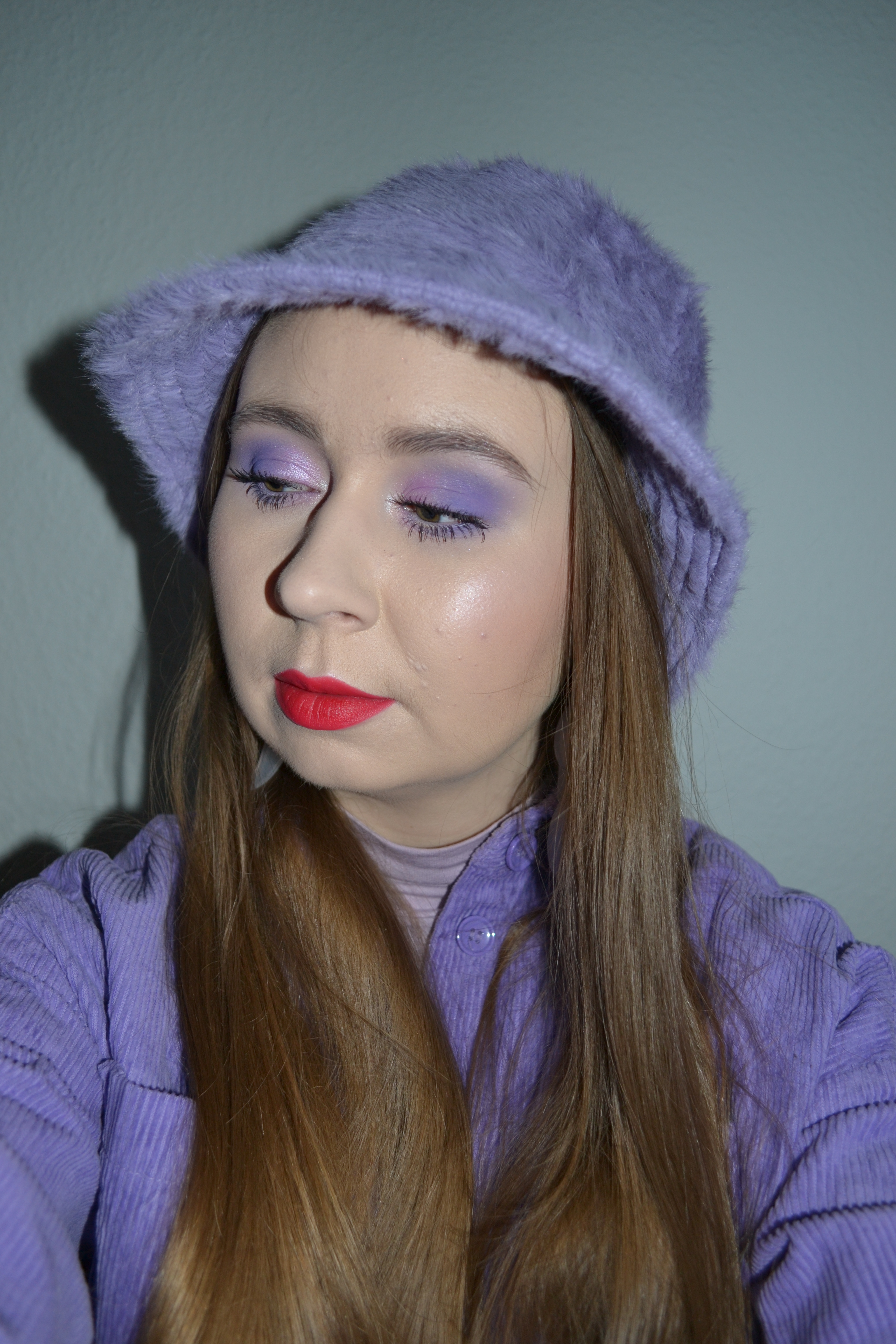 Here’s the make-up I wore with this outfit. I love a purple eye look, and I love a red lip, and I love them together.