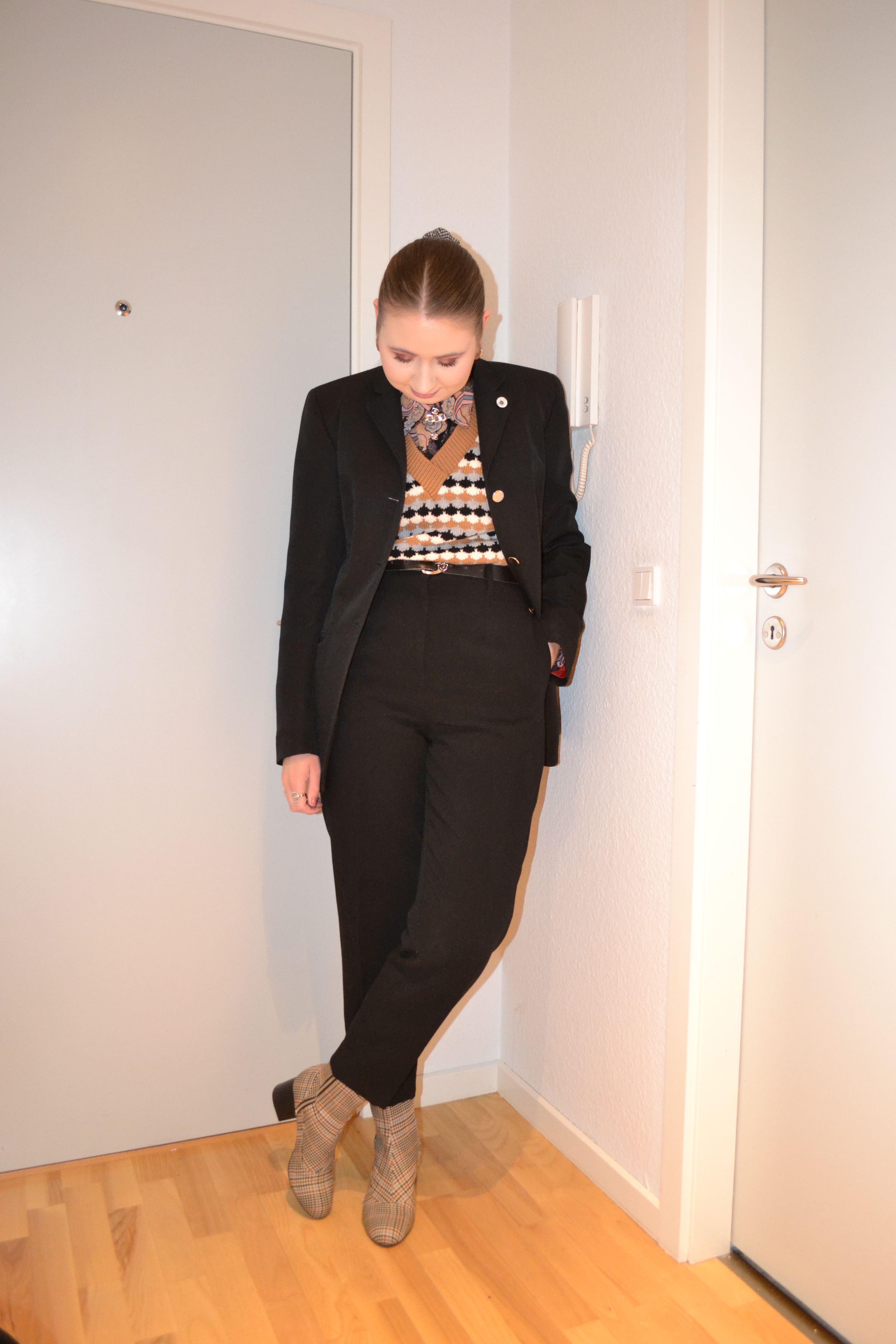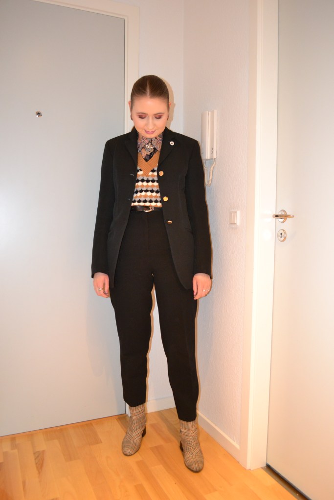 (Blazer + shirt + belt – second hand, sweater vest – Stradivarius, trousers – H&M, boots – Monki)