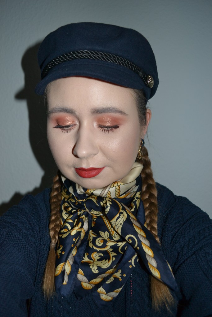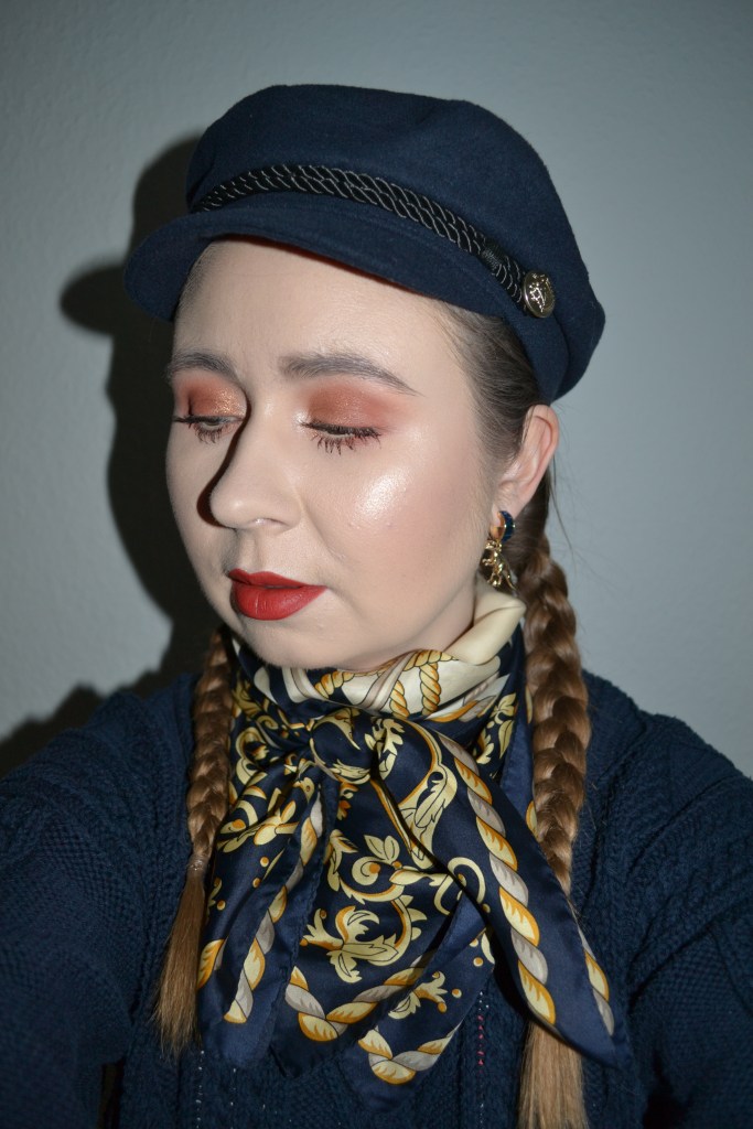 (Base: primer – Essence MY POWER IS Fire Hydrate & Prime Mist in 03 I’m On Fire!, foundation – Maybelline Dream Urban Cover foundation (shade: 100 Warm Ivory), concealer – L’Oréal Infaillible More Than Concealer (shade: 322 Ivory), powders – e.l.f. HD Undereye setting powder in Sheer + Jeffree Star Magic Star Setting Powder in Fair. Face make-up: bronzer – MAC Radiant Matte bronzing powder (shade: Beige-ing Beauty), blusher – Dior Backstage Glow Face Palette in 001 Universal (shade: Blush Bronze), highlighters – Dior Backstage Glow Face Palette in 001 Universal (shades: Strobe White + Strobe Gold). Eye make-up: base – MAC Pro Longwear Paint Pot in Painterly, eyeshadows – BH Cosmetics Naughty shadow palette (shades: Meringue + Secret Santa + Yuletide + Decked Out + Snow Day + Cheers), mascara – L’Oréal Air Volume Mega mascara, eyeliner – MAC Studio Chromagraphic pencil in NC15/NW20. Eyebrows: Maybelline Brow Ultra Slim pencil in Medium Brown + e.l.f. Clear Brow & Lash Mascara. Lips: Jeffree Star Velour lip liner in Allegedly + MAC Powder Kiss lipstick in Devoted To Chili)