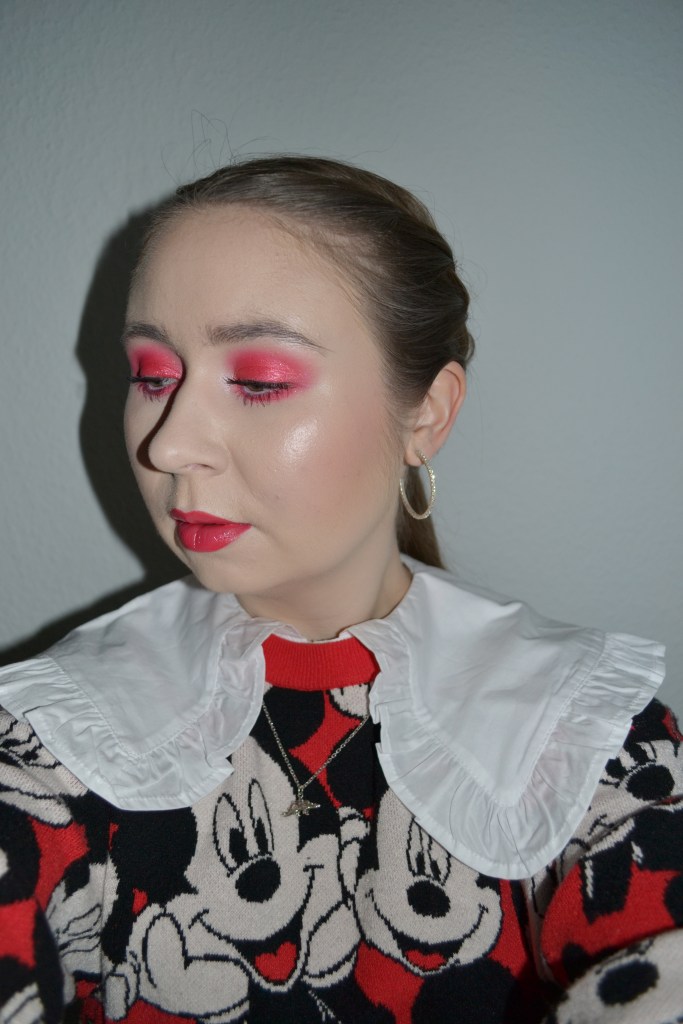 Here’s the make-up I wore with this outfit. You have probably noticed how much I love a monochromatic make-up look, and this shimmery, glossy red one is so pretty.