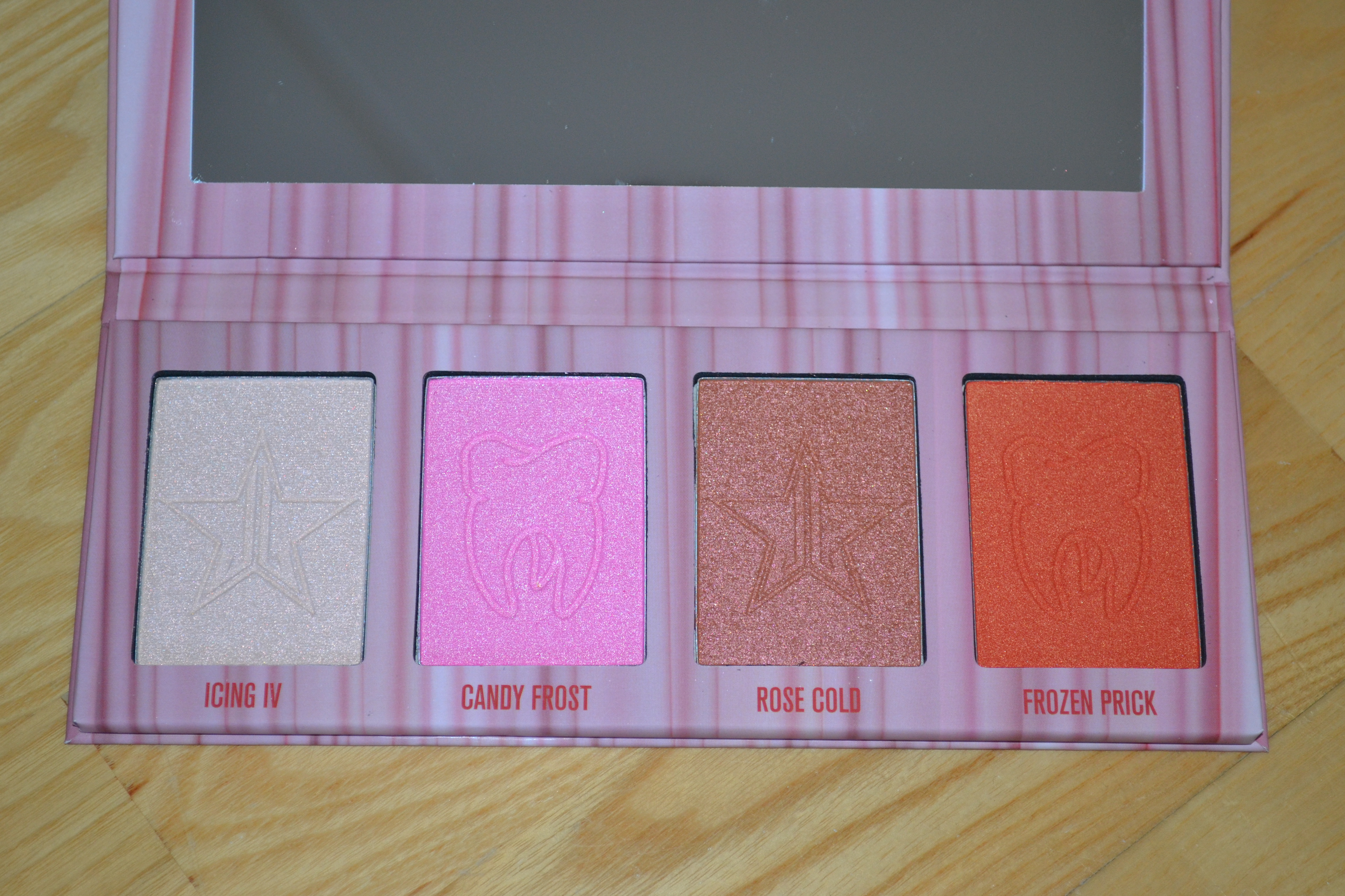 Jeffree Star released a Blood Sugar anniversary collection in late February I think, and the only thing I purchased from the collection was the Cavity Skin Frost highlighter palette. The first two shades, Icing IV and Candy Frost, are absolutely stunning; I wore Candy Frost last week, and it has the most stunning gold shift to it that doesn’t really show in the pan. Rose Cold and Frozen Prick will probably be too dark on me, but they sure are fun shades.