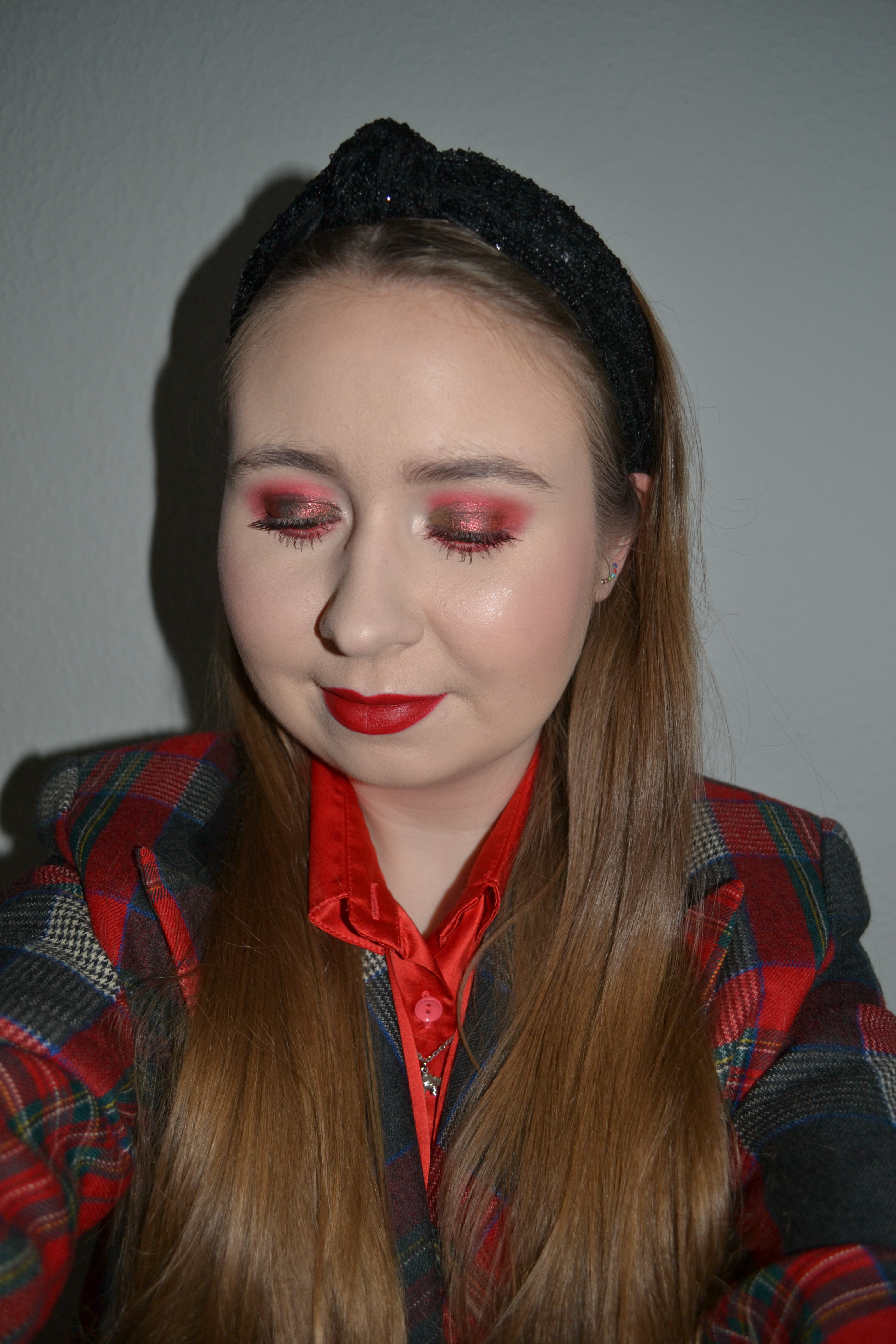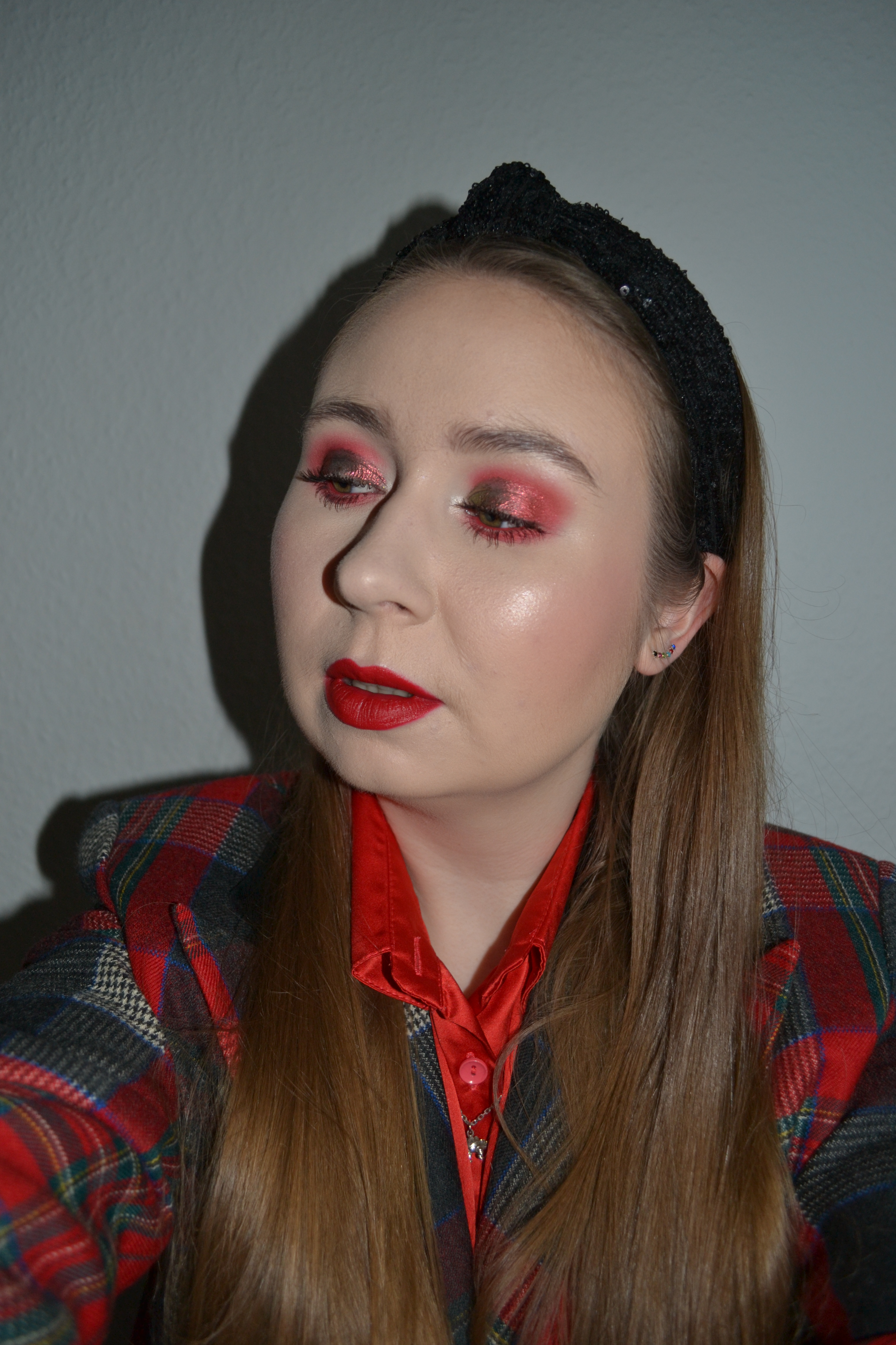 (Base: primer – e.l.f. Poreless Putty Primer, foundation – Maybelline Fit Me Matte + Poreless foundation (shade: 110 Porcelain), concealer – L’Oréal Infaillible More Than Concealer (shade: 322 Ivory), powders – Essence Brighten Up! Banana powder in 10 Bababanana + Jeffree Star Magic Star Setting Powder in Fair. Face make-up: bronzer – MAC Radiant Matte bronzing powder (shade: Beige-ing Beauty), blusher – BH Cosmetics Truffle Blush palette in Chocolate Cherry (1. shade bottom row – red shade), highlighter – NABLA Skin Glazing in Ozone. Eye make-up: base – MAC Pro Longwear Paint Pot in Painterly, eyeshadows – Jeffree Star Blood Sugar palette (shades: Glucose + Cherry Soda + Blood Sugar) + Natasha Denona Chromium liquid eyeshadow in Dogbane + MAC Nylon eyeshadow, mascara – Maybelline Lash Sensational Sky High mascara, eyeliner – NYX Vivid Brights eyeliner in Snatched. Eyebrows: Maybelline Brow Ultra Slim pencil in Medium Brown + MAC Brow Set in Clear. Lips: Gosh Velvet Touch lipliner in 004 Simply Red + MAC Moody Bloom lipstick)