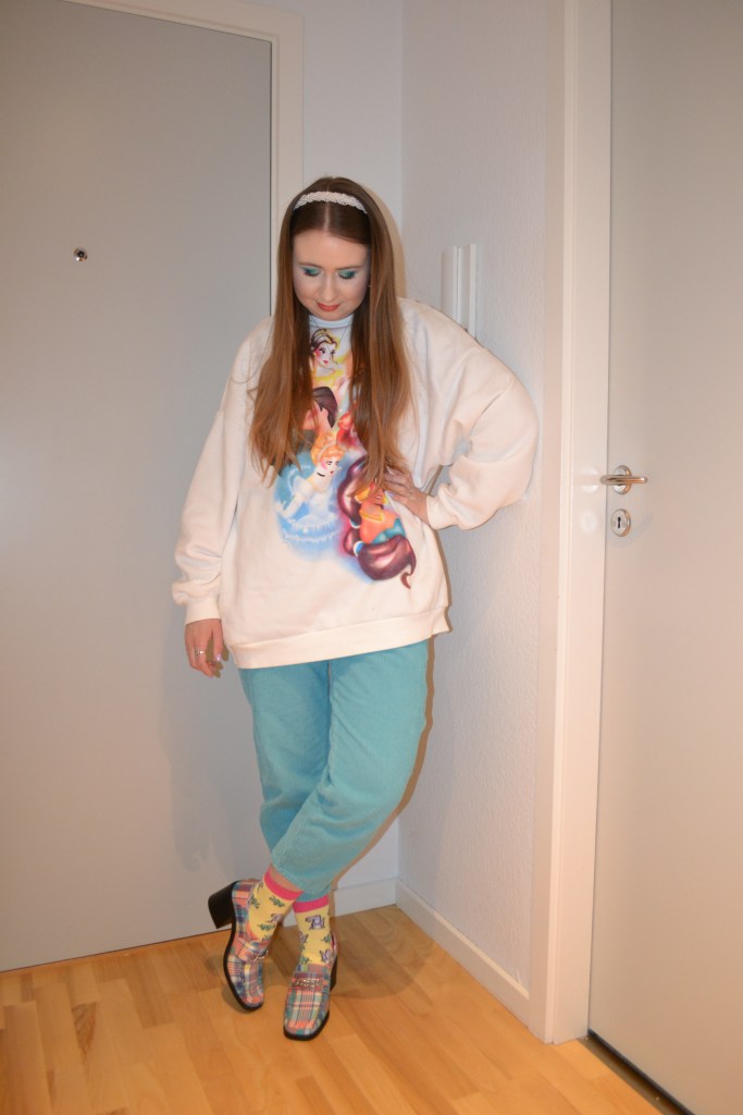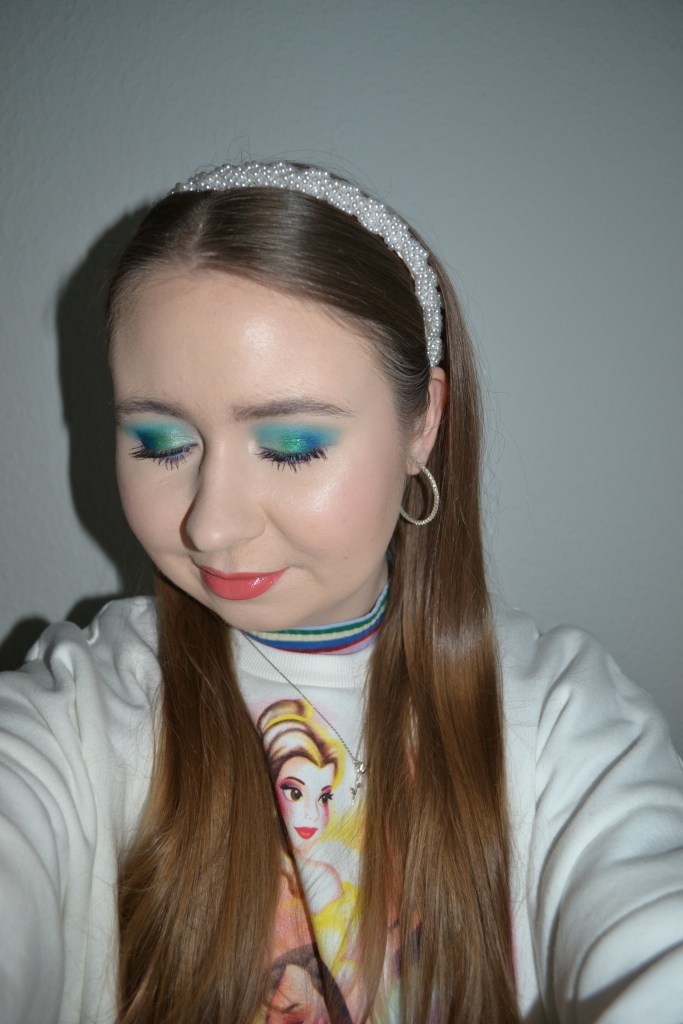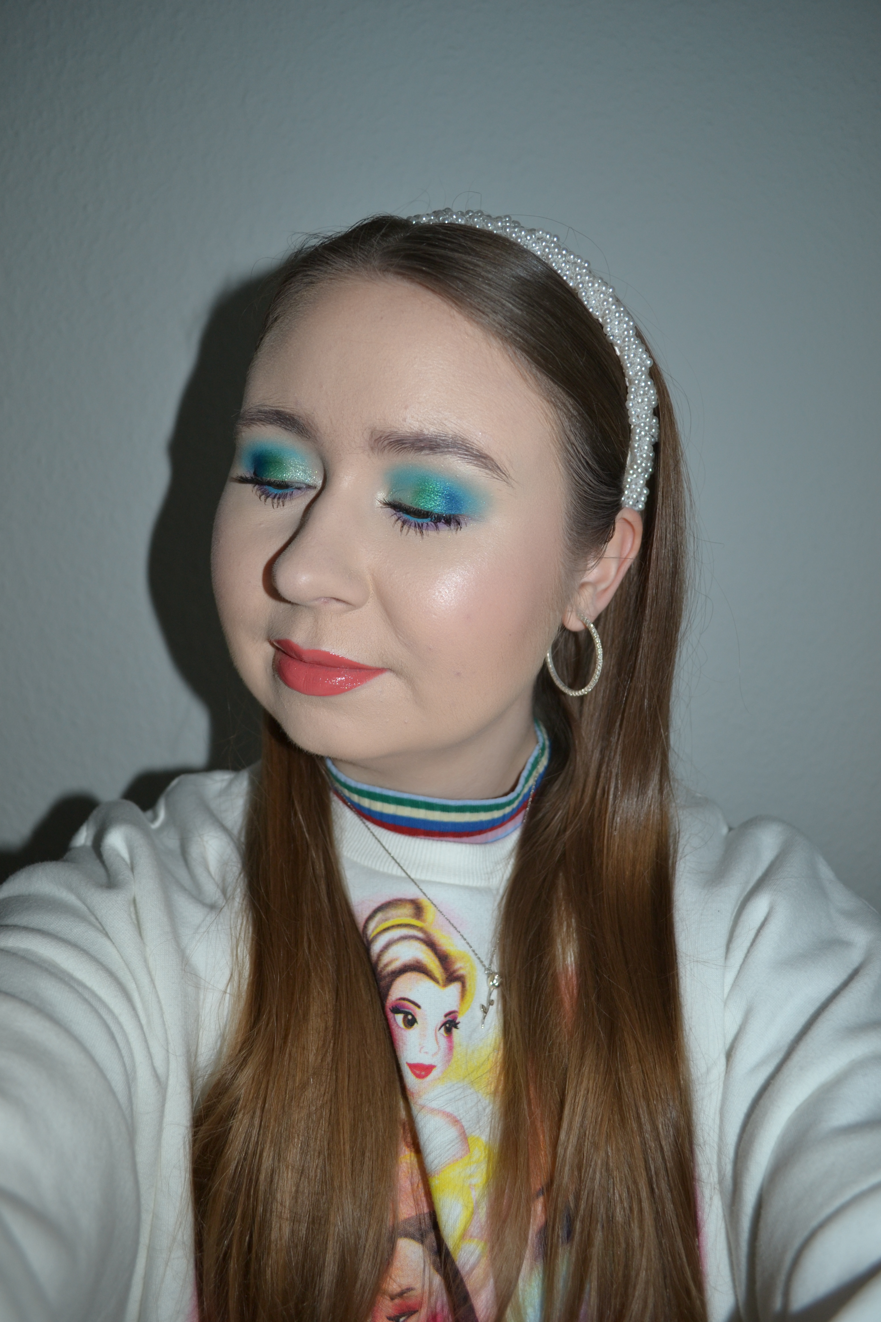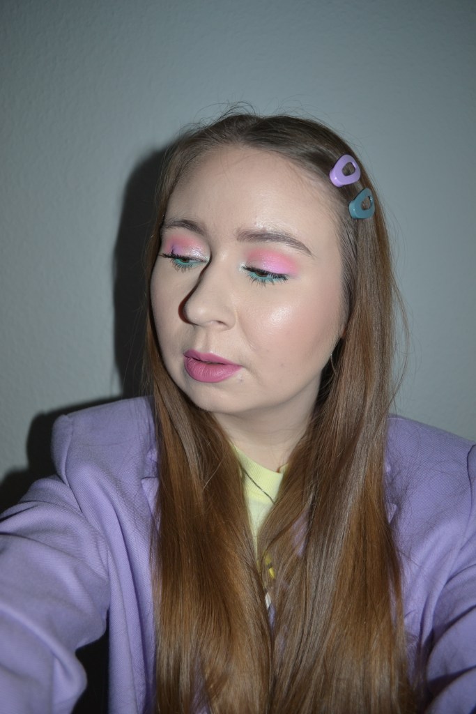 (Base: primer – Essence Prime+ Studio Hydrating + Skin Refreshing primer, foundation – Maybelline Dream Urban Cover foundation (shade: 100 Warm Ivory), concealer – L’Oréal Infaillible More Than Concealer (shade: 322 Ivory), powders – Hourglass Ambient Lighting Ethereal Edit palette (shade: Etherial Light) + Rimmel Clear Complexion Clarifying powder in 021 Transparent. Face make-up: bronzer – MAC Radiant Matte bronzing powder (shade: Beige-ing Beauty), blusher – MAC Extra Dimension blush in Look, Don’t Touch!, highlighter – Soda #babygethigher Pressed Highlighter in 102. Eye make-up: base – MAC Pro Longwear Paint Pot in Painterly, eyeshadows – Essence eyeshadow in 05 Granny Pants + Natasha Denona Mini Tropic palette (shades: Laguna + Tiger Lily + Exotic + Mint Frost + Zena) + MAC Nylon eyeshadow, mascara – Maybelline Lash Sensational Sky High mascara, eyeliner – LA Girl Shockwave Neon Liner (shade: Electric). Eyebrows: Maybelline Brow Ultra Slim pencil in Medium Brown + MAC Brow Set in Clear. Lips: MAC Fruit Cocktail lip pencil + MAC Sugar Sweet Cameo lipstick + Fenty Beauty Gloss Bomb in Taffy Tea$e)
