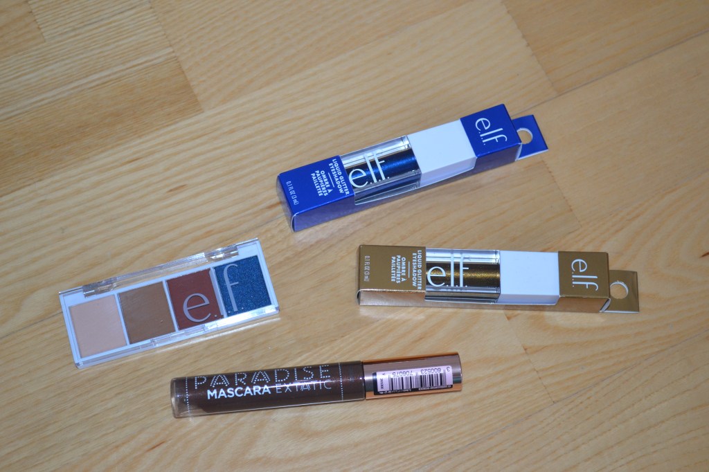 I got an eyeshadow quad and two liquid eyeshadows from e.l.f. and a mascara from L’Oréal.