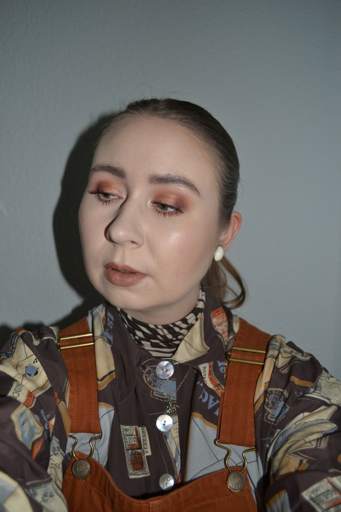 (Base: primers – Wet n Wild Photofocus face primer matte + MAC Prep + Prime Natural Radiance Illuminating Base (shade: Radiant Yellow), foundation – Maybelline Dream Urban Cover foundation (shade: 100 Warm Ivory), concealers – L’Oréal Infaillible More Than Concealer (shade: 322 Ivory) + Essence Camouflage+ Healthy Glow concealer in 10 Light Ivory, powders – Essence Brighten Up! Banana powder in 10 Bababanana + Rimmel Clear Complexion Clarifying powder in 021 Transparent. Face make-up: bronzer – Fenty Beauty Cheeks Out Freestyle cream bronzer in Butta Bisquit, blushers – MAC Glow Play blush in So Natural + Dior Backstage Glow Face Palette in 001 Universal (shade: Blush Bronze), highlighter – Dior Backstage Glow Face Palette in 001 Universal (shades: Strobe White + Strobe Gold). Eye make-up: base – MAC Pro Longwear Paint Pot in Painterly, eyeshadows – Essence eyeshadow in 05 Granny Pants + Natasha Denona Mini Nude palette (shades: Quoin + Soil + Sienna + Bronzage + Lumino), mascara – Maybelline Lash Sensational Sky High mascara, eyeliner – MAC Studio Chromagraphic pencil in NC15/NW20. Eyebrows: Essence Brow Pomade + Brush + MAC Brow Set in Clear. Lips: Essence Invisible Kiss transparent lipliner in 01 Multitalent Wonder + MAC Feeling Myself lipstick)