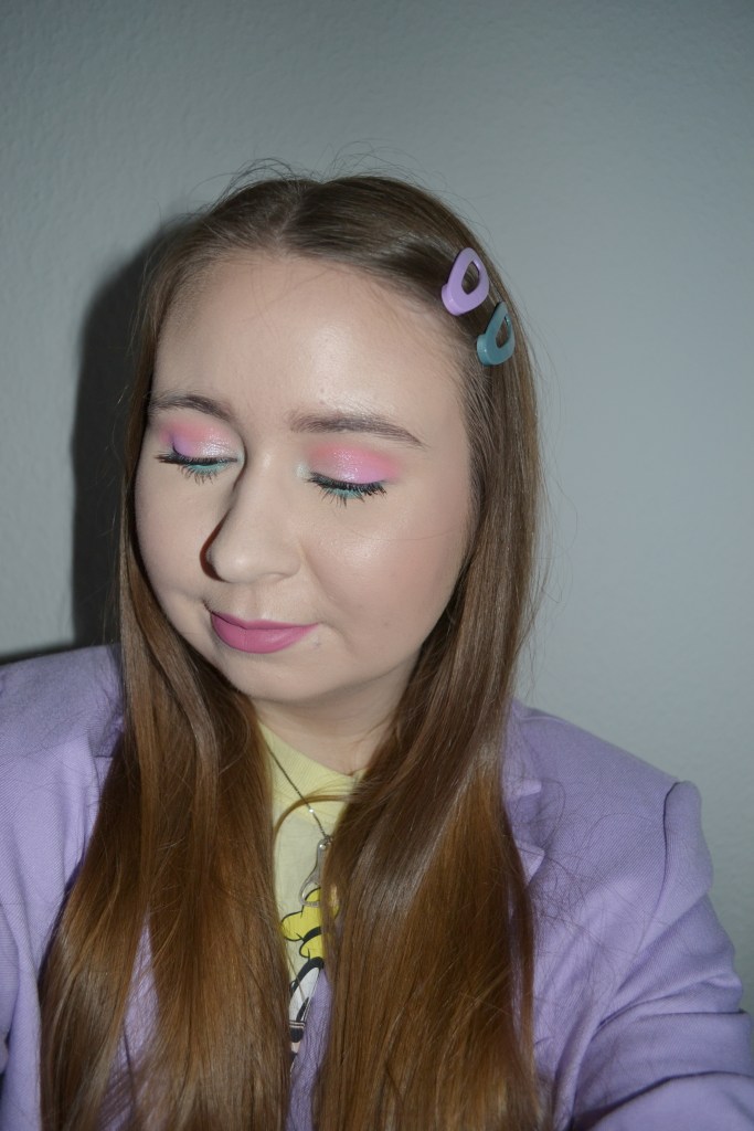 (Base: primer – NYX The Marshmellow Primer, foundation – Maybelline Dream Urban Cover foundation (shade: 100 Warm Ivory), concealer – L’Oréal Infaillible More Than Concealer (shade: 322 Ivory), powders – Essence Brighten Up! Banana powder in 10 Bababanana + Jeffree Star Magic Star Setting Powder in Fair. Face make-up: bronzer – Essence Hello, Good Stuff! matte & glow bronzer in 10 Cocoa-Cool, blusher – Clinique Cheek Pop blush in 08 Melon Pop, highlighter – Soda #babygethigher Pressed Highlighter in 102. Eye make-up: base – MAC Pro Longwear Paint Pot in Painterly, eyeshadows – BH Cosmetics Lost In Los Angeles palette (shades: The Abbey + WeHo + 90210 + The Hills + Lax + Rush Hour), mascara – Maybelline Lash Sensational Sky High mascara, eyeliner – LA Girl Shockwave Neon Liner (shade: Fresh). Eyebrows: Maybelline Brow Ultra Slim pencil in Medium Brown + MAC Brow Set in Clear. Lips: L.A. Girl Perfect Precision lip liner in Pinky + MAC Barbiestyle lipstick)