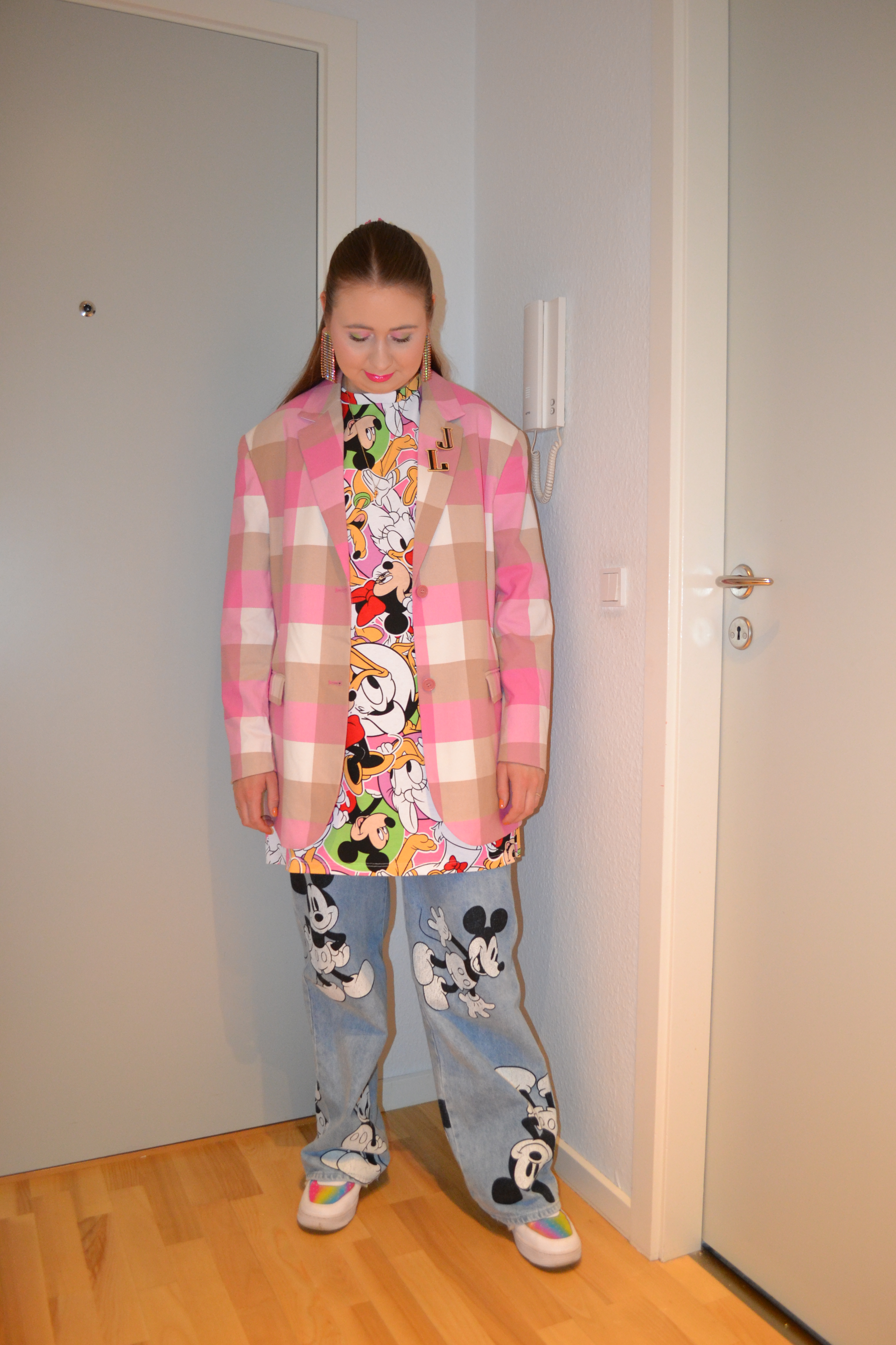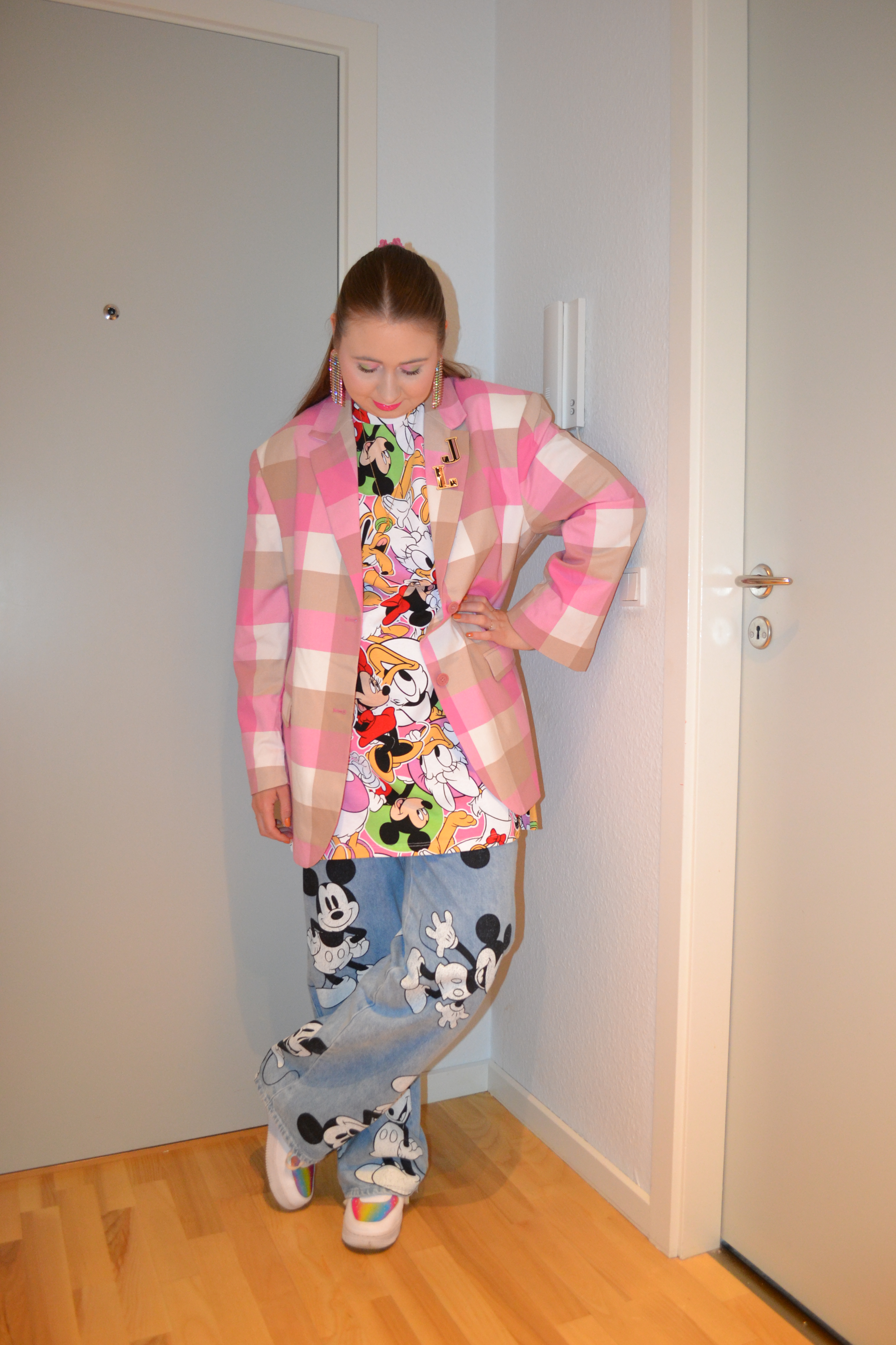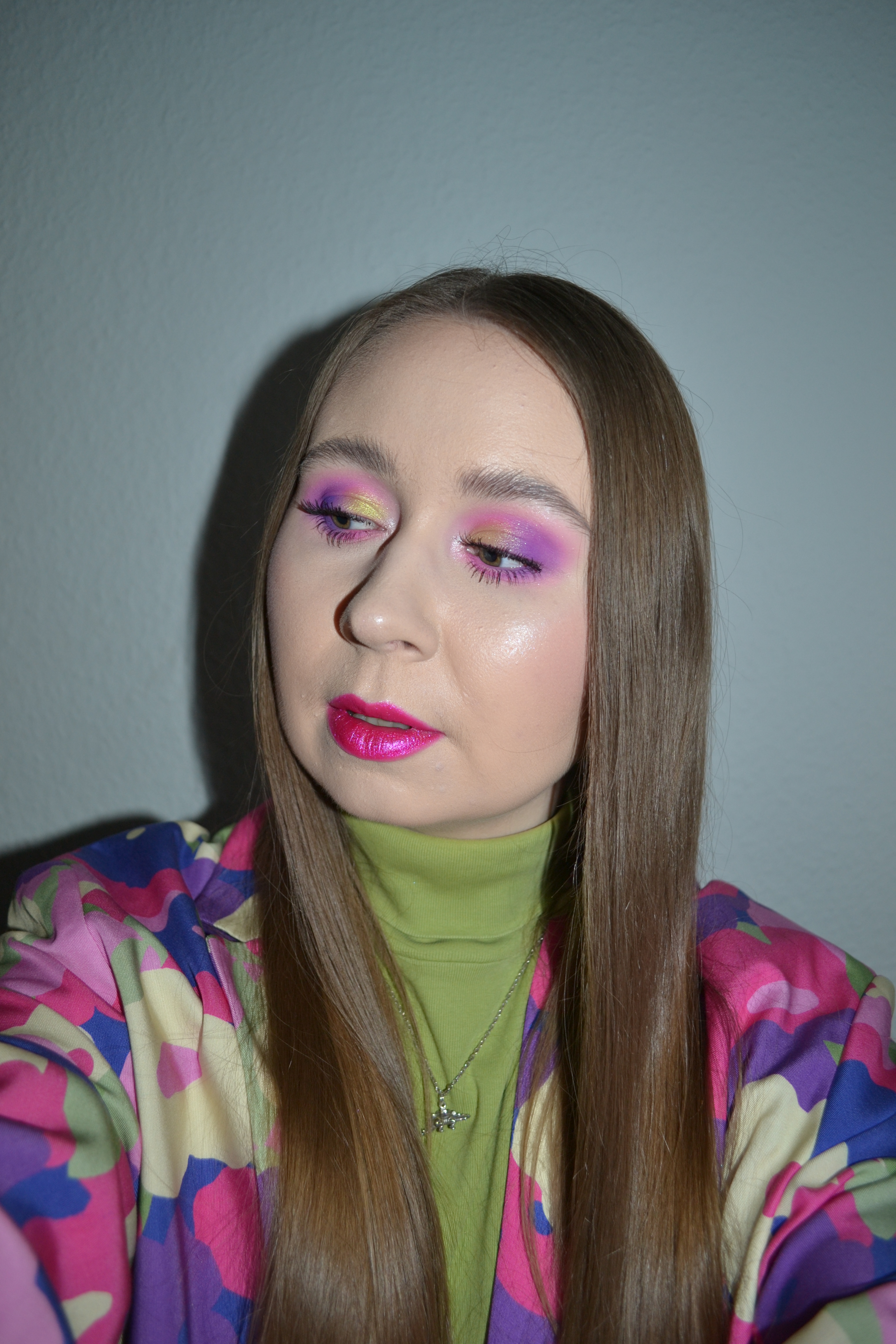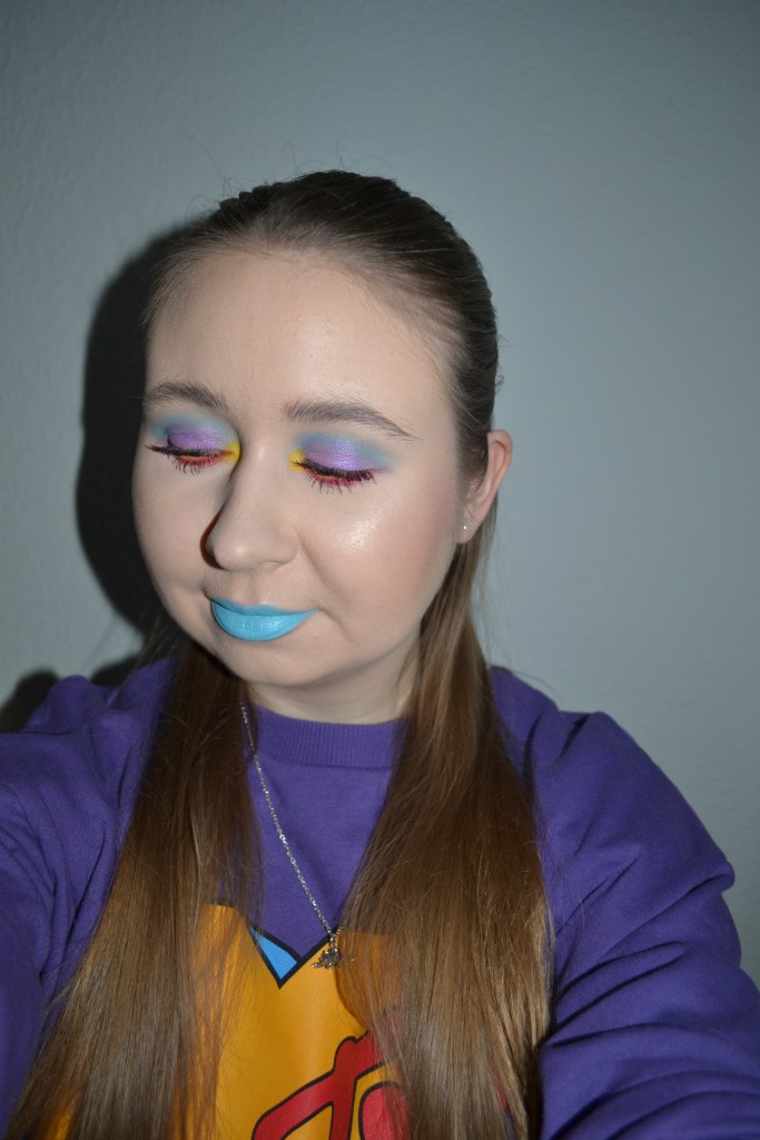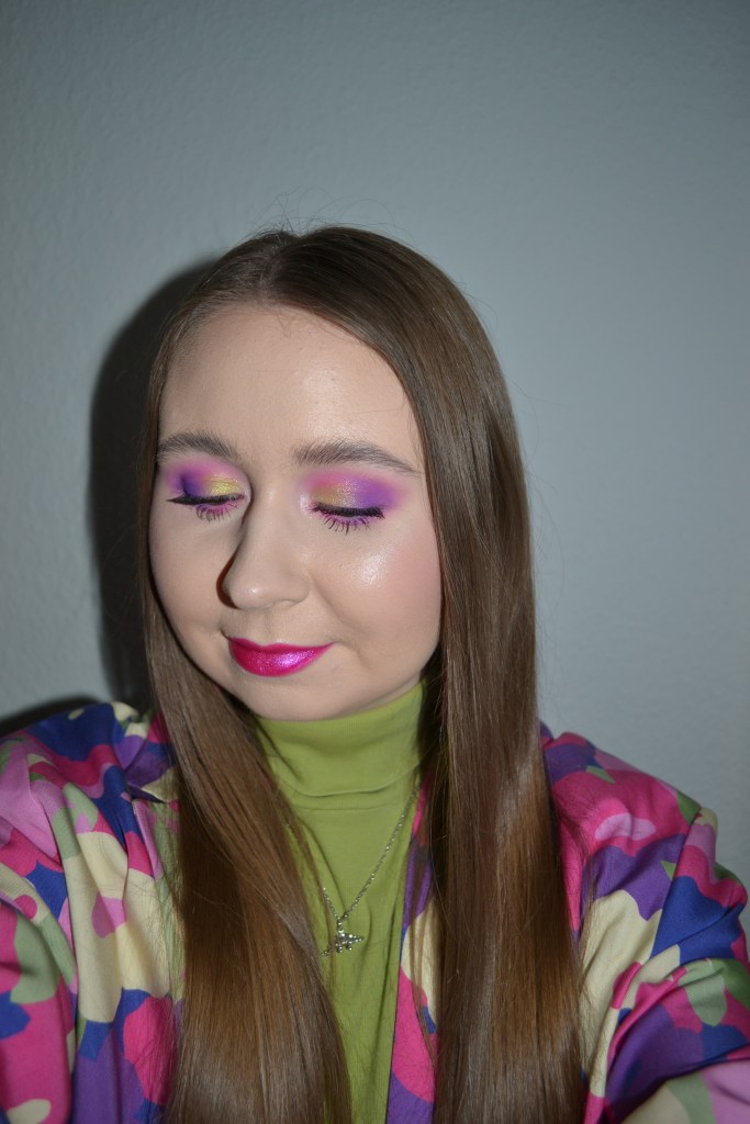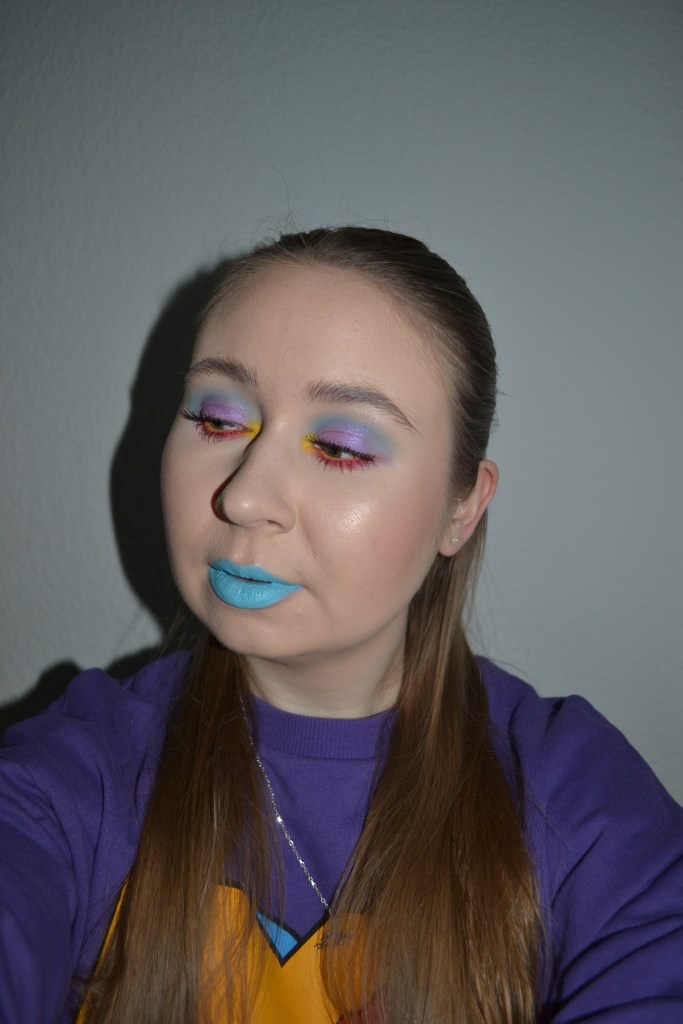 (Base: primers – Wet n Wild Photofocus face primer matte + MAC Strobe Cream (shade: Pinklite), foundation – Catrice HD Liquid Coverage foundation (shade: 005 Ivory Beige), concealers – Catrice Camouflage cream concealer (shade: 010 Ivory) + L’Oréal Infaillible More Than Concealer (shade: 322 Ivory), powders – e.l.f. HD Undereye setting powder in Sheer + Jeffree Star Magic Star Setting Powder in Fair. Face make-up: bronzer – The Balm Balm Desert bronzer/blush, blusher – MAC Undercover Heroine powder blush, highlighter – BH Cosmetics Aprés in Aspen highlighter palette (shades: Frosted AF + Chill Zone). Eye make-up: base – MAC Pro Longwear Paint Pot in Painterly, eyeshadows – Essence eyeshadow in 05 Granny Pants + BH Cosmetics Remix Dance 80’s eyeshadow palette (shades: Love Shack + Spin Me)+ BH Cosmetics Remix Dance 90’s eyeshadow palette (shades: Hit Me Baby + La Vida Loca + Supermodel), mascara – Maybelline Lash Sensational Sky High mascara, eyeliners – LA Girl Shockwave Neon Liner in Vivid + NYX Epic Wear Liner Stick in Pink Spirit. Eyebrows: Essence #pinkandproud Strong soapy brow styler (01 Stronger Than Yesterday!). Lips: NYX Suede Matte lip liner in Clinger + Essence #pinkandproud Not Sorry glitter lipstick in 01 Sorry, Not Sorry!)