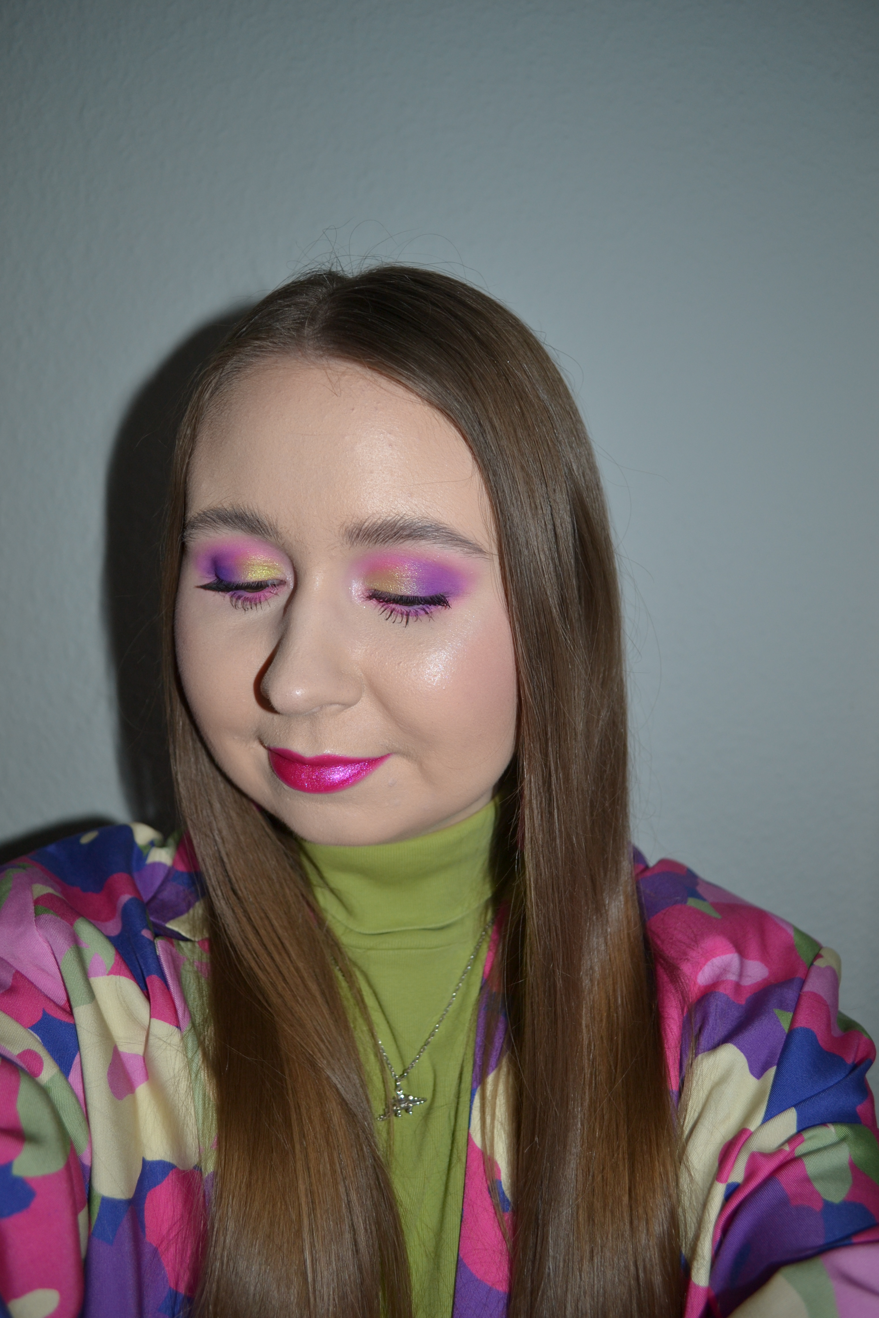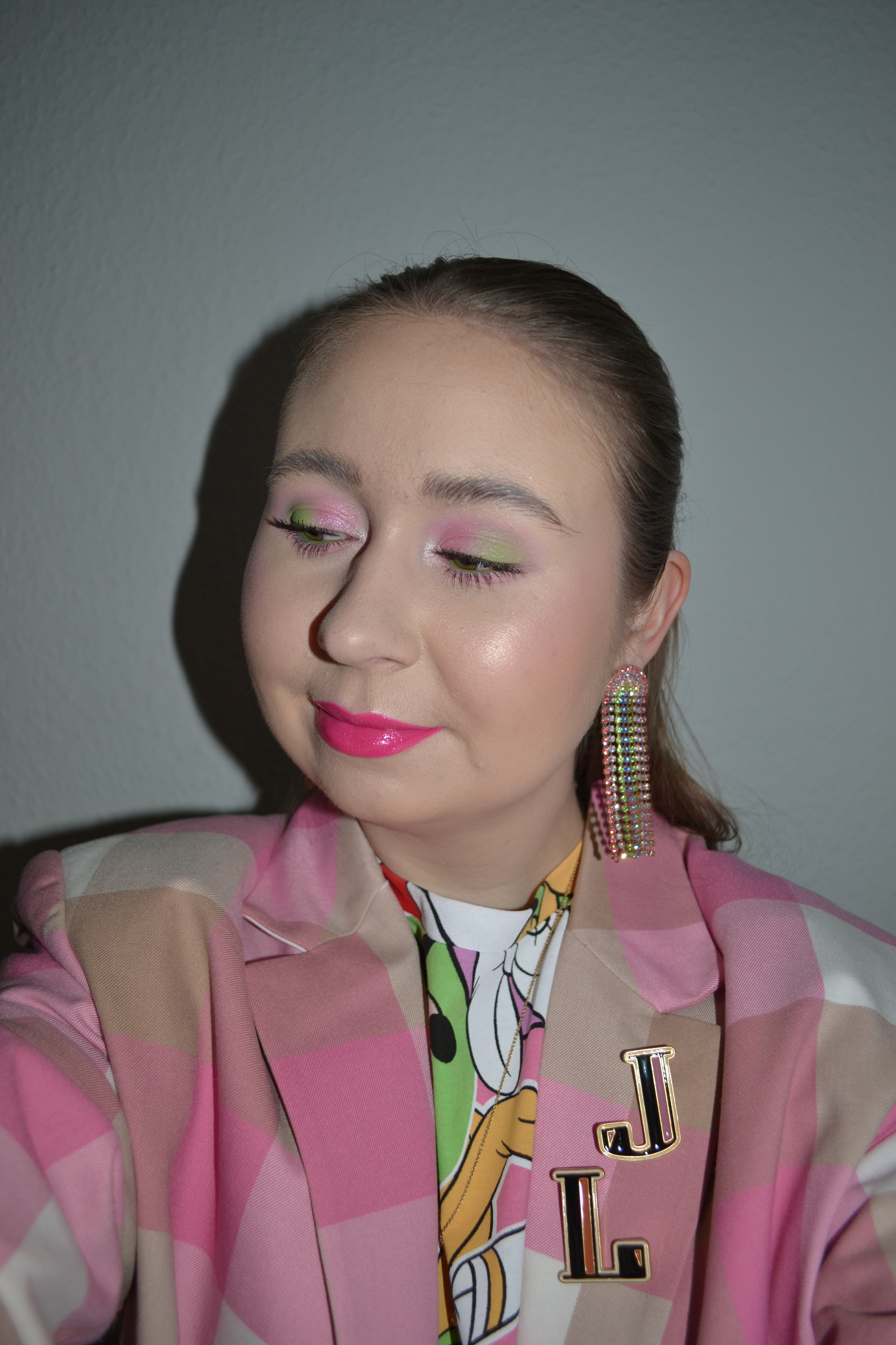 Here’s the make-up I wore with this outfit. The main colour in my outfit was pink, so I wanted that to be the main colour of my make-up look as well. I added a pop of green though as a contrasting colour to the pink.