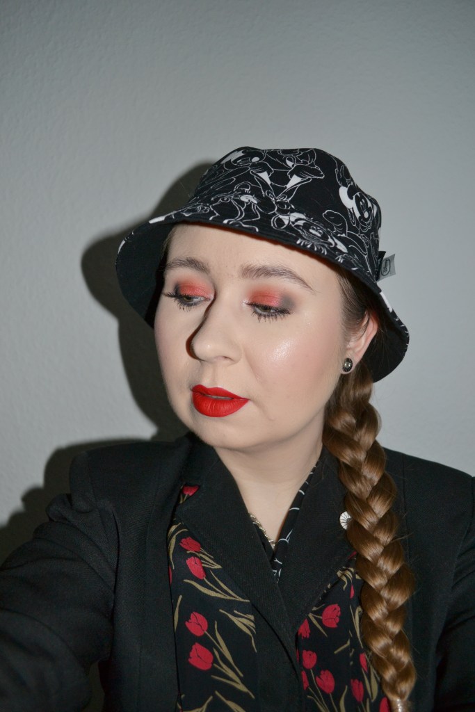 Here’s the make-up I wore with this outfit. As I mentioned in my outfit post, I wanted to wear some of the products from the MAC Cruella collection. I wore the eyeshadow palette, the eyeliner, and one of the Retro Matte liquid lip colours. I’m not sure how I feel about this particular eye look, but I really like the lipstick.
