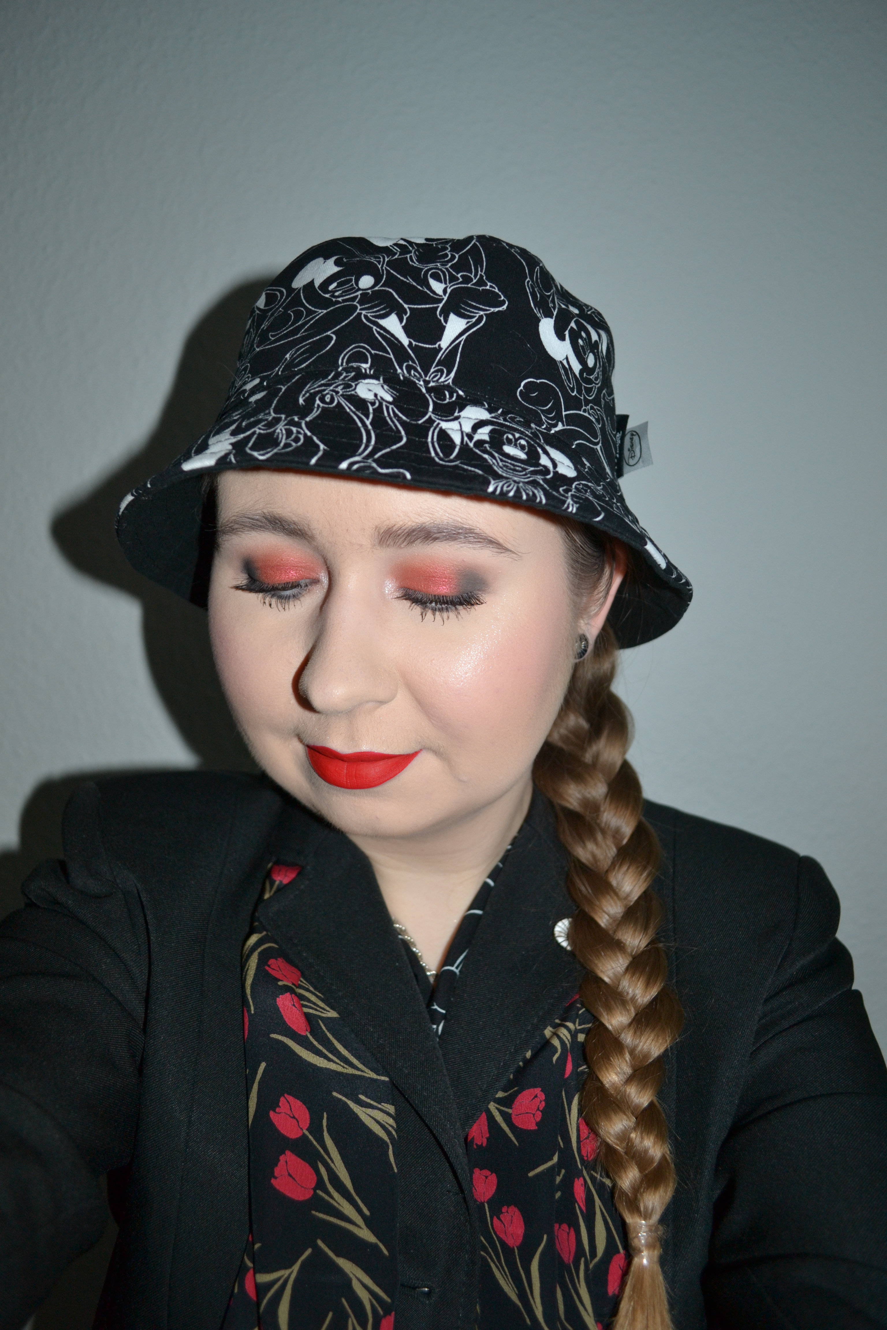 (Base: primer – Essence Prime+ Studio Poreless + Skin Blurring putty primer, foundation – Maybelline Fit Me Matte + Poreless foundation (shade: 110 Porcelain), concealers – e.l.f. 16HR Camo matte concealers (shades: Light Sand + Fair Warm), powders – Revolution Eye Bright setting powder + e.l.f Sheer Tint finishing powder in Fair/Light. Face make-up: bronzer – Benefit Hoola bronzer, blusher – MAC Apple Red powder blush, highlighter – e.l.f. Glow Gleam Beam highlighter palette in Light (shade: 1). Eye make-up: base – MAC Pro Longwear Paint Pot in Painterly, eyeshadows – MAC eyeshadow x8 palette: Cruella To Be Kind (shades: Gesso + Cruella To Be Kind + Crue Love + Sinister Shimmer + Carbon + De Villionaire), mascara – Essence Lash Princess False Lash Effect mascara, eyeliner – MAC Dual-Ended Pro Longwear eyeliner in De-Vinyl/Tightly Laced (both shades). Eyebrows: Maybelline Brow Ultra Slim pencil in Medium Brown + MAC Brow Set in Clear. Lips: MAC Retro Matte liquid lip colour in Mayhemmed)