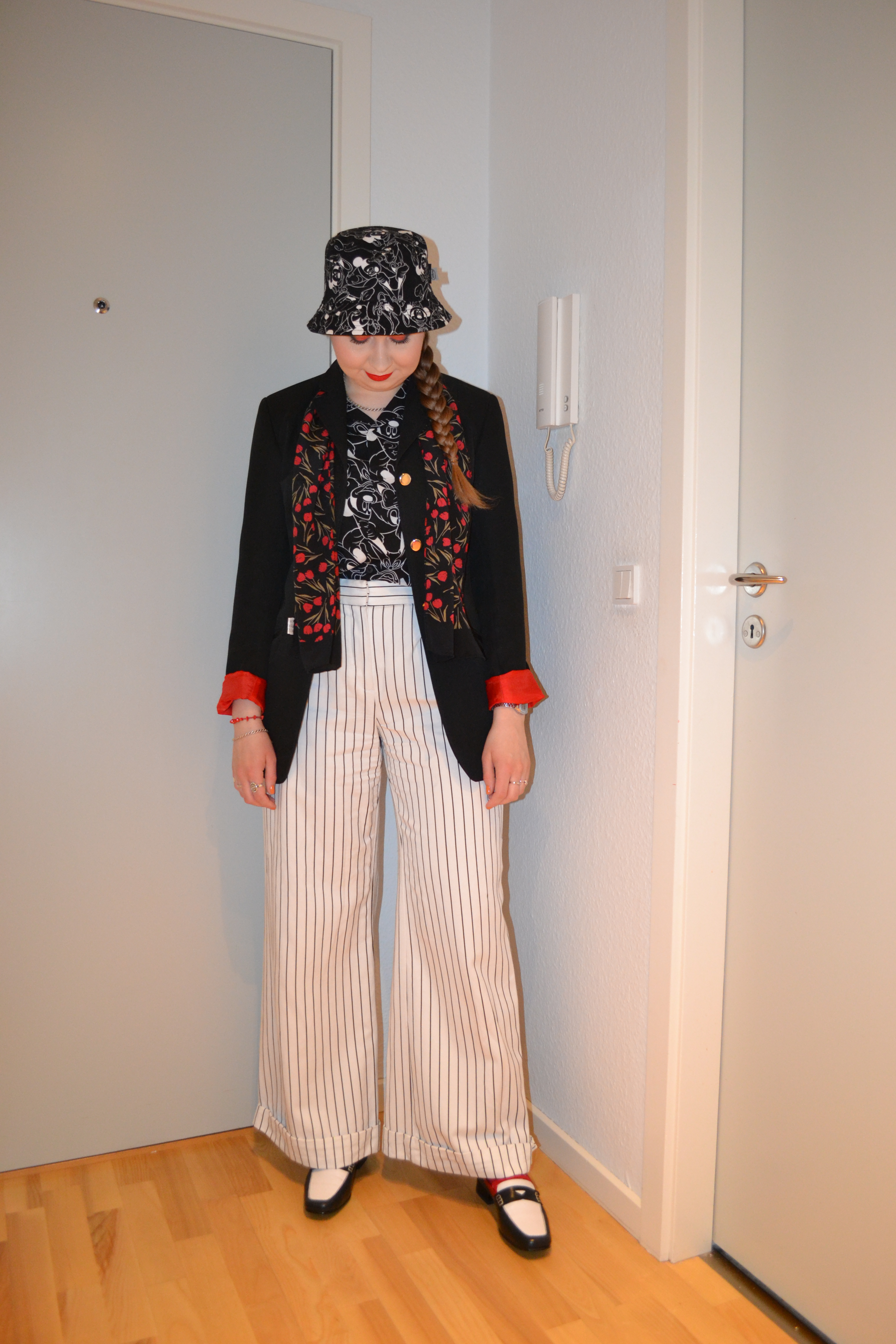 (Bucket hat + shirt + socks – H&M, blazer + scarf + loafers – second hand, trousers – Monki)