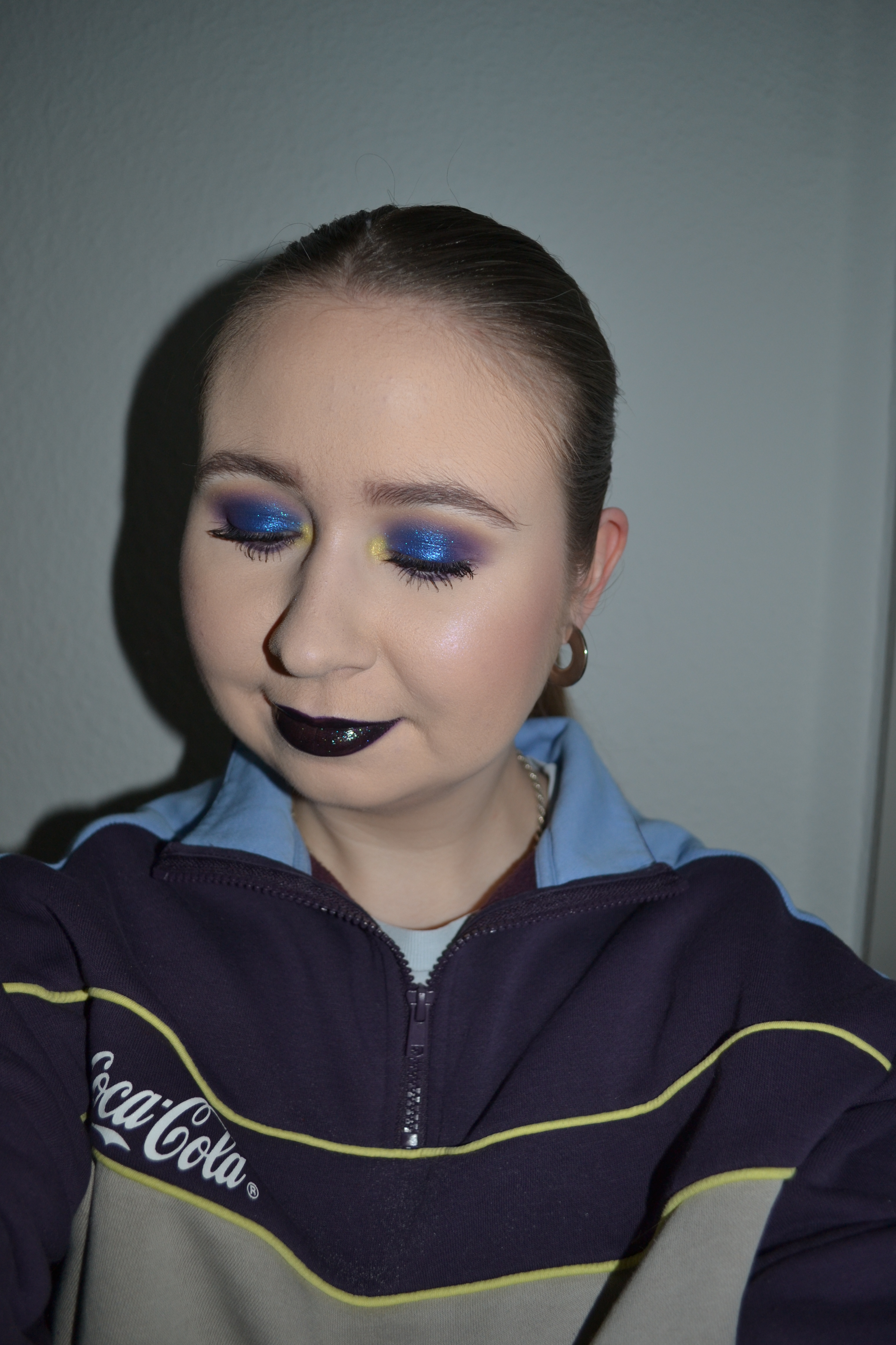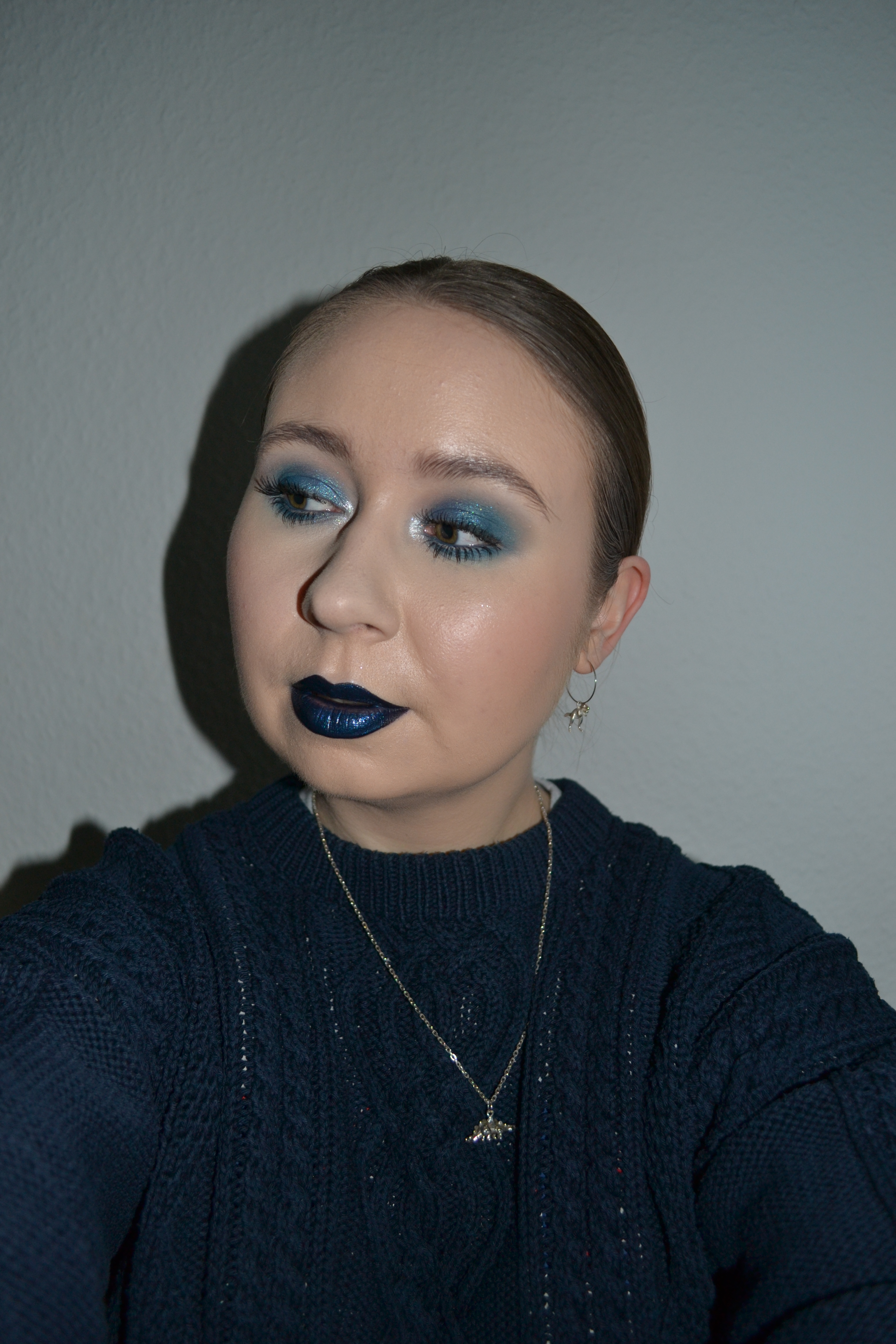 Here’s the make-up I wore Tuesday May 4. This might be my favourite look of the week. I really like the plum black glossy lip paired with the most insanely stunning royal blue glitter eyeshadow.