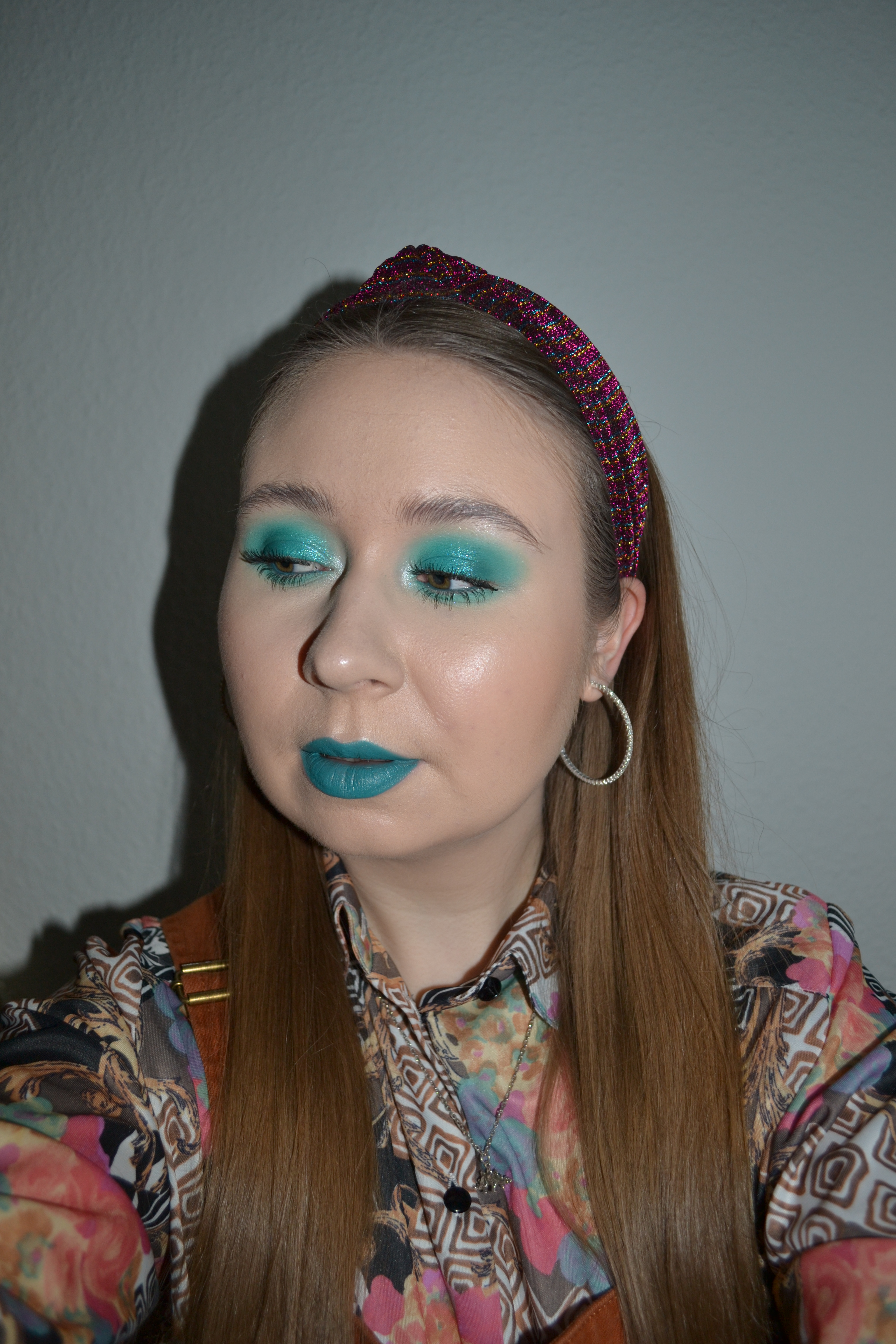 (Base: primer – NYX The Marshmellow Primer, foundation – Catrice Clean ID High Cover Luminous Matt foundation (shade: 004 Light Almond), concealer – L’Oréal Infaillible More Than Concealer (shade: 322 Ivory), powders – e.l.f. HD Undereye setting powder in Sheer + Rimmel Clear Complexion Clarifying powder in 021 Transparent. Face make-up: bronzer – Fenty Beauty Sun Stalk’r – Instant Warmth bronzer (shade: Inda Sun), blusher – MUA Makeup Academy Blushed matte blush powder in Papaya Whip, highlighter – Ofra Cosmetics x Nikkietutorials Glazed Donut highlighter. Eye make-up: base – MAC Pro Longwear Paint Pot in Painterly, eyeshadows – Made By Mitchell Feet On The Ground palette (shades: Salt Bae + Venom) + Made By Mitchell Head In The Clouds palette (shades: Cockpit + Bora Blue + Twinkul + Clouded), mascaras – Essence Volume Booster lash primer + Maybelline Lash Sensational Sky High mascara, eyeliner – Marc Jacobs Highliner Glam Glitter gel eye crayon in (Gem)Stoned. Eyebrows: Essence #pinkandproud Strong soapy brow styler (01 Stronger Than Yesterday!). Lips: Essence Invisible Kiss transparent lipliner in 01 Multitalent Wonder + MAC Show And Teal lipstick)