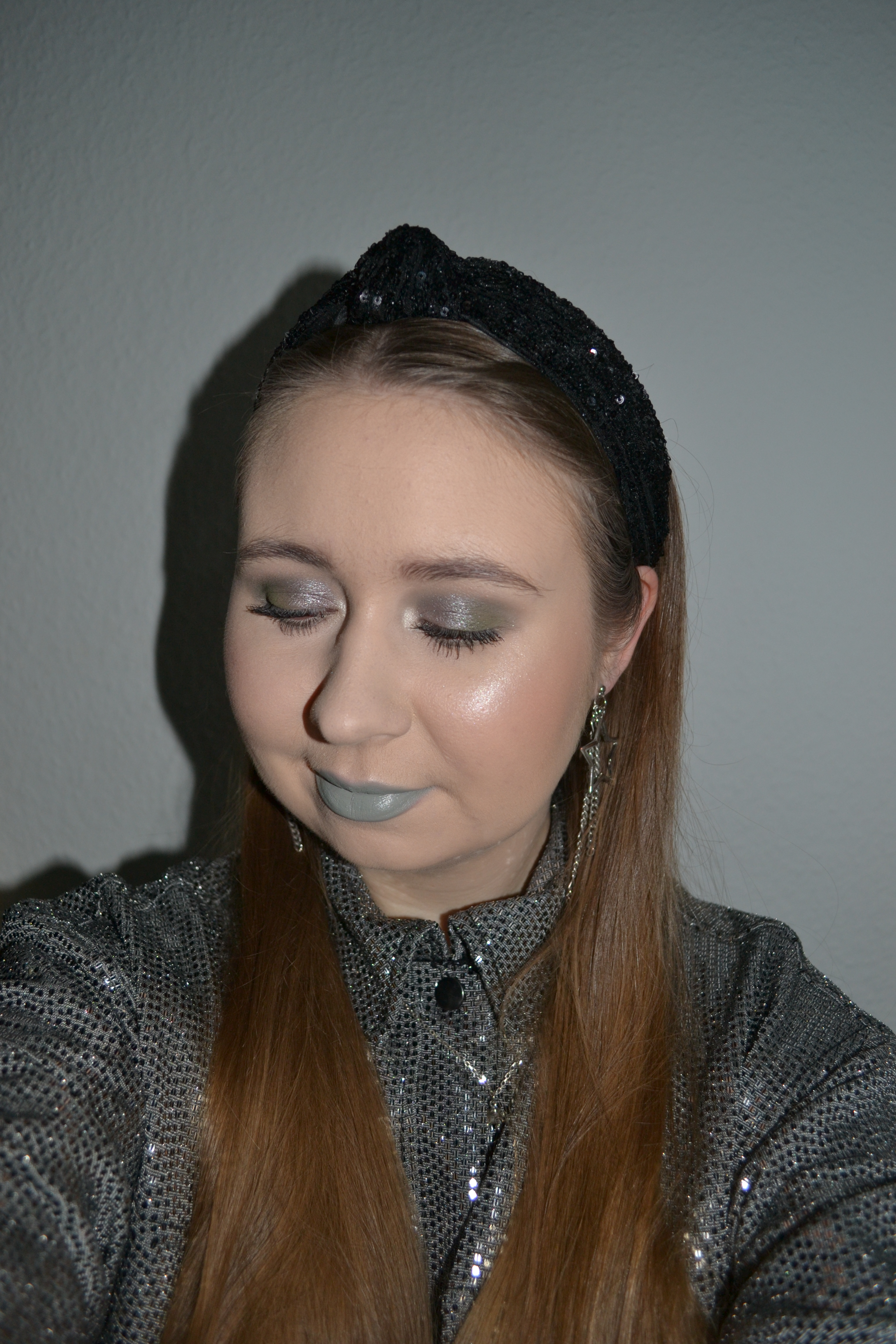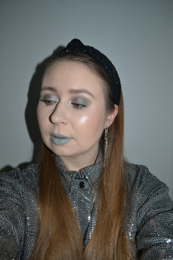 (Base: primer – Essence Prime+ Studio Poreless + Skin Blurring putty primer, foundation – Maybelline Fit Me Matte + Poreless foundation (shade: 110 Porcelain), concealers – L’Oréal Infaillible More Than Concealer (shade: 322 Ivory) + Maybelline Instant Anti Age Eraser concealer (shade: 00 Ivory), powders – e.l.f. HD Undereye setting powder in Sheer + e.l.f Sheer Tint finishing powder in Fair/Light. Face make-up: bronzer – Milani Silky Matte Bronzing powder in Sun Light, blusher – The Balm Balm Beach long-wearing blush, highlighter – Essence My Little Platinum highlighter palette (shade: Diamond Ring). Eye make-up: base – MAC Pro Longwear Paint Pot in Painterly, eyeshadows – BH Cosmetics Smitten in Switzerland palette (shades: Snowcap + Slope + Mountain + Glacier Express) + MAC Nylon eyeshadow, mascaras – Essence Volume Booster lash primer + Fenty Beauty Full Frontal – Volume, Lift & Curl mascara, eyeliner – Jeffree Star Automatic eyeliner in Armored Truck. Eyebrows: Soda #wowbrow Flat Brow Liner in Kim + MAC Brow Set in Clear. Lips: Essence Invisible Kiss transparent lipliner in 01 Multitalent Wonder + MAC Night Mint lipstick)