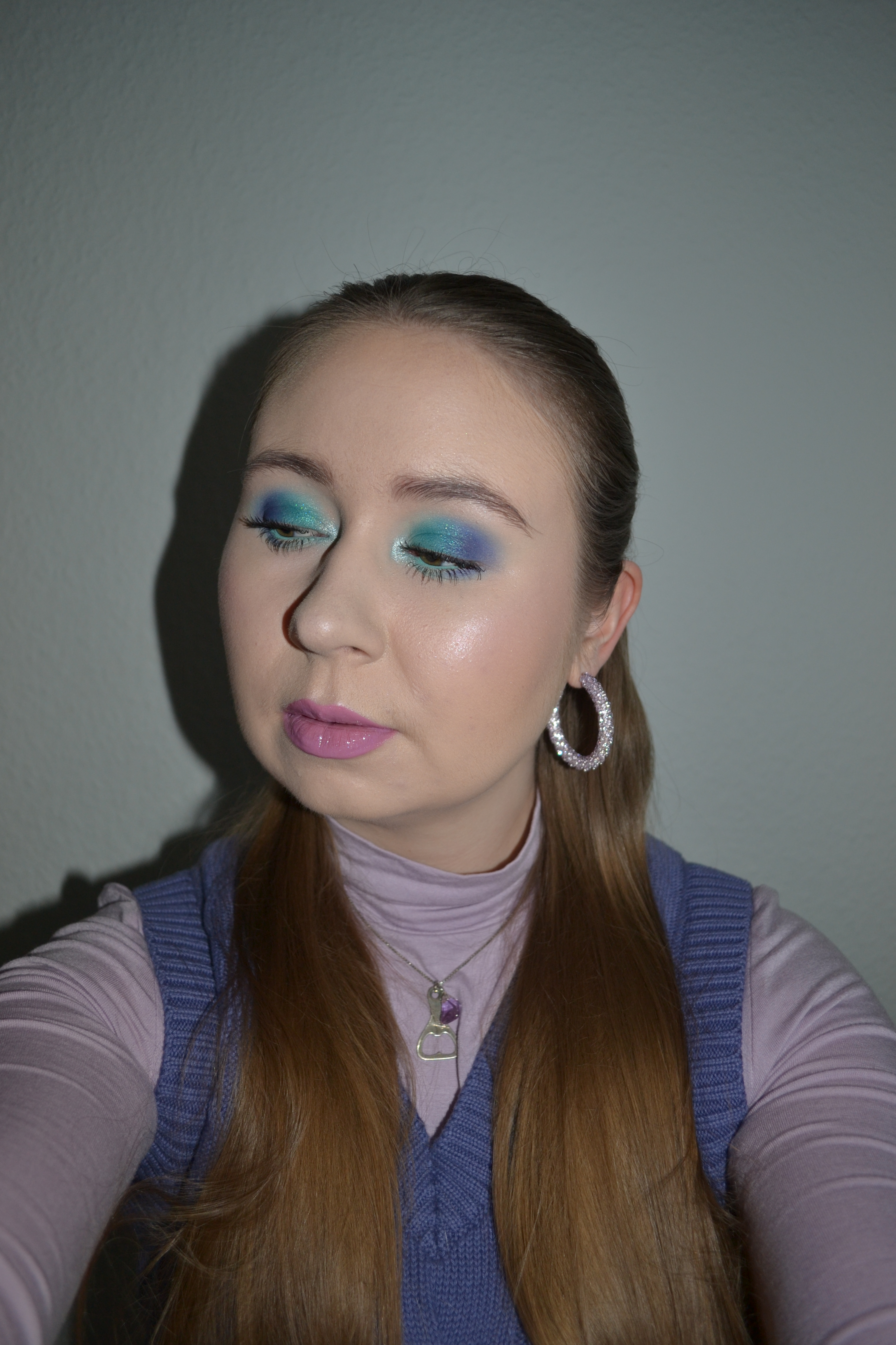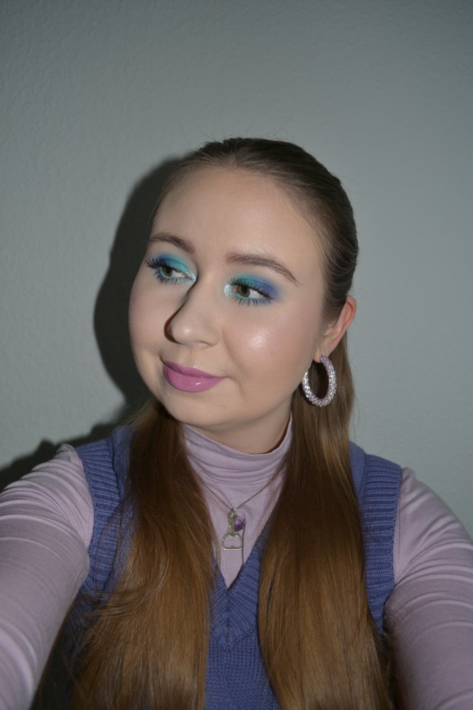 (Base: primer – NYX The Marshmellow Primer, foundation – Maybelline Fit Me Matte + Poreless foundation (shade: 110 Porcelain), concealer – L’Oréal Infaillible More Than Concealer (shade: 322 Ivory), powders – Jeffree Star Magic Star Setting Powder in Lavender and Fair. Face make-up: bronzer – Milani Silky Matte Bronzing powder in Sun Light, blusher – Clinique Cheek Pop blush in 15 Pansy Pop, highlighter – Jeffree Star Skin Frost in Neffree. Eye make-up: base – MAC Pro Longwear Paint Pot in Painterly, eyeshadows – Essence eyeshadow in 05 Granny Pants + Natasha Denona Circo Loco palette (shades: Fun-Tomine + Magic + Flip + Snow Cone), mascara – Maybelline Lash Sensational Sky High mascara, eyeliner – LA Girl Shockwave Neon Liner (shade: Fresh). Eyebrows: Soda #wowbrow Flat Brow Liner in Kim + MAC Brow Set in Clear. Lips: Essence Invisible Kiss transparent lipliner in 01 Multitalent Wonder + MAC Kawaii Party lipstick + Essence Shine, Shine, Shine wet look lipgloss in 15 Watch Me Do)