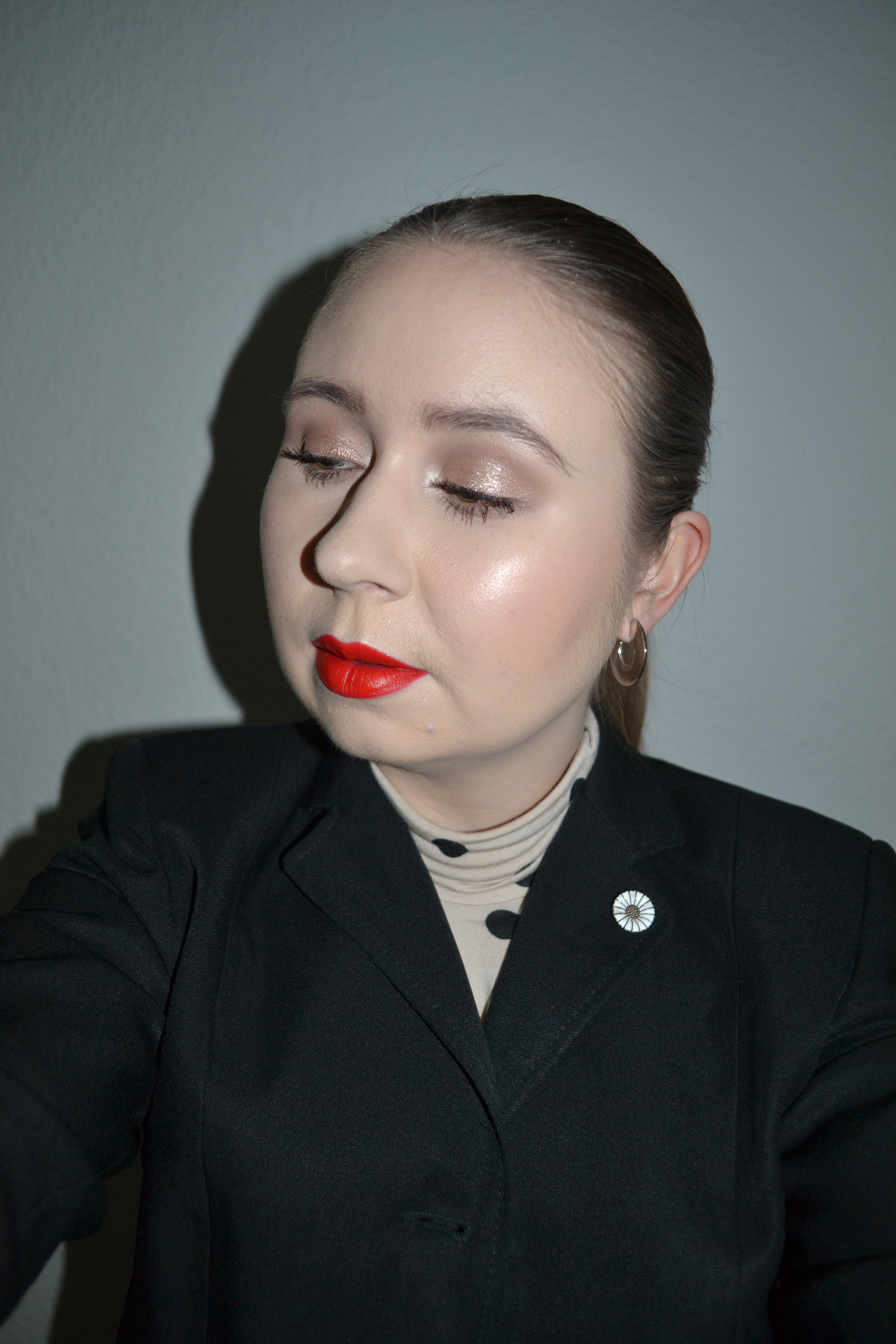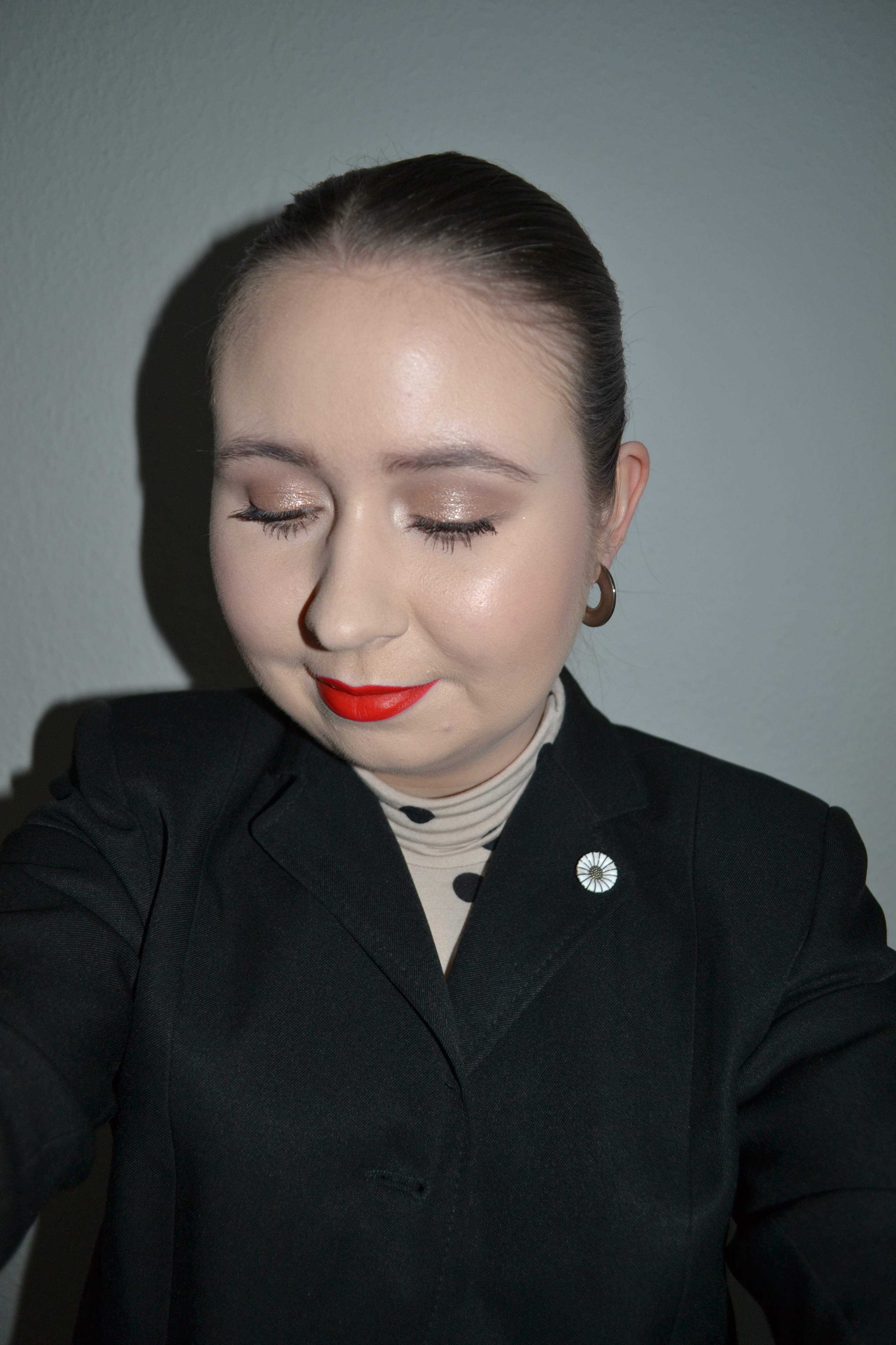 Here’s the make-up I wore with this outfit. It’s not often that I wear neutral glittery eye make-up, but I actually think it looks very pretty. Especially when paired with a red lip.