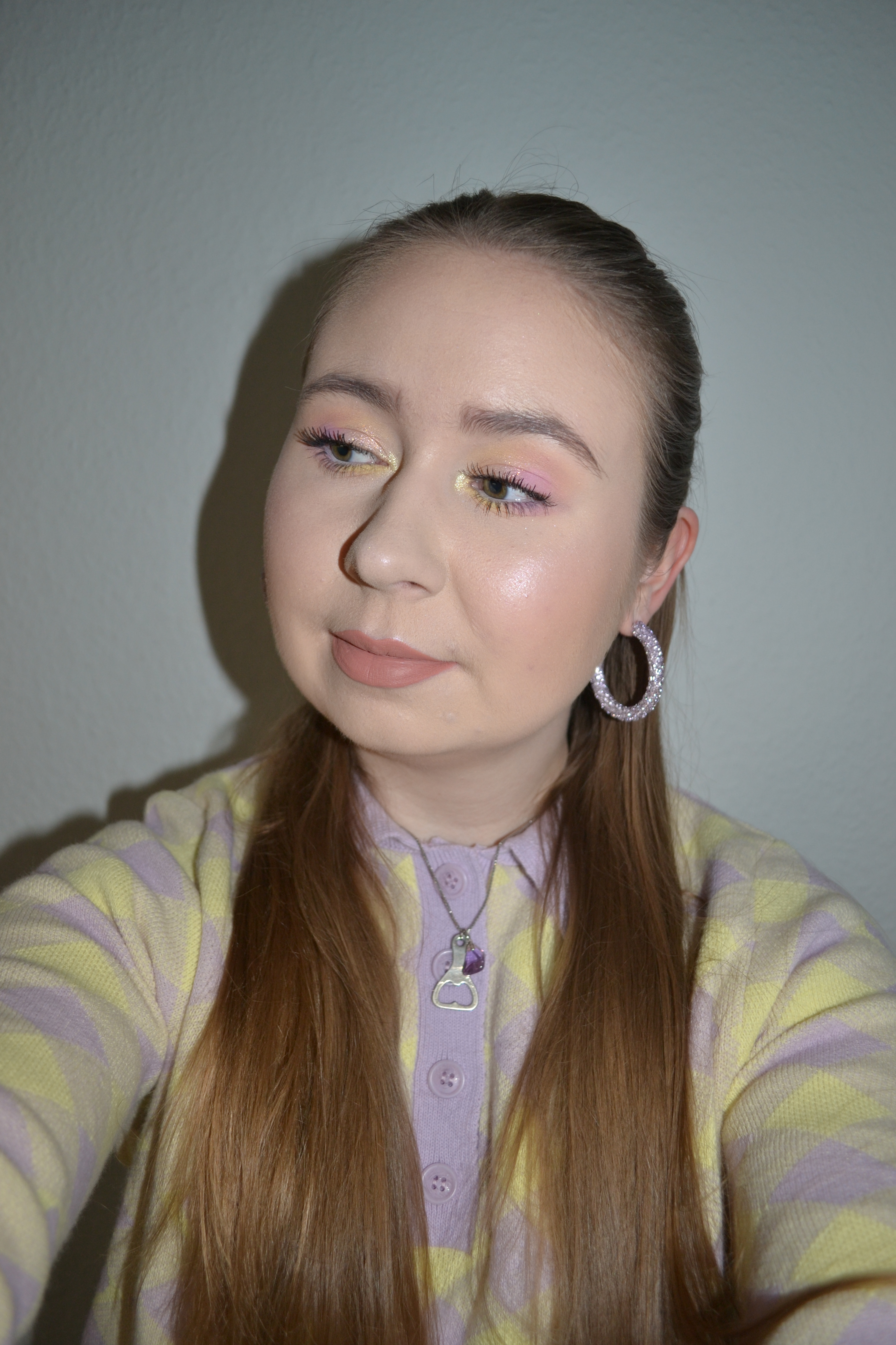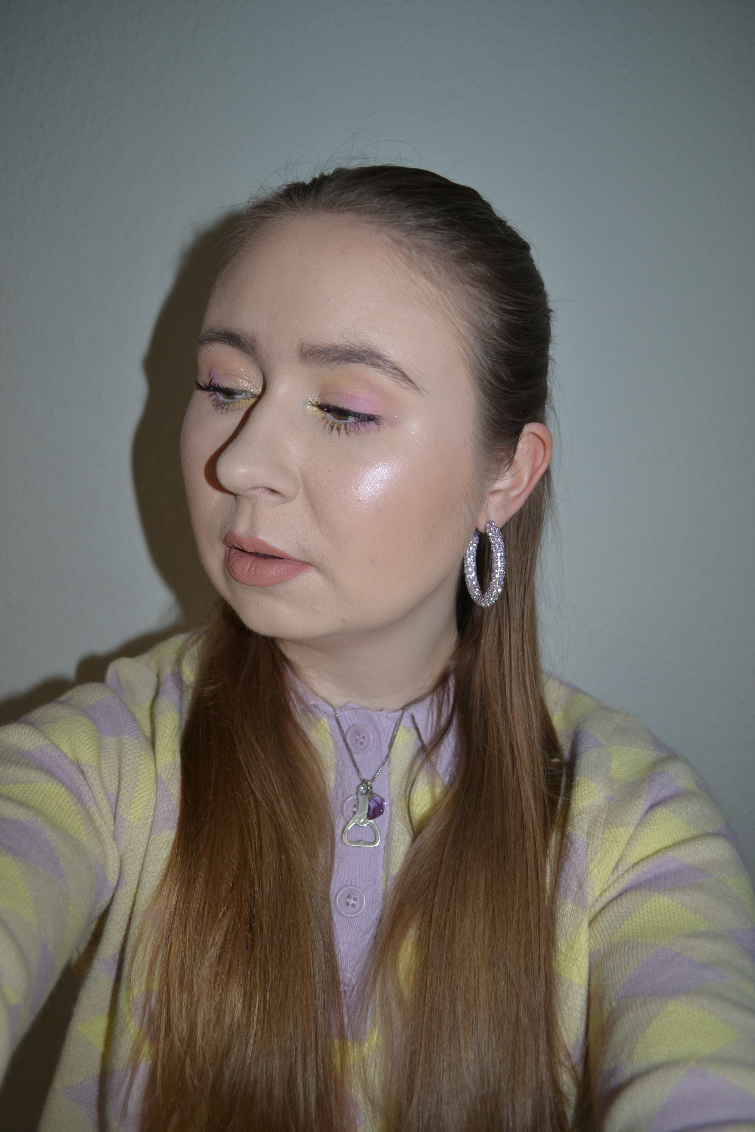 (Base: primer – e.l.f. Poreless Putty Primer, foundation – Maybelline Fit Me Matte + Poreless foundation (shade: 110 Porcelain), concealers – L’Oréal Infaillible More Than Concealer (shade: 322 Ivory) + Maybelline Instant Anti Age Eraser concealer (shade: 00 Ivory), powder – Fenty Beauty Pro Filt´r Instant Retouch setting powder in Butter. Face make-up: bronzer – Essence Hello, Good Stuff! matte & glow bronzer in 10 Cocoa-Cool, blusher – MAC Prism powder blush, highlighter – Essence Glow Like A Pro loose highlighter (04 Purple Scandal). Eye make-up: base – MAC Pro Longwear Paint Pot in Painterly, eyeshadows – Essence eyeshadow in 05 Granny Pants + Huda Beauty Pastel Obsessions palette in Rose (shades: 1.,2. & 3. shade 2. row + 1. shade 3. row), mascara – Essence Lash Princess False Lash Effect mascara, eyeliner – NYX Faux Whites eyeliner in Lavender Blush. Eyebrows: Soda #wowbrow Flat Brow Liner in Kim + MAC Brow Set in Clear. Lips: Jeffree Star Velour liquid lipstick in Mannequin)