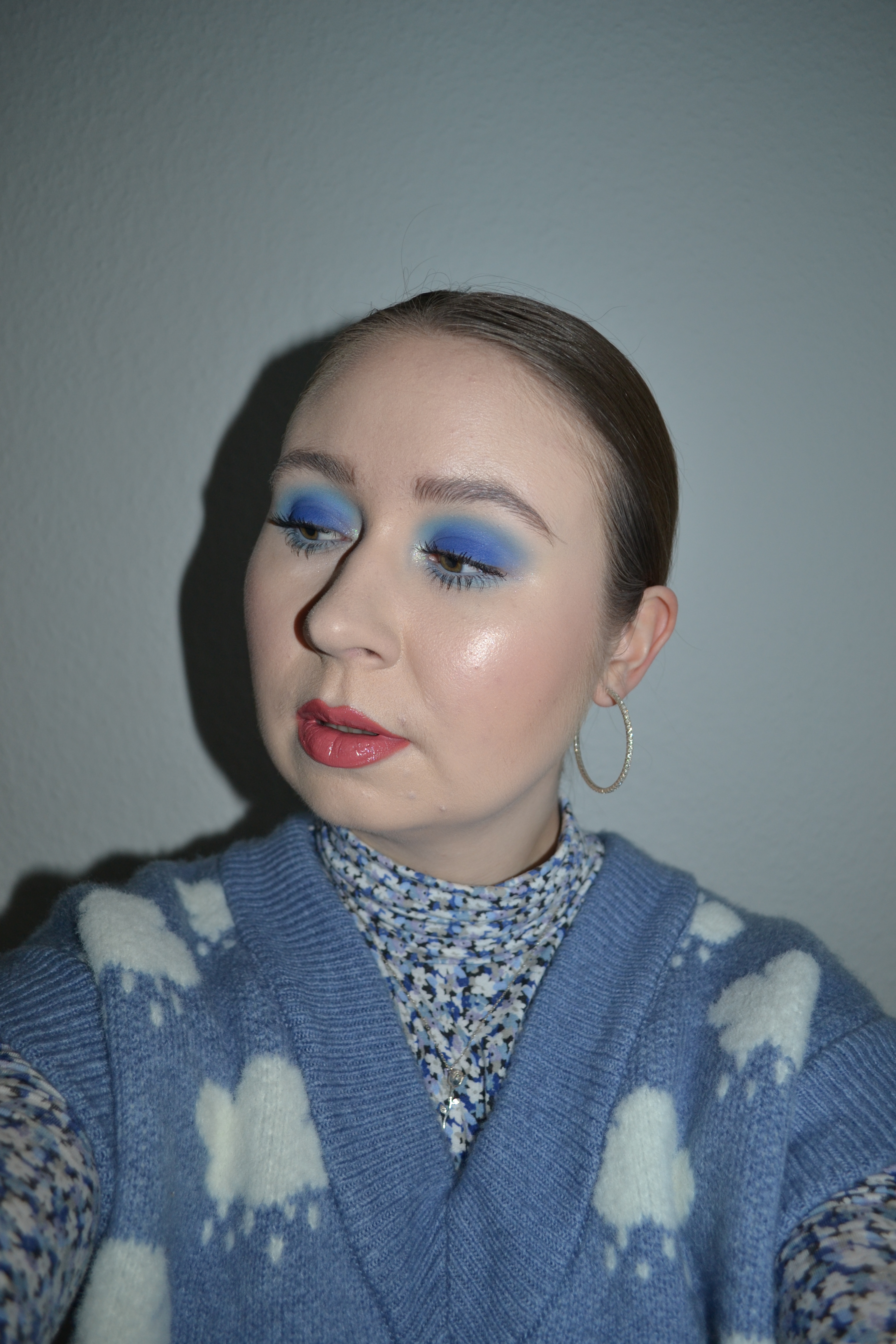 Here’s the make-up I wore with this outfit. I really like this all matte (apart from the inner corner highlight) blue eye look. And I think it looks stunning paired with that glossy peachy nude lip.