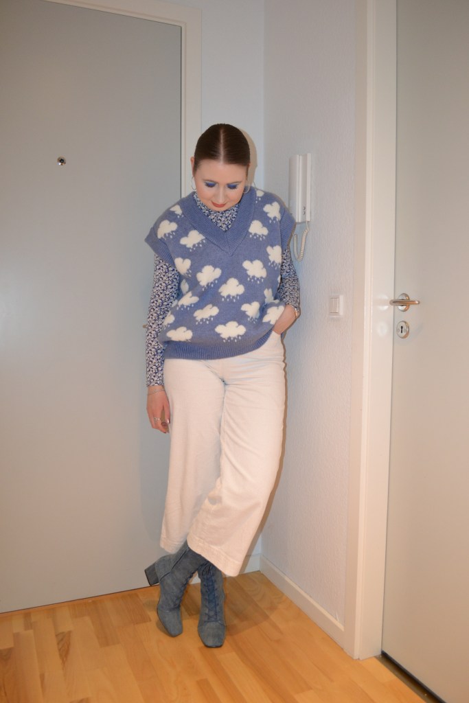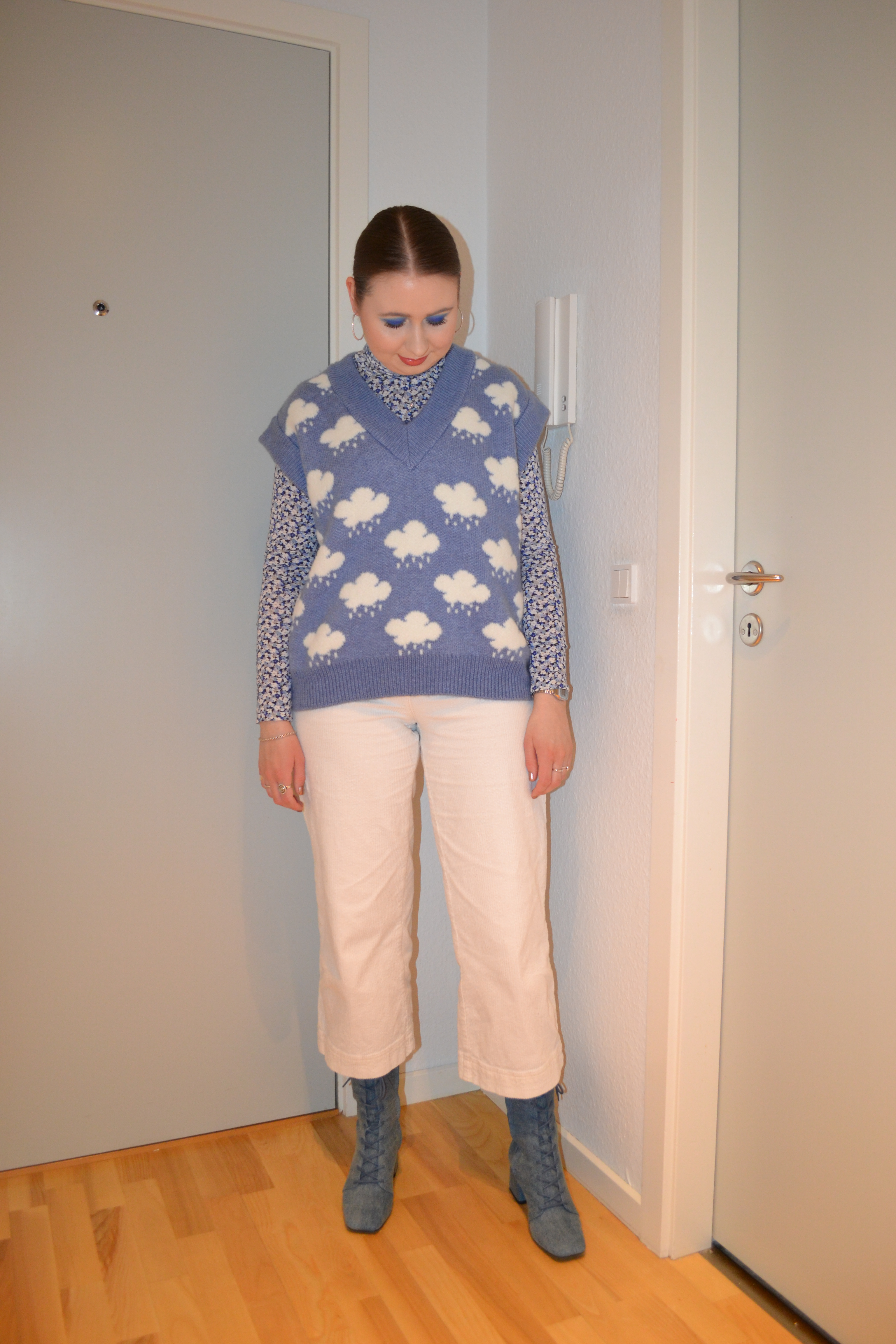 Here’s what I wore Tuesday April 27. I wanted to wear my cloud sweater vest and decided to go for an all blue and white colour scheme. I also played with different textures/fabrics when I put together this outfit, knit, corduroy and denim, which makes an outfit a little more interesting.