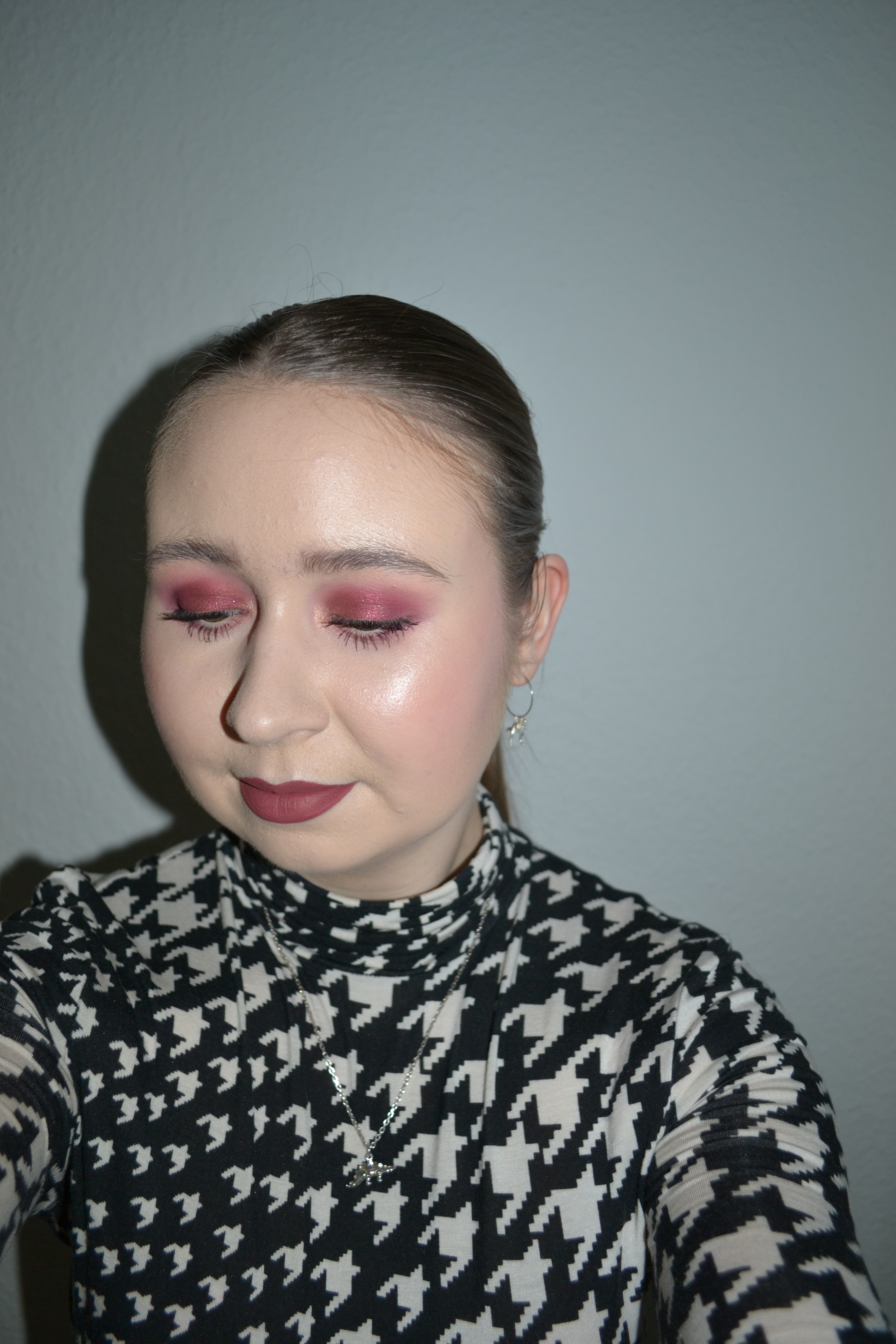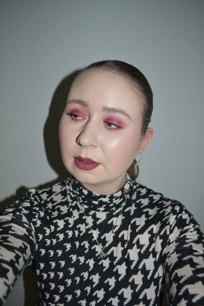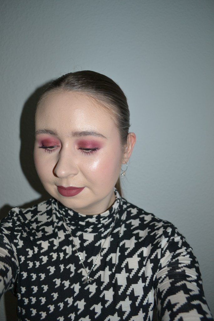 Here’s the make-up I wore with this outfit. I really wanted to play with my Natasha Denona Love palette again and ended up with this berry/wine eye look. I just had to pair it with matching lipstick and blusher, because I love a monochromatic make-up look.