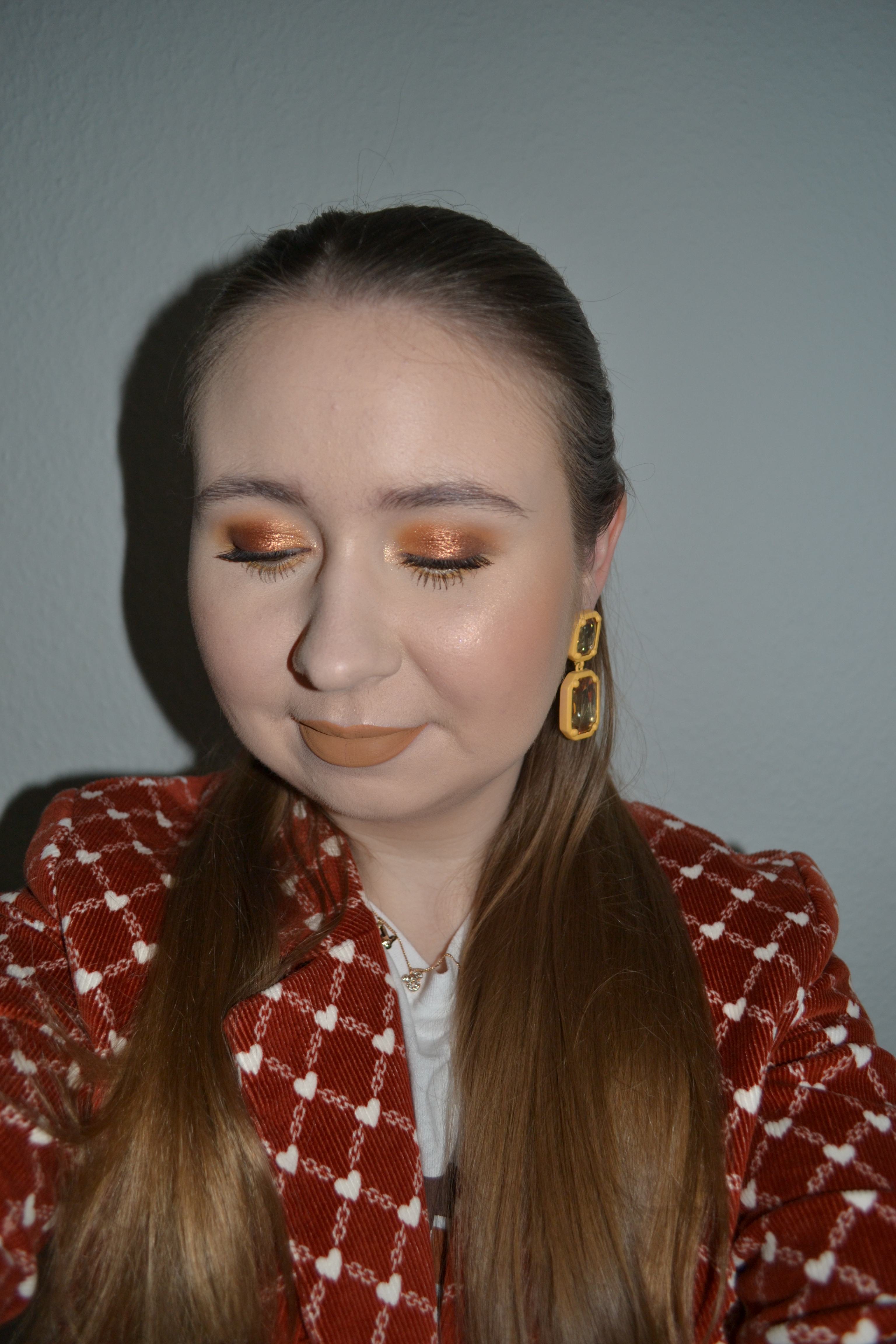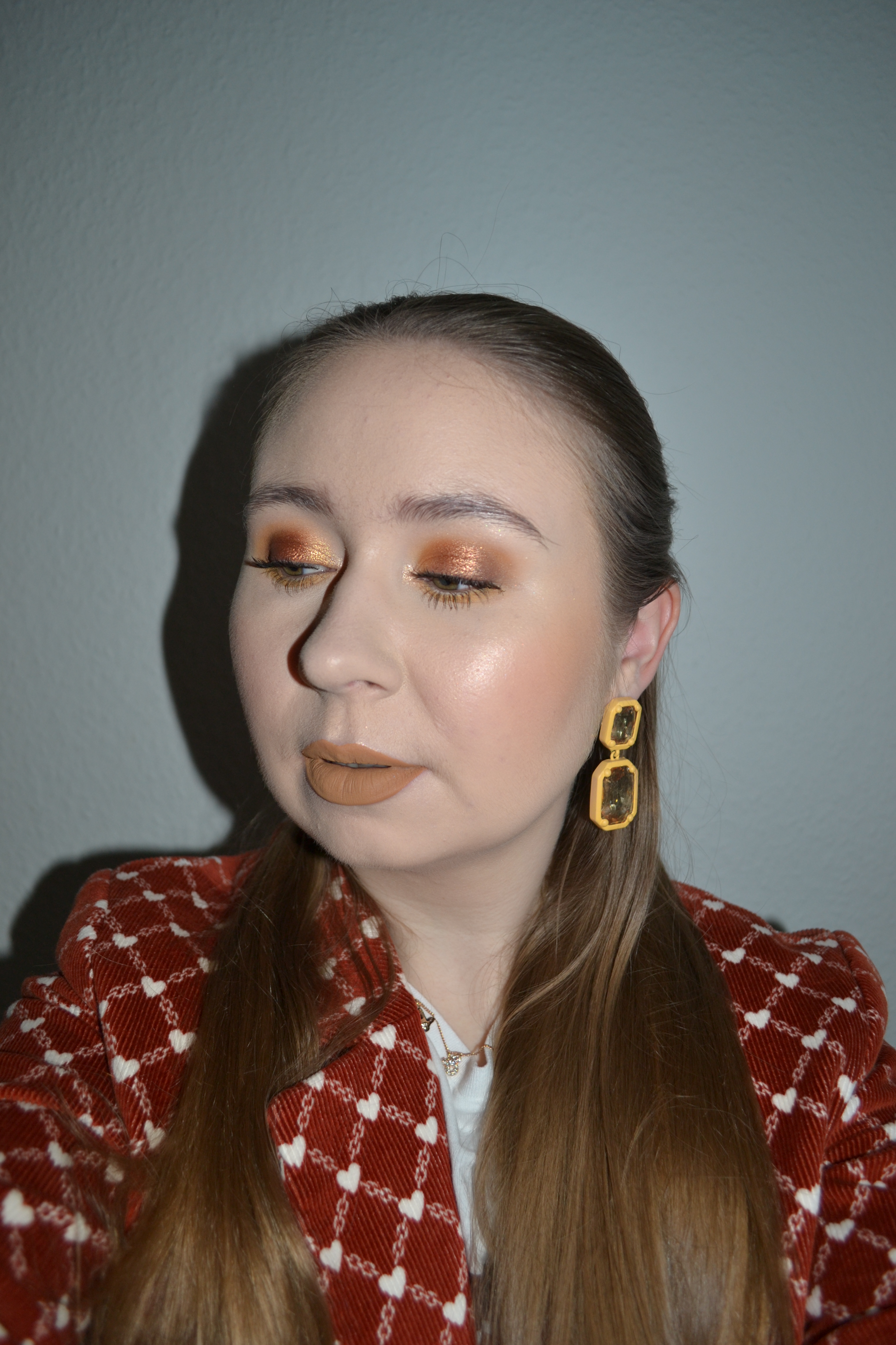 (Base: primer – Essence Wanna Bee My Honey? luminizing primer in 01 You’re Bee-autiful!, foundation – Maybelline Fit Me Matte + Poreless foundation (shade: 110 Porcelain), concealers – L’Oréal Infaillible More Than Concealer (shade: 322 Ivory) + Essence Camouflage+ Healthy Glow concealer in 10 Light Ivory, powder – Fenty Beauty Pro Filt´r Instant Retouch setting powder in Butter. Face make-up: bronzer – Ofra Cosmetics x Samantha March River bronzer duo, blushers – NYX Sweet Cheeks matte creamy powder blushes in Summer Breeze + Silence is Golden, highlighter – Becca Shimmering Skin Perfector pressed highlighter (shade: Vanilla Quartz). Eye make-up: base – MAC Pro Longwear Paint Pot in Painterly, eyeshadows – Huda Beauty Brown Obsessions Toffee palette (shades: all three shades 2. Row + all three shades 3. Row), mascara – Maybelline Lash Sensational Sky High mascara, eyeliner – MAC Harris Reed eye kohl in Powersurge. Eyebrows: Soda #wowbrow Flat Brow Liner in Kim + MAC Brow Set in Clear. Lips: Melt Cosmetics Undertone Noods liquid set lipstick in Golden)