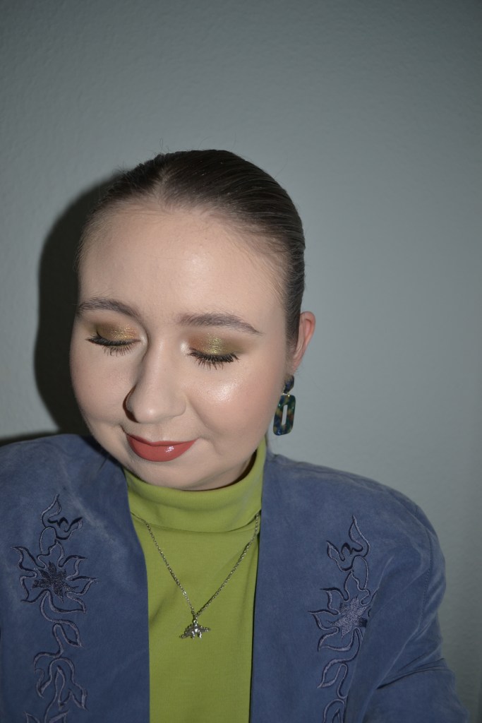 (Base: primer – Essence Skin Lovin’ Sensitive primer, foundation – Maybelline Fit Me Matte + Poreless foundation (shade: 110 Porcelain), concealers – L’Oréal Infaillible More Than Concealer (shade: 322 Ivory) + Essence Skin Lovin’ Sensitive concealer (shade: 05 Fair), powders – Essence Brighten Up! Banana powder in 10 Bababanana + Essence Skin Lovin’ Sensitive mineral powder (shade: 01 Translucent). Face make-up: bronzer + blusher – Ofra Crew blush/bronzer duo, highlighter – Natasha Denona Super Glow in 1 Fair. Eye make-up: base – MAC Pro Longwear Paint Pot in Painterly, eyeshadows – Essence eyeshadow in 05 Granny Pants + Natasha Denona Mini Gold palette (shades: Lodge + Bia + Antheia + D’Or + Dark Sepia) + MAC Nylon eyeshadow, mascara – Maybelline Lash Sensational Sky High mascara, eyeliner – Jeffree Star Automatic eyeliner in Resting Rich Face. Eyebrows: Soda #wowbrow Flat Brow Liner in Kim + MAC Brow Set in Clear. Lips: NYX Shine Loud High Pigment Lip Shine in Ambition Statement)