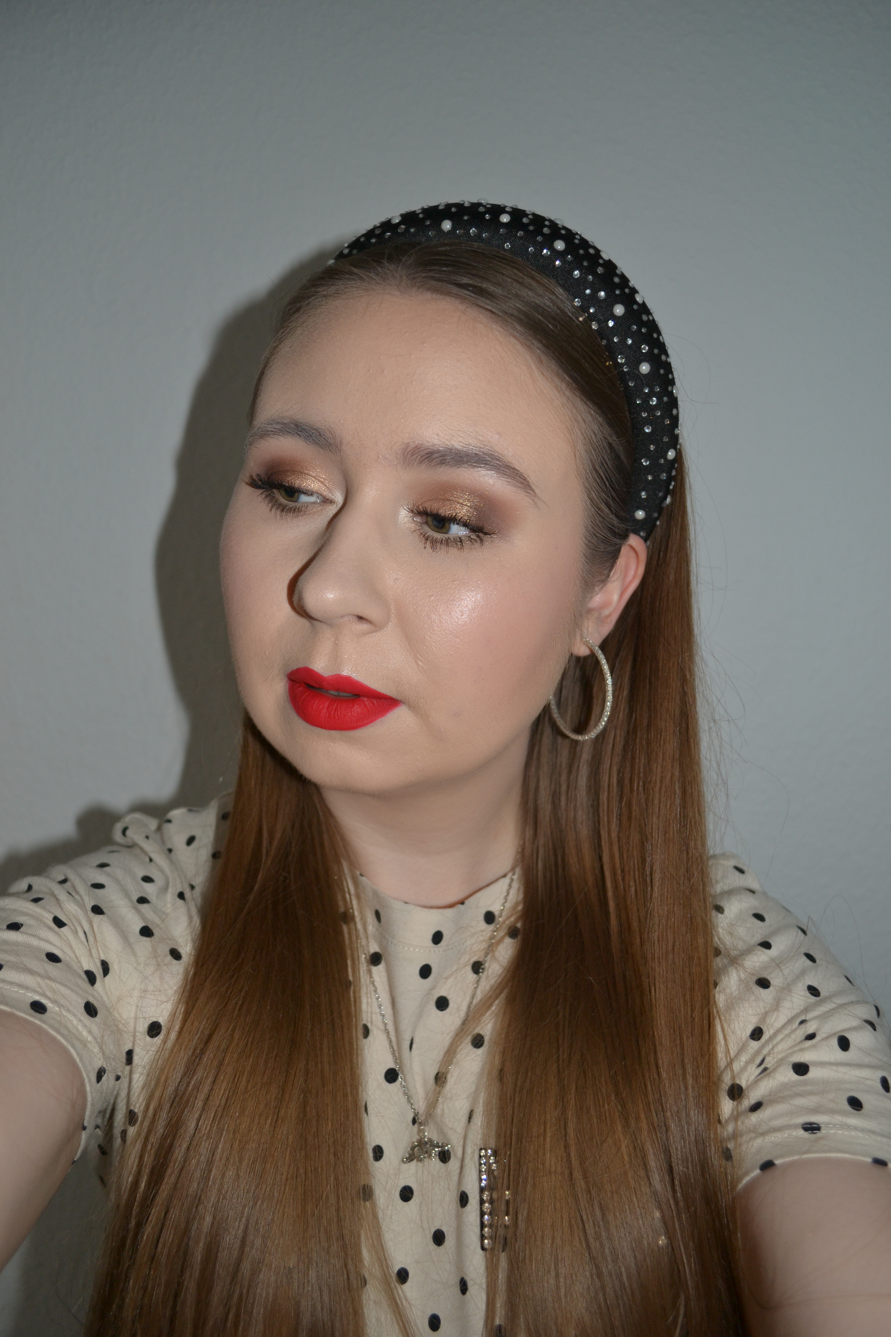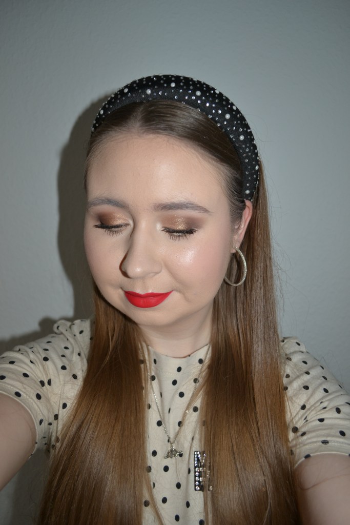 (Base: primer – Maybelline Fit Me Matte + Poreless primer, foundation – L’Oreal Paris Infaillible 24H Fresh Wear foundation (shade: 015 Porcelain), concealer – L’Oréal Infaillible More Than Concealer (shade: 322 Ivory), powders – e.l.f. HD Undereye setting powder in Sheer + Jeffree Star Magic Star Setting Powder in Fair. Face make-up: bronzer – Fenty Beauty Sun Stalk’r – Instant Warmth bronzer (shade: Inda Sun), blusher – Natasha Denona Diamond & Blush palette in 01 Darya Coral (shade: Cream Blush), highlighter – Natasha Denona Diamond & Blush palette in 01 Darya Coral (shade: Diamond Powder). Eye make-up: base – MAC Pro Longwear Paint Pot in Painterly, eyeshadows – Essence eyeshadow in 05 Granny Pants + Natasha Denona Mini Glam palette (shades: Harlow + Seed + Golden Flesh + Faye + Anjo) + MAC Nylon eyeshadow, mascara – Maybelline Lash Sensational Sky High mascara, eyeliner – MAC Studio Chromagraphic pencil in NC15/NW20. Eyebrows: Soda #wowbrow Flat Brow Liner in Kim + MAC Brow Set in Clear. Lips: Jeffree Star Velour liquid lipstick in Are You Filming?)