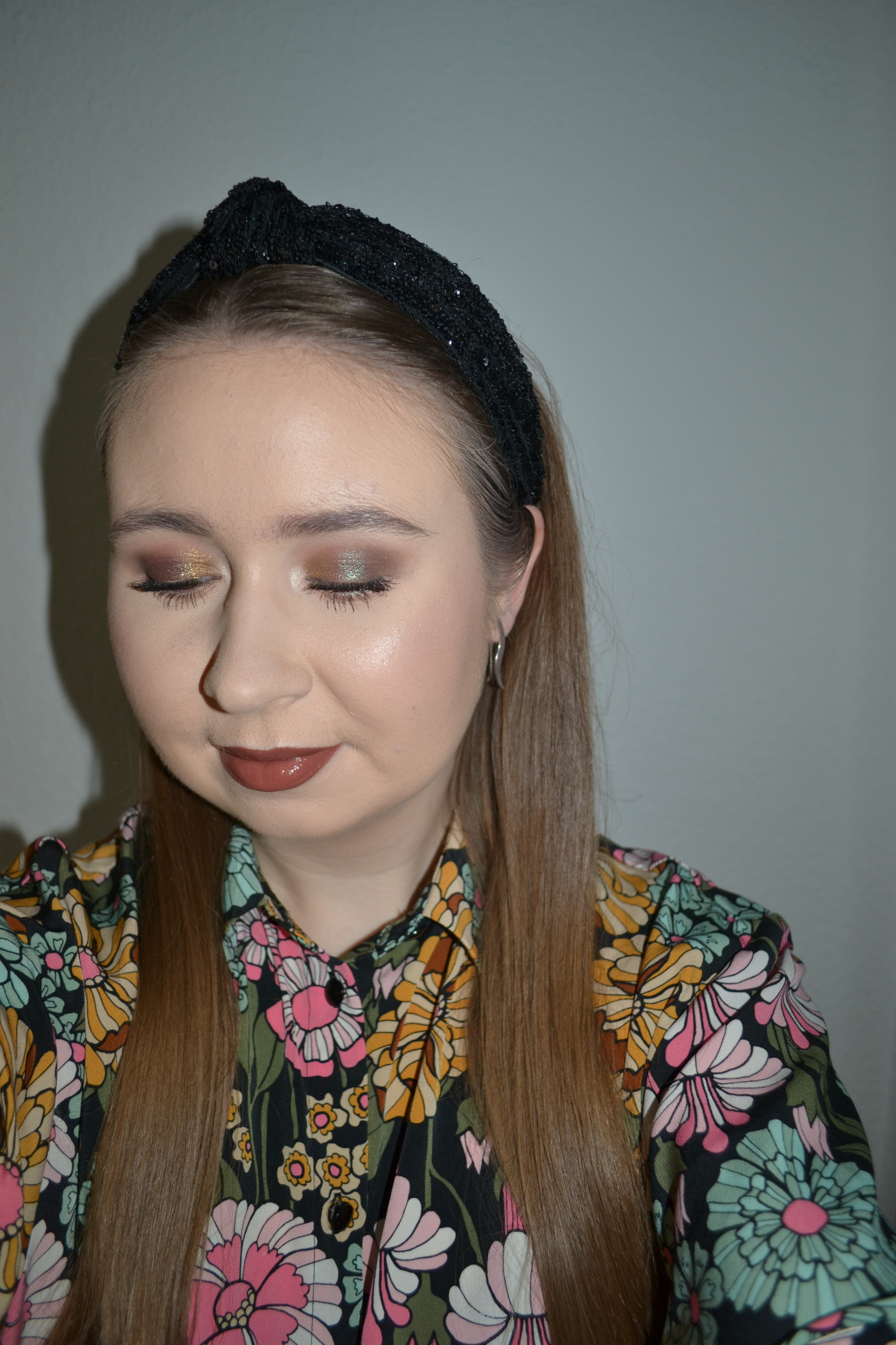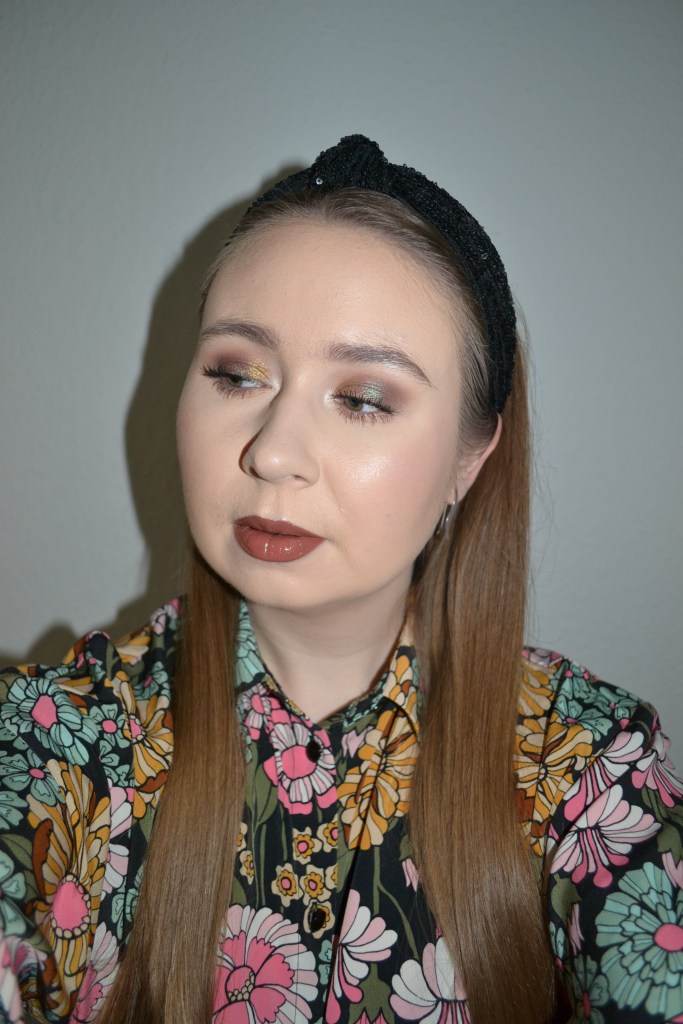 (Base: primer – Essence Prime+ Studio Hydrating + Skin Refreshing primer, foundation – Catrice Mini HD Liquid Coverage foundation (shade: 002 Porcelain Beige), concealers – e.l.f. 16HR Camo matte concealers (shades: Light Sand + Fair Warm), powder – Beauty Bakerie Flour setting powder in Oat (translucent). Face make-up: bronzer – The Balm Bronzilla bronzer, blusher – MAC Prism powder blush, highlighter – Catrice Kaviar Gauche highlighter in C01 Glow Couture. Eye make-up: base – MAC Pro Longwear Paint Pot in Painterly, eyeshadows – Essence eyeshadow in 05 Granny Pants + Natasha Denona Mini Star palette (shades: Atik + Earth + Orion + Cosmo + Bellatrix) + MAC Nylon eyeshadow, mascara – Essence Lash Princess Curl & Volume mascara, eyeliner – Jeffree Star Automatic eyeliner in Armored Truck. Eyebrows: Maybelline Brow Ultra Slim pencil in Medium Brown + MAC Brow Set in Clear. Lips: Jeffree Star Velour lip liner in Leo + MAC Whirl lipstick + Fenty Beauty Gloss Bomb in Cake Shake)