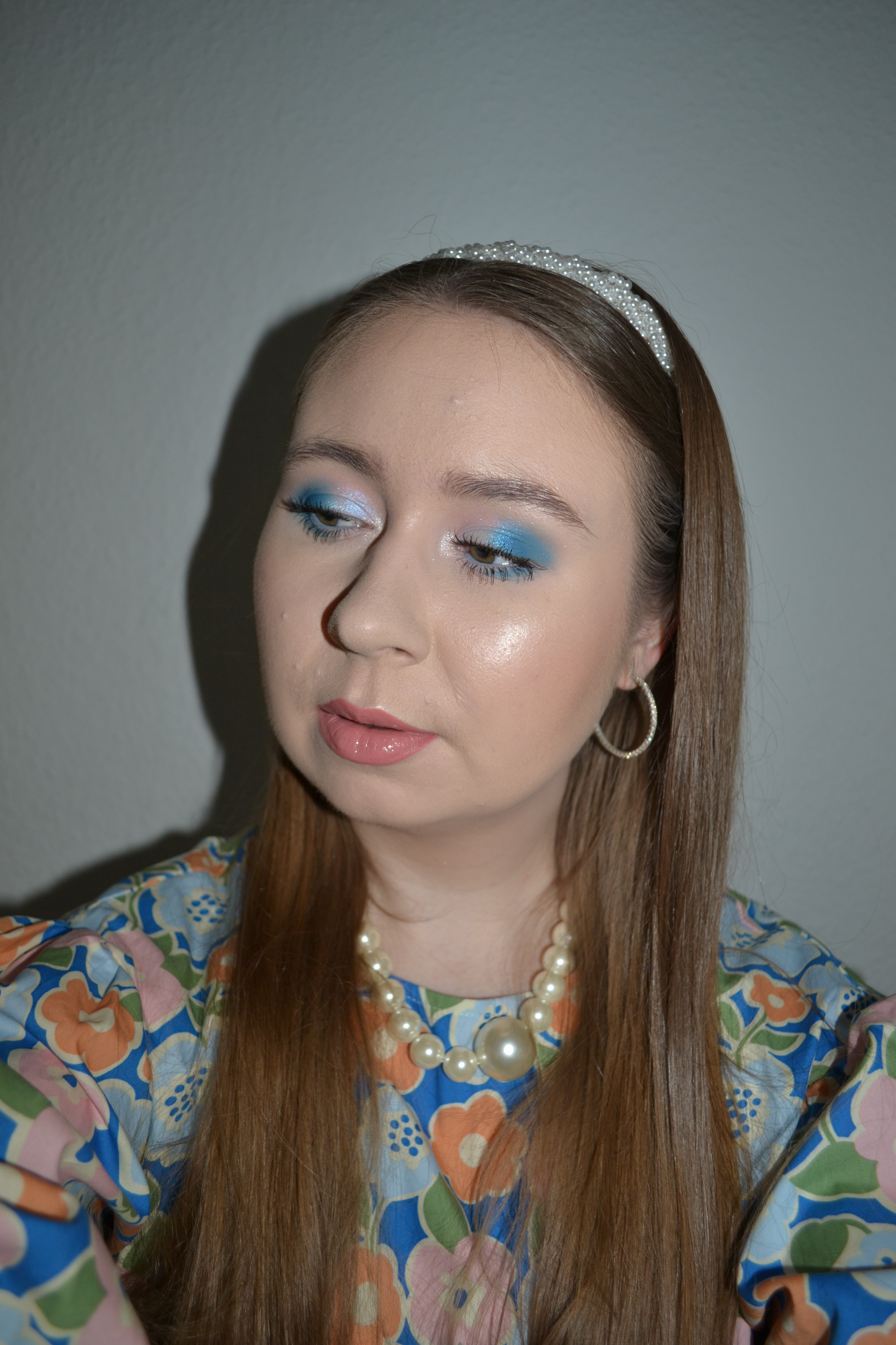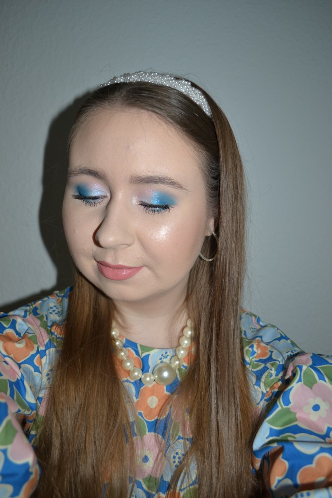 Here’s the make-up I wore with this outfit. Some blues on the eyes and a peachy nude lip to go with the dress.