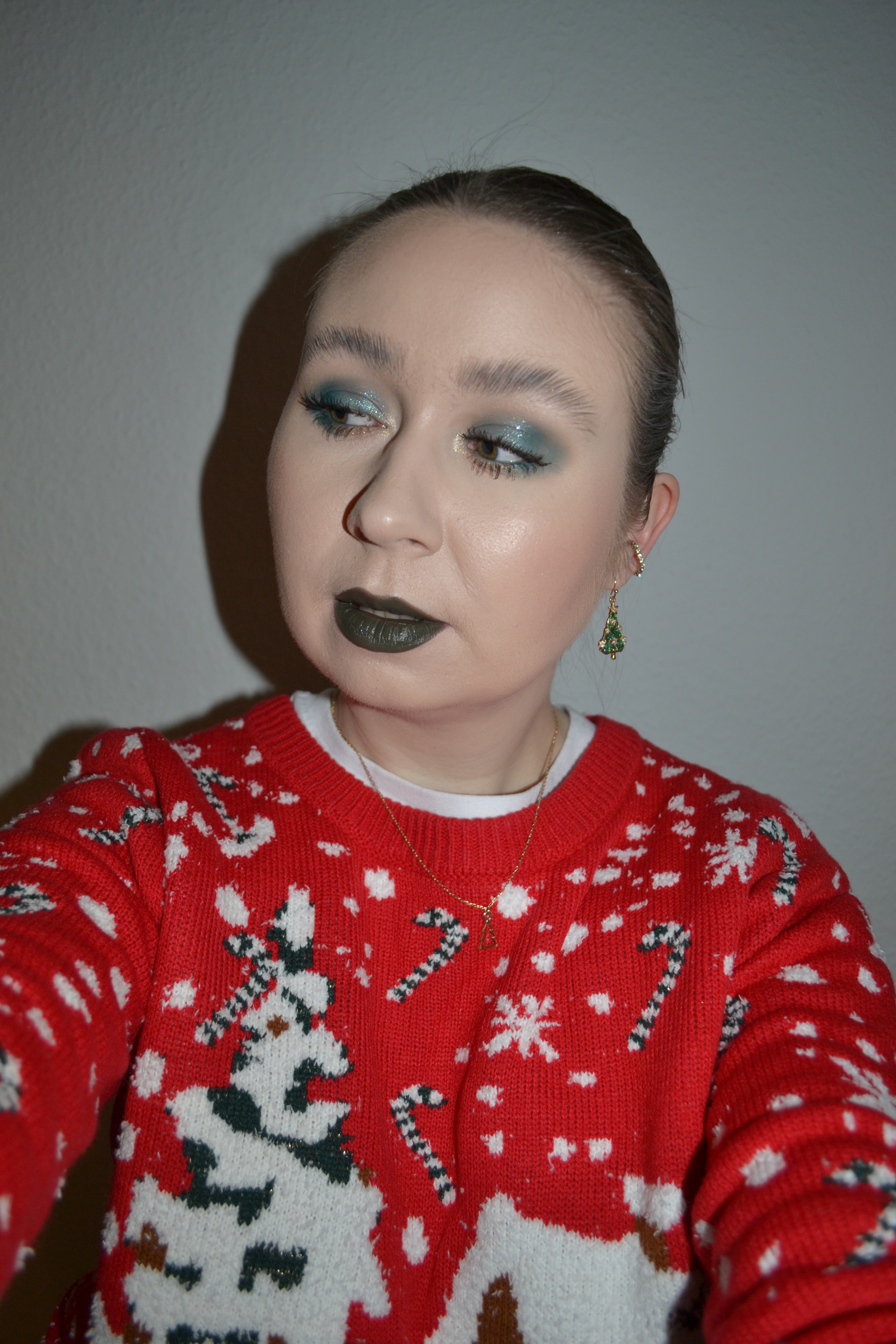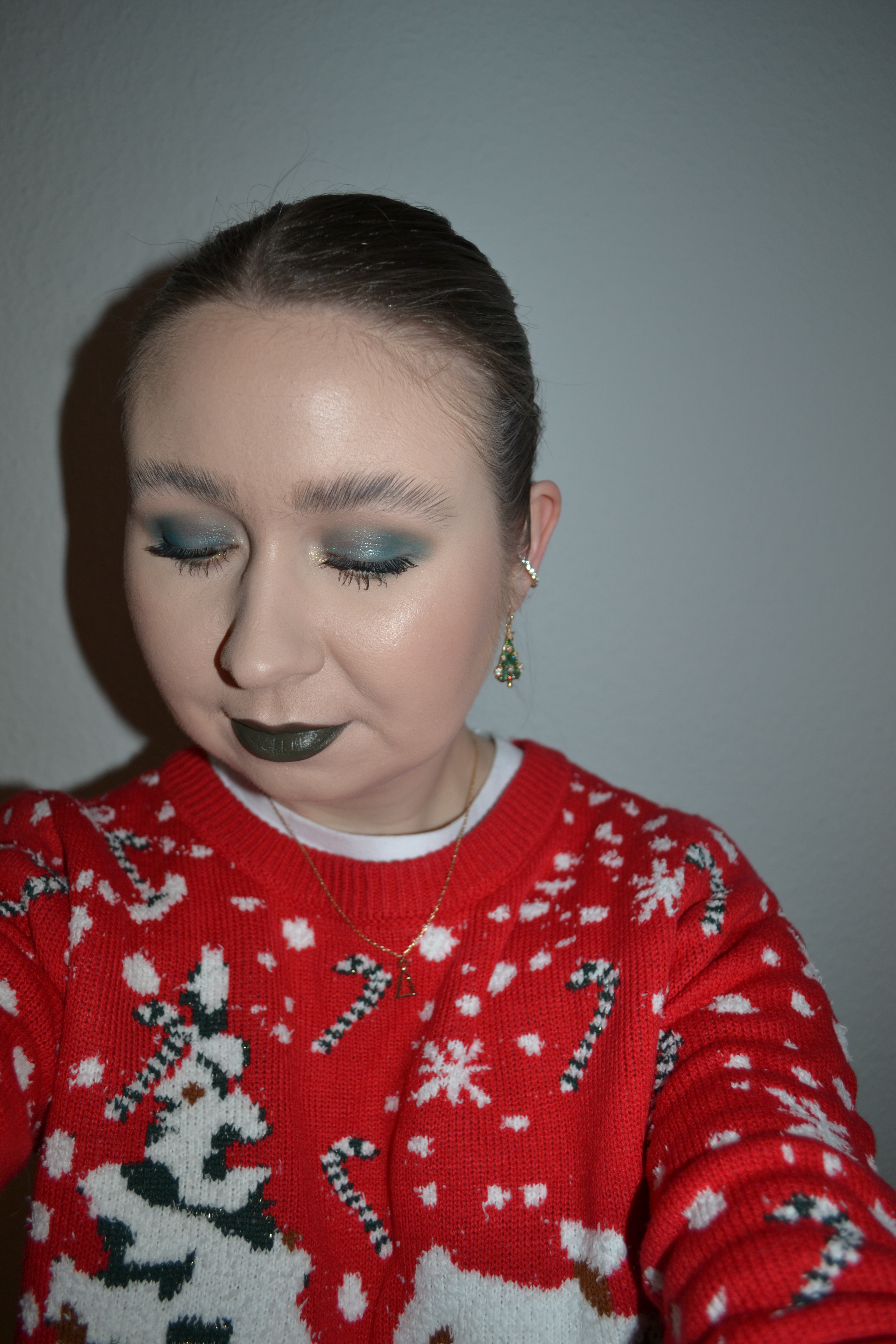 Here’s the make-up I wore with this outfit. I hadn’t worn a green lip in so long, but this outfit gave me the perfect opportunity to do so. I also thought it would be fun to wear something other than a red lip in December.