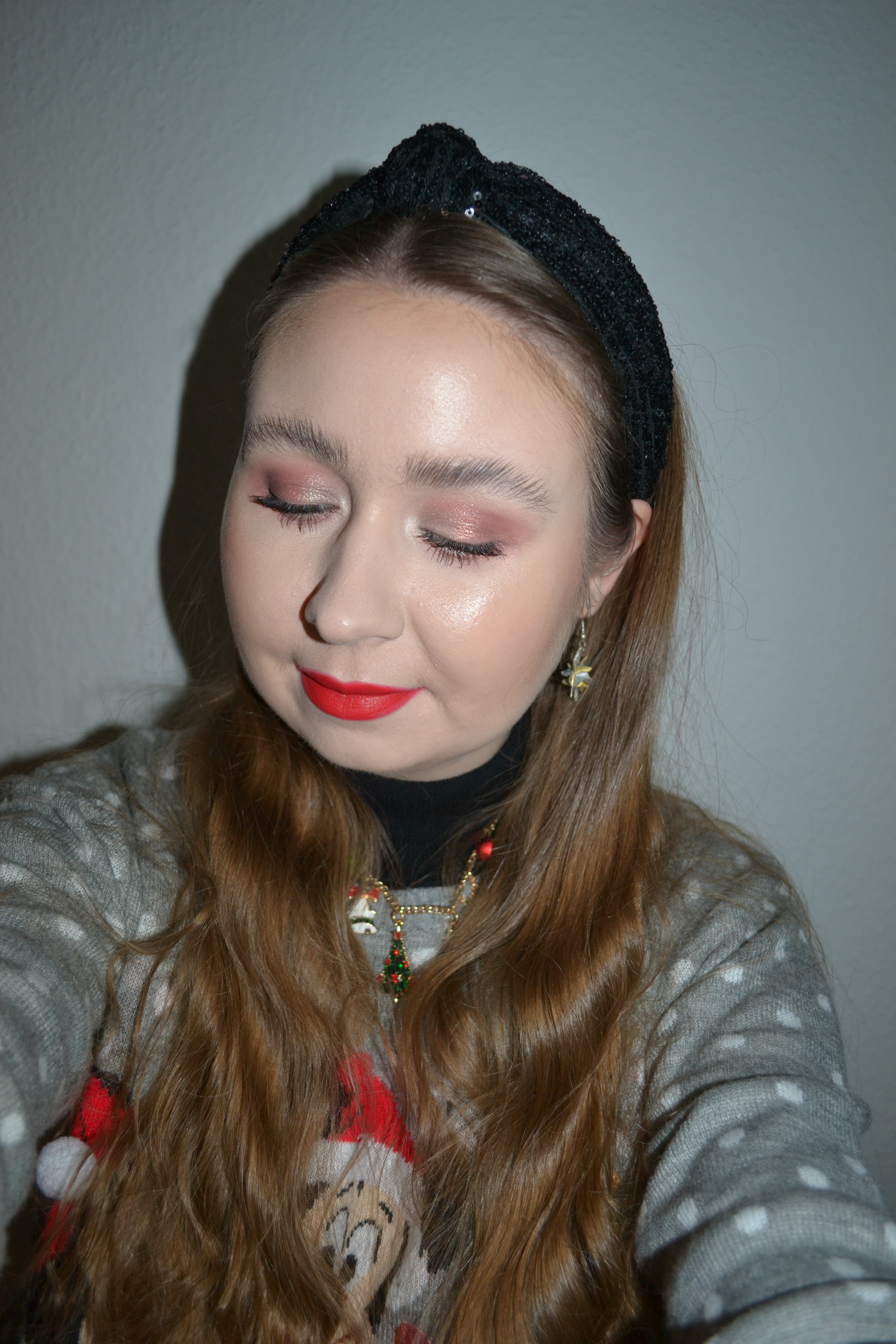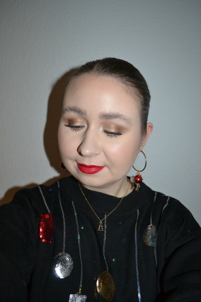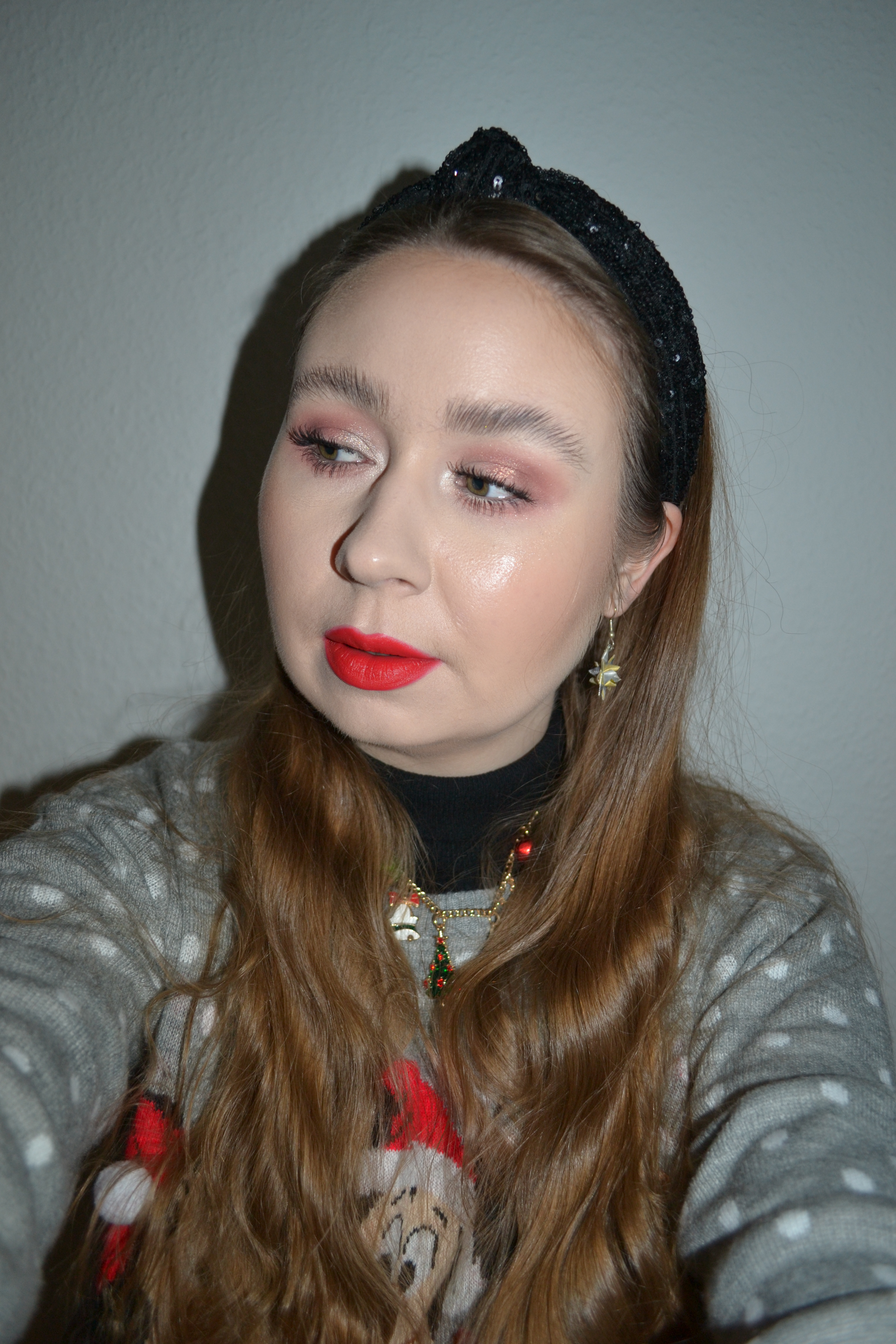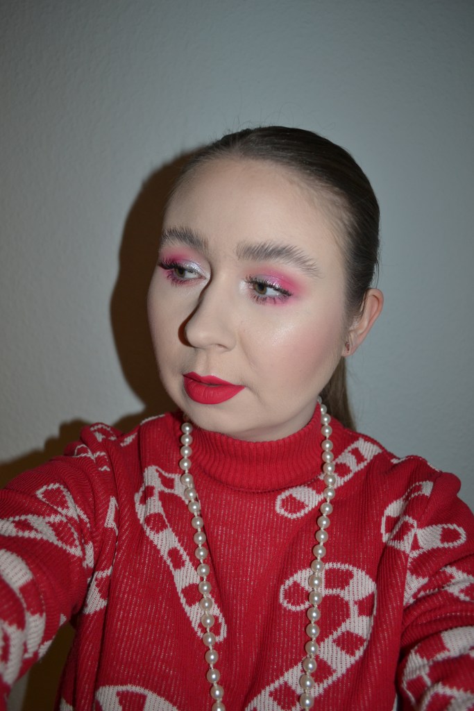(Base: primer – I Heart Revolution x Elf collection primer, foundation – Fenty Beauty Eaze Drop blurring skin tint (shade: 2), concealers – Rimmel The Multi-Tasker concealer (shade: 020 Fair) + NYX Born To Glow radiant concealer (shade: Pale), powder – Dior Backstage Face & Body Powder-No-Powder in 0 Neutral. Face make-up: bronzer – Huda Beauty Tantour Contour & Bronzer Cream in Fair, blusher – Barry M Fresh Face cheek & lip tint in Caramel Kisses, highlighter – MAC Stobe Face Glaze (shade: Let’s Make Waves). Eye make-up: base – MAC Pro Longwear Paint Pot in Painterly, eyeshadows – Essence eyeshadow in 05 Granny Pants + Natasha Denona Mini Zendo palette (shades: Bare + Uncovered + Dazz + Stripped + Stark) + MAC Nylon eyeshadow, mascara – Essence Lash Princess curl & volume mascara, eyeliner – Zoeva Graphic Eyes eyeliner in Nude Reflection. Eyebrows: Anastasia Beverly Hills Brow Freeze + Maybelline Brow Ultra Slim pencil in Medium Brown. Lips: MUA Intense Colour lipliner in Red Drama + MAC De Vil In The Details lipstick)
