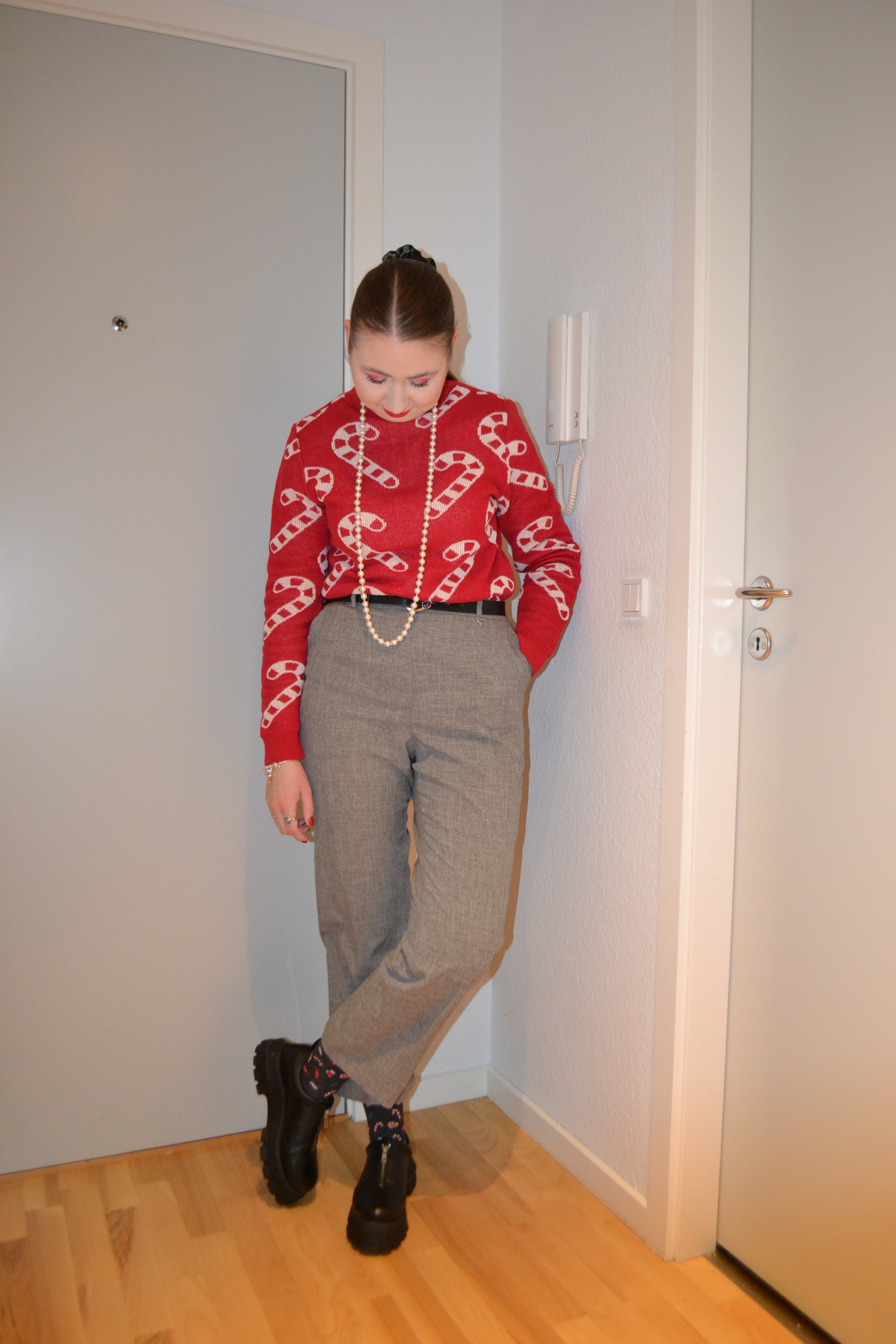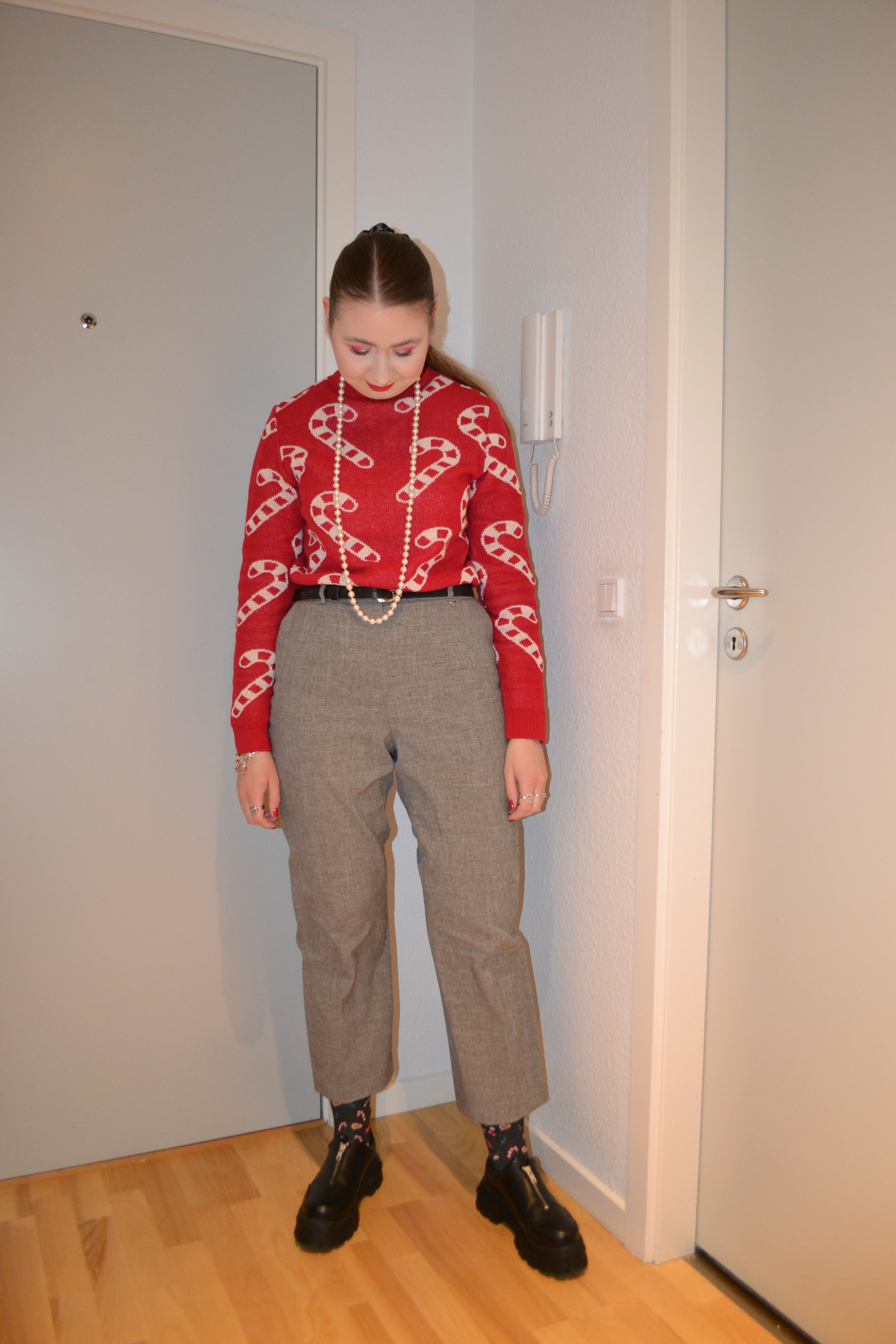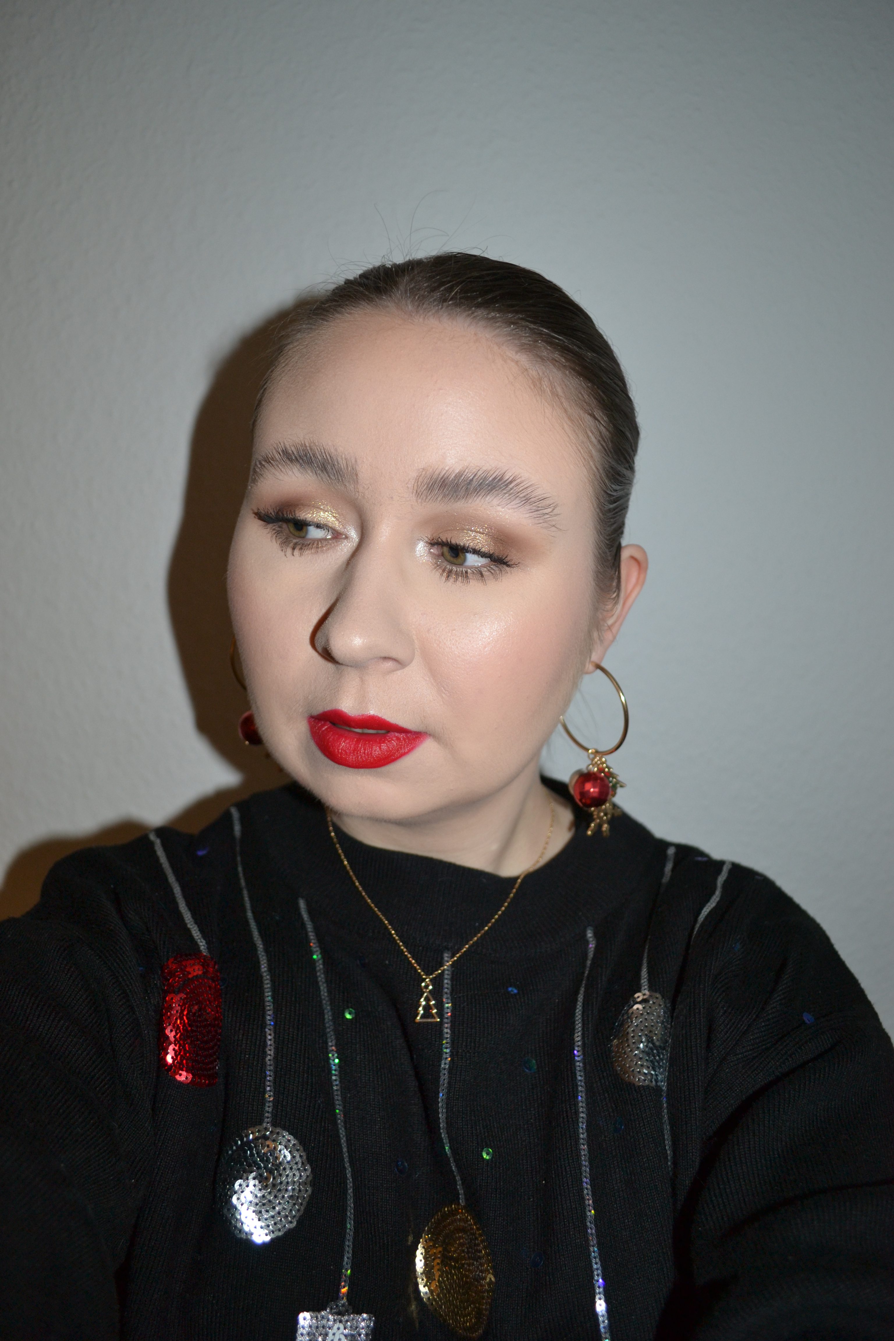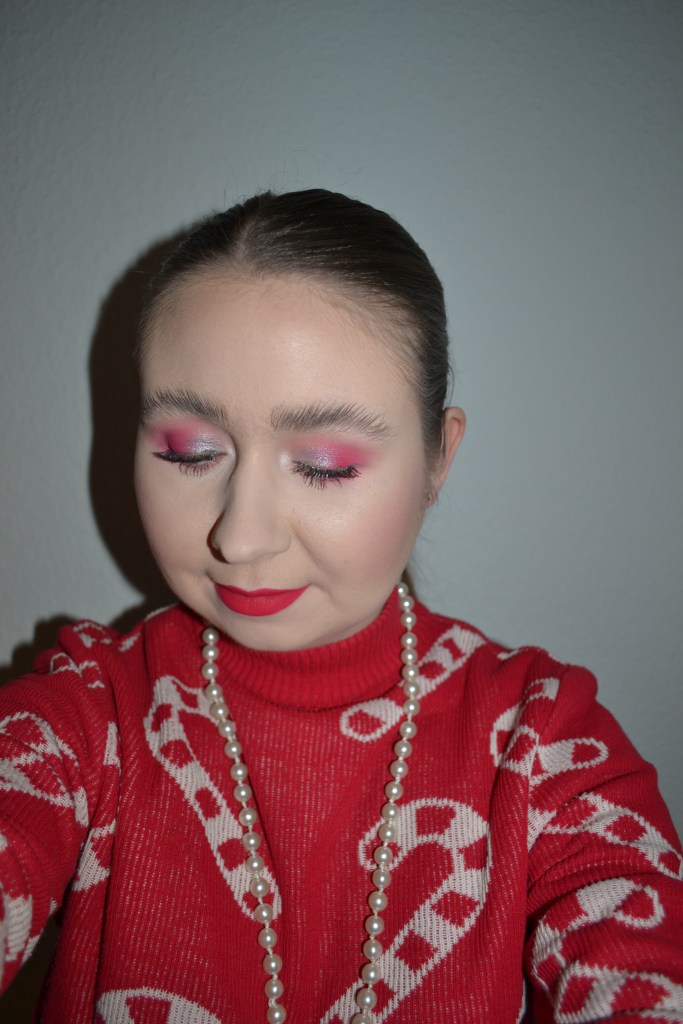 (Base: primer – I Heart Revolution x Elf collection primer, foundation – Fenty Beauty Eaze Drop blurring skin tint (shade: 2), concealers – Rimmel The Multi-Tasker concealer (shade: 020 Fair) + NYX Born To Glow radiant concealer (shade: Pale), powder – Dior Backstage Face & Body Powder-No-Powder in 0 Neutral. Face make-up: bronzer – Huda Beauty Tantour Contour & Bronzer Cream in Fair, blusher – Barry M Fresh Face cheek & lip tint in Caramel Kisses, highlighter – MAC Stobe Face Glaze (shade: Let’s Make Waves). Eye make-up: base – MAC Pro Longwear Paint Pot in Painterly, eyeshadows – Essence eyeshadow in 05 Granny Pants + Natasha Denona Mini Zendo palette (shades: Bare + Uncovered + Dazz + Stripped + Stark) + MAC Nylon eyeshadow, mascara – Essence Lash Princess curl & volume mascara, eyeliner – Zoeva Graphic Eyes eyeliner in Nude Reflection. Eyebrows: Anastasia Beverly Hills Brow Freeze + Maybelline Brow Ultra Slim pencil in Medium Brown. Lips: MUA Intense Colour lipliner in Red Drama + MAC De Vil In The Details lipstick)