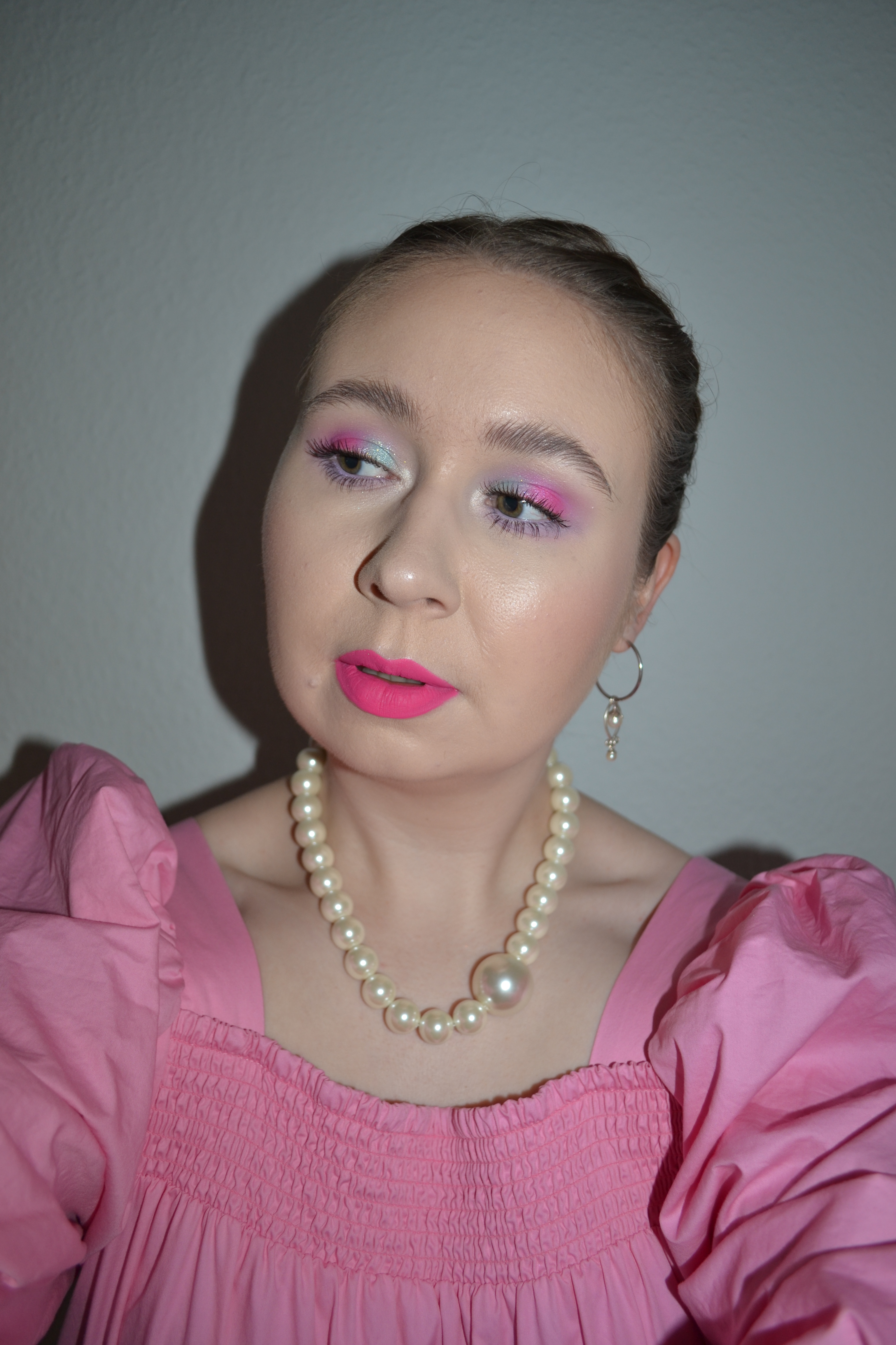 (Base: primers – Urban Decay All Nighter face primer + MAC Strobe Cream (shade: Pinklite), foundation – L’Oreal Paris Infaillible 24H Fresh Wear foundation (shade: 015 Porcelain), concealer – L’Oréal Infaillible More Than Concealer (shade: 322 Ivory), powders – Hourglass Ambient Lighting Ethereal Edit palette (shade: Etherial Light) + e.l.f Sheer Tint finishing powder in Fair/Light. Face make-up: bronzer – Revlon SkinLights Prismatic bronzer in 110 Sunlit Glow, blusher – Hourglass Ambient Lighting Ethereal Edit palette (shade: Diffused Heat), highlighter – BH Cosmetics Aprés in Aspen highlighter palette (shades: Snow Angel + Frosted AF). Eye make-up: base – MAC Pro Longwear Paint Pot in Painterly, eyeshadows – Jeffree Star Blood Lust palette (shades: Your Majesty + Deviant + Vivid Mood) + Made By Mitchell Mini Mitchell Vol. 1 palette (shades: Wapink + Snow Cone) + MAC Nylon eyeshadow, mascara – Maybelline Lash Sensational Sky High mascara, eyeliner – Revolution x Bratz Yasmin eye pencil. Eyebrows: Anastasia Beverly Hills Brow Freeze. Lips: Jeffree Star Velour liquid lipstick in Yes Ma’am)