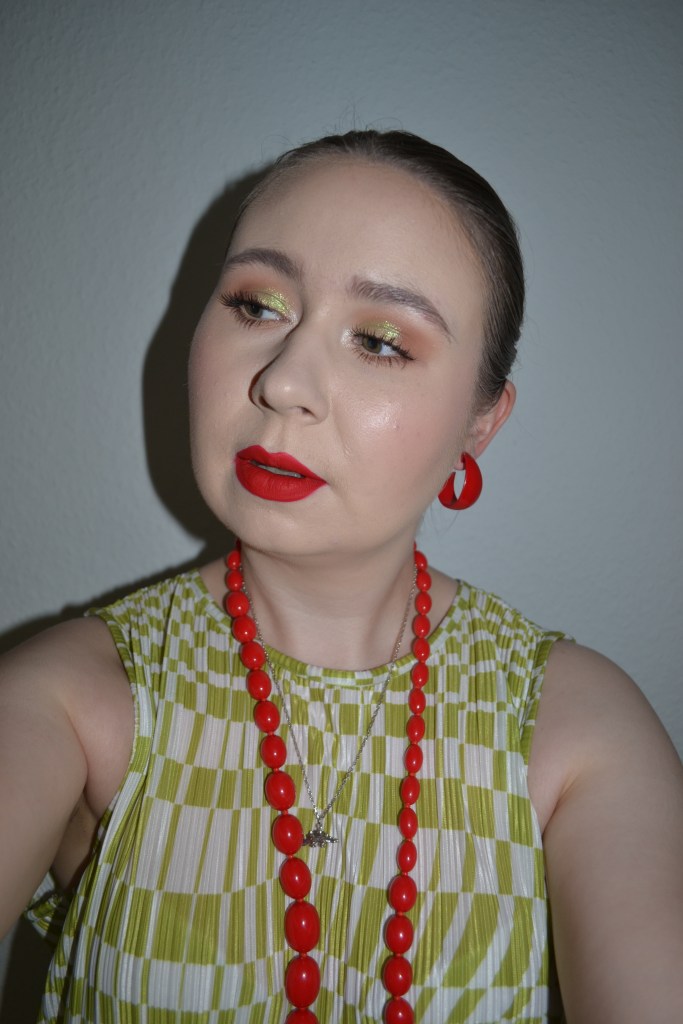 (Base: primer – NYX Angel Veil primer, foundation – Maybelline Dream Urban Cover foundation (shade: 100 Warm Ivory), concealer – L’Oréal Infaillible More Than Concealer (shade: 322 Ivory), powders – e.l.f. HD Undereye setting powder in Sheer + Jeffree Star Magic Star Setting Powder in Fair. Face make-up: bronzer – Fenty Beauty Cheeks Out Freestyle cream bronzer in Butta Bisquit, blusher – Natasha Denona Diamond & Blush palette in 01 Darya Coral (shade: Cream Blush), highlighter – Natasha Denona Diamond & Blush palette in 01 Darya Coral (shade: Diamond Powder). Eye make-up: base – MAC Pro Longwear Paint Pot in Painterly, eyeshadows – Essence eyeshadow in 05 Granny Pants + BPerfect Manifest Dream Big palette (shades: Triple + Mega + Believe + 11), mascara – Maybelline Lash Sensational Sky High mascara, eyeliner – MAC Studio Chromagraphic pencil in NC15/NW20. Eyebrows: Soda #wowbrow Flat Brow Liner in Kim + MAC Brow Set in Clear. Lips: MAC Retro Matte liquid lip colour in Mayhemmed)