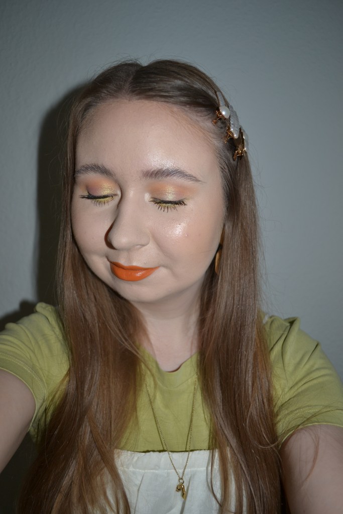 Here’s the make-up I wore with this outfit. This is one of my more subtle eye looks, but I think the pale oranges and yellows and glowy shimmers go well with my flowy maxi dress.