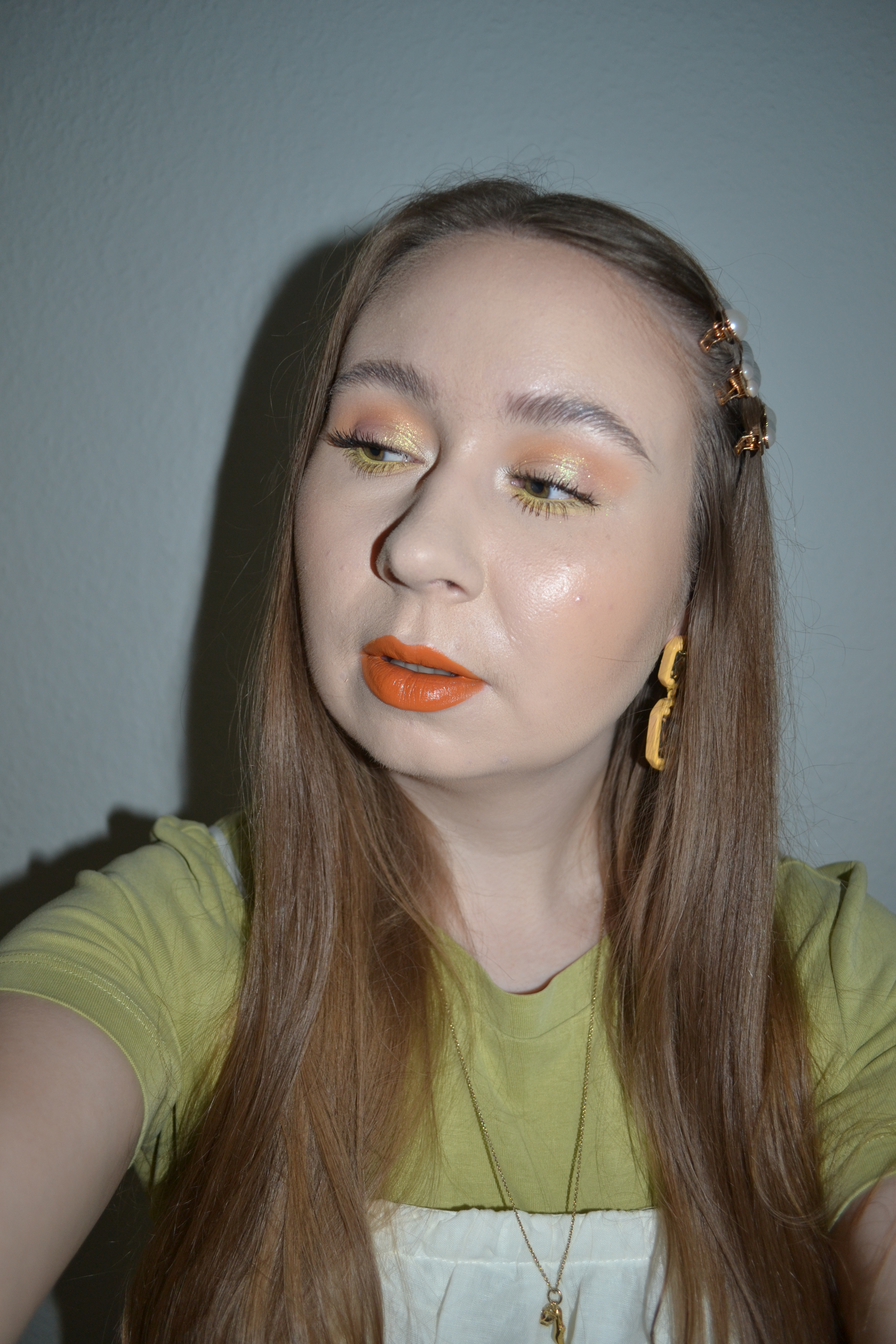 Here’s the make-up I wore with this outfit. This is one of my more subtle eye looks, but I think the pale oranges and yellows and glowy shimmers go well with my flowy maxi dress.