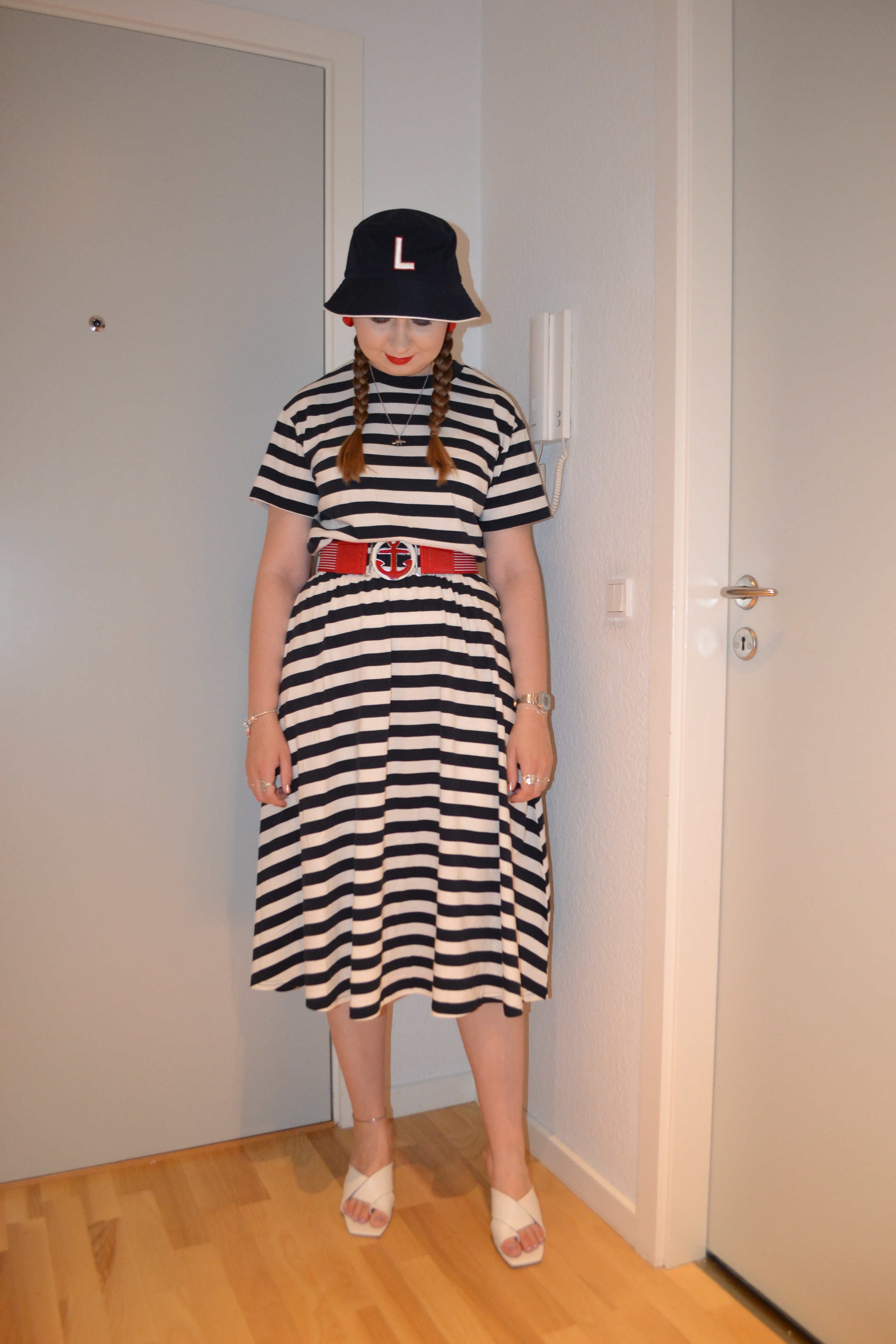 Nautical vibes Posted on January 14, 2022 by Mucha-Lucha Here’s what I wore Thursday August 12. I love a dress like this one; it singes in my waist, but it’s super comfy. I also just love the nautical vibes of this look. (Bucket hat – Zara, belt – second hand, dress + heels – H&M) Share this: Click to share on X (Opens in new window) X Click to share on Facebook (Opens in new window) Facebook Like Loading... Related