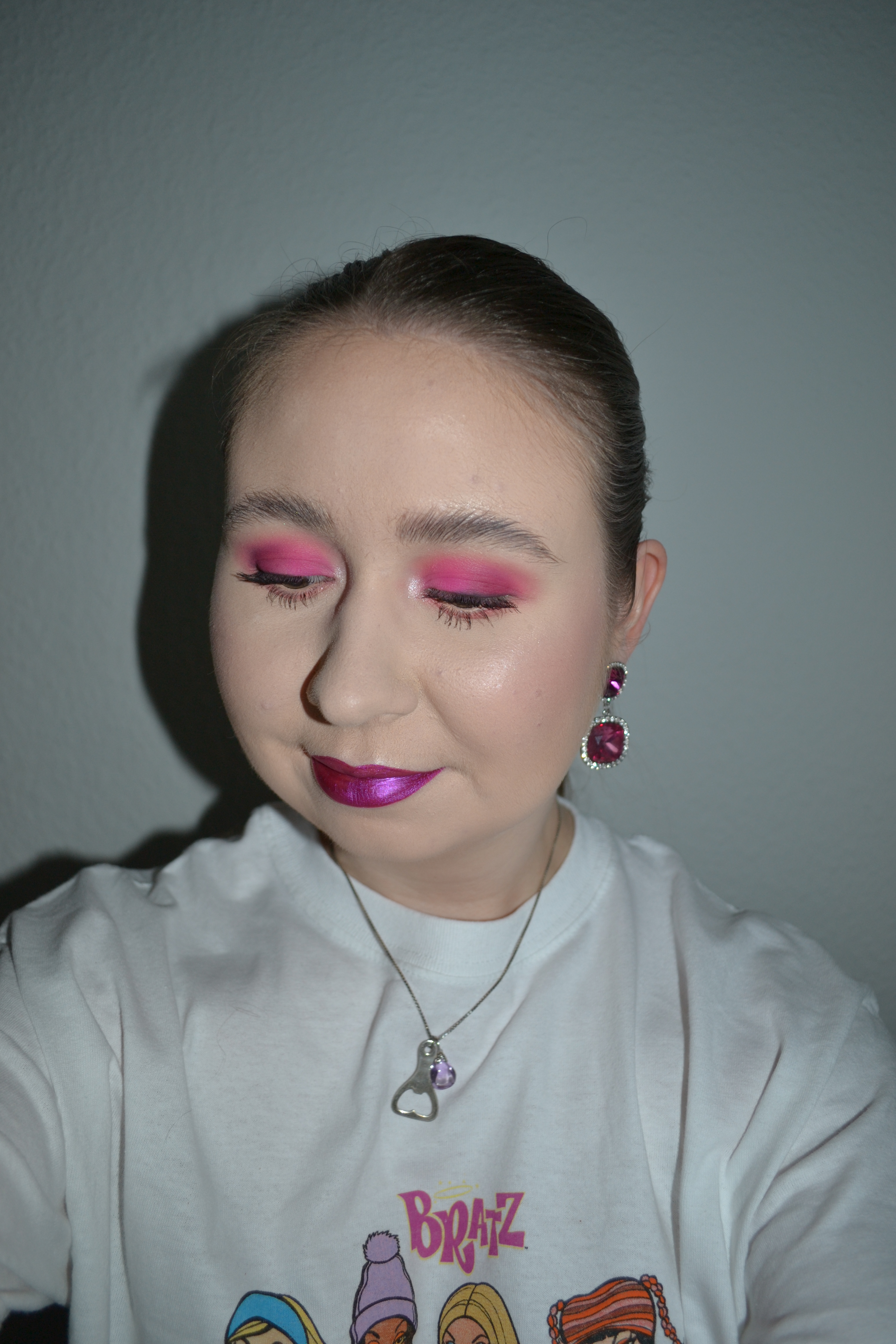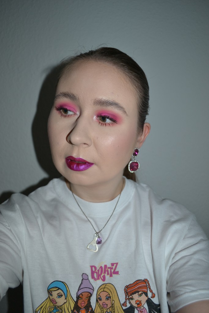 (Base: primer – e.l.f. Poreless Putty primer, foundation – L’Oreal Paris Infaillible 24H Fresh Wear foundation (shade: 015 Porcelain), concealer – L’Oréal Infaillible More Than Concealer (shade: 322 Ivory), powder – MAC Prep + Prime Transparent finishing powder. Face make-up: bronzer/contour – Natasha Denona Contour Sculpting Powder in 01 Light, blusher – MAC Extra Dimension blush in Under My Plum, highlighter – Becca Shimmering Skin Perfector pressed highlighter (shade: Pearl). Eye make-up: base – MAC Pro Longwear Paint Pot in Painterly, eyeshadows – Essence eyeshadow in 05 Granny Pants + BH Cosmetics Lookin’ Like A Snack palette (shades: Bootylicious + Hit That + You Up? + Thot + Yummy), mascara – Essence Volume Booster lash primer + Maybelline Lash Sensational Sky High mascara, eyeliner – Revolution x Bratz Sasha eye pencil. Eyebrows: Anastasia Beverly Hills Brow Freeze + Maybelline Brow Ultra Slim pencil in Medium Brown. Lips: Jeffree Star Velour liquid lipstick in I’m Vulgar)