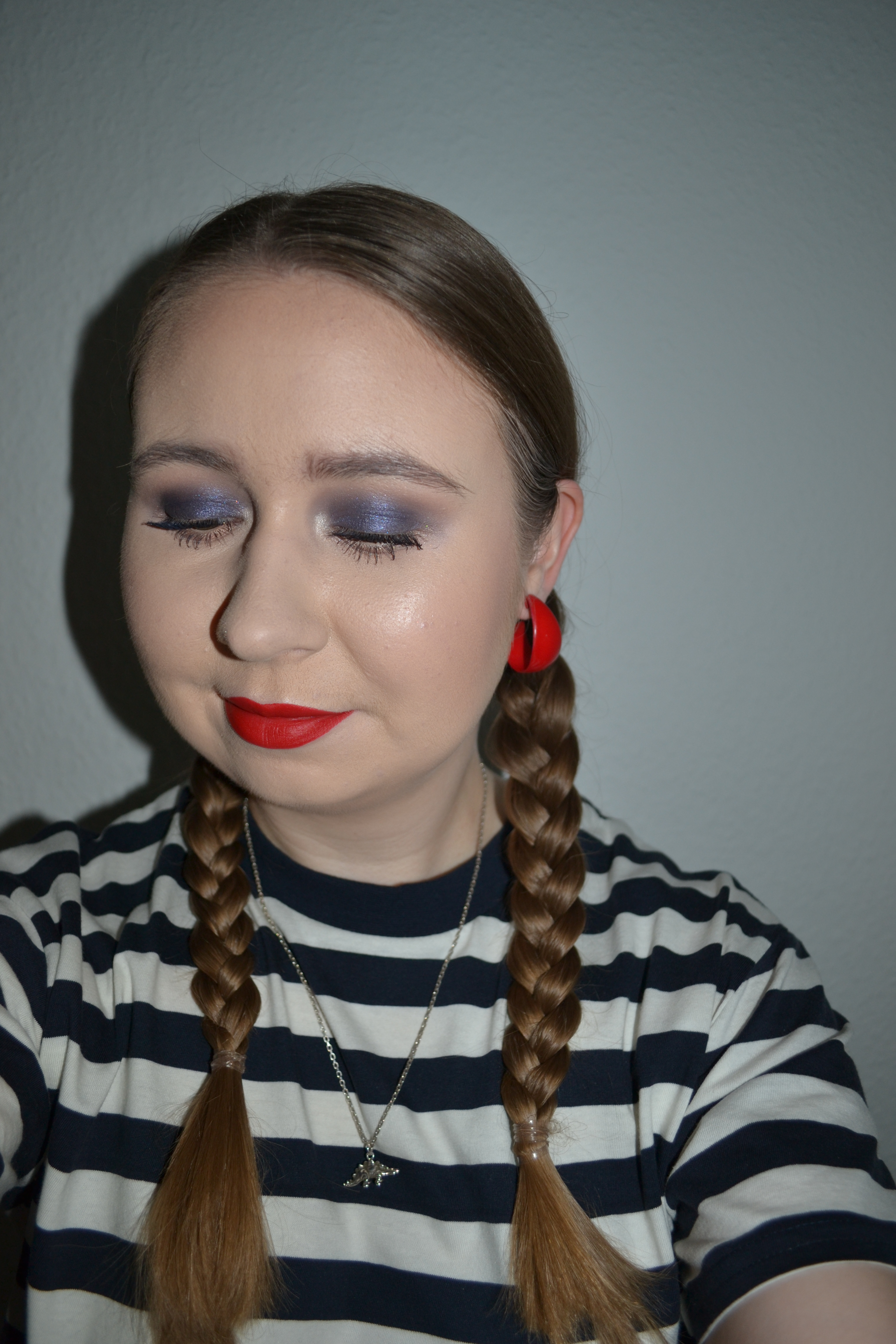 Here’s the make-up I wore with this outfit. How fun is this purple lipstick! If you didn’t already know, my favourite colour is purple, and I love all kinds of purple make-up; lipsticks, eyeshadows, blushers, you name it.