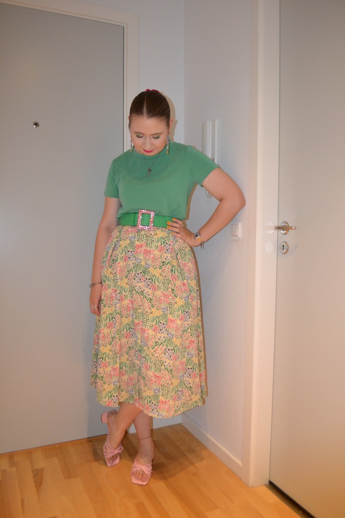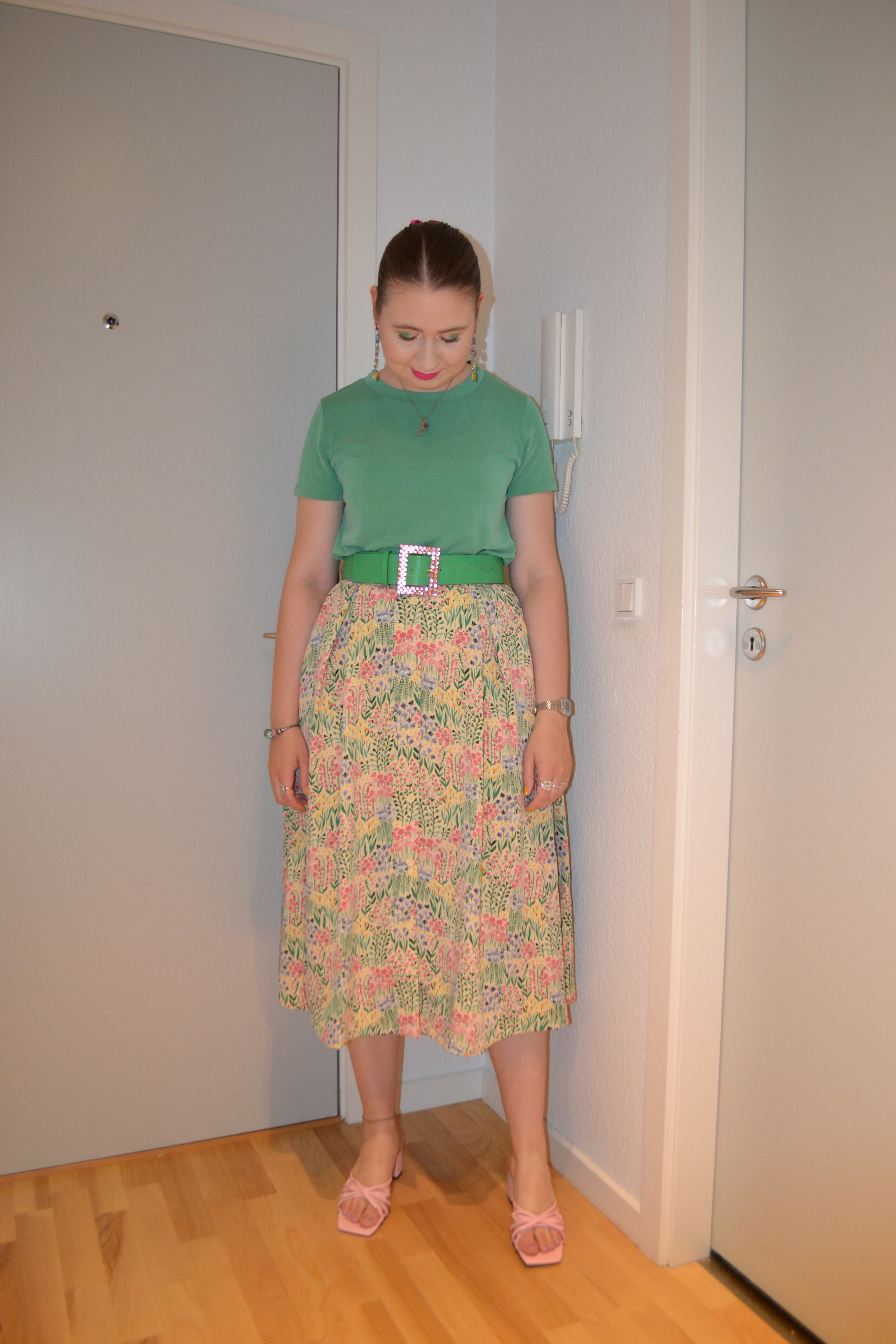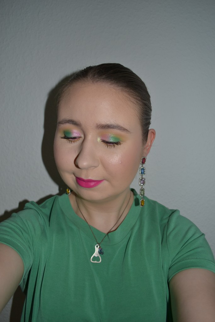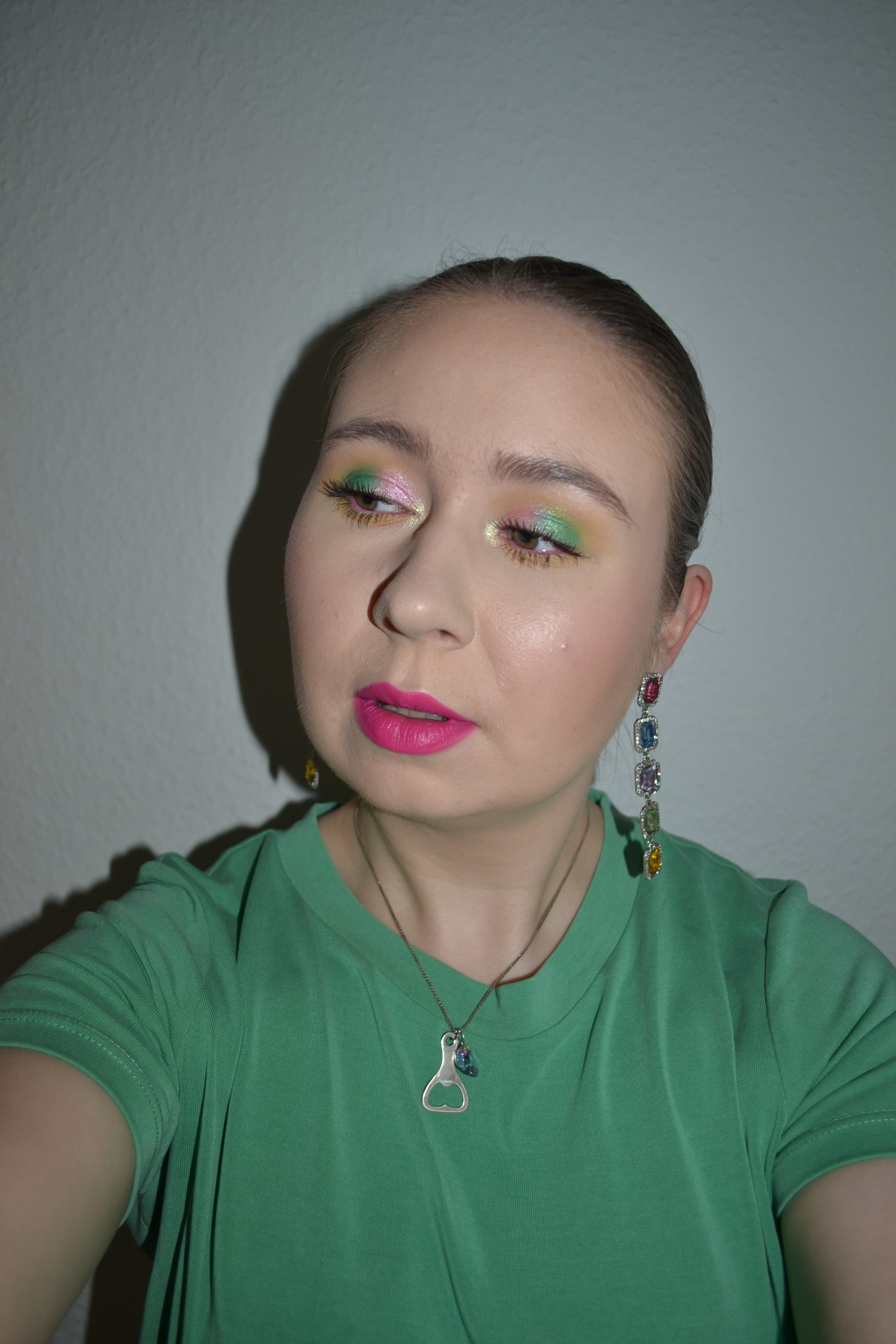 Here’s the make-up I wore with this outfit. I had to continue the green and pink combo in my make-up look, but I also added a bit of yellow as well to match the yellow in my skirt and earrings.