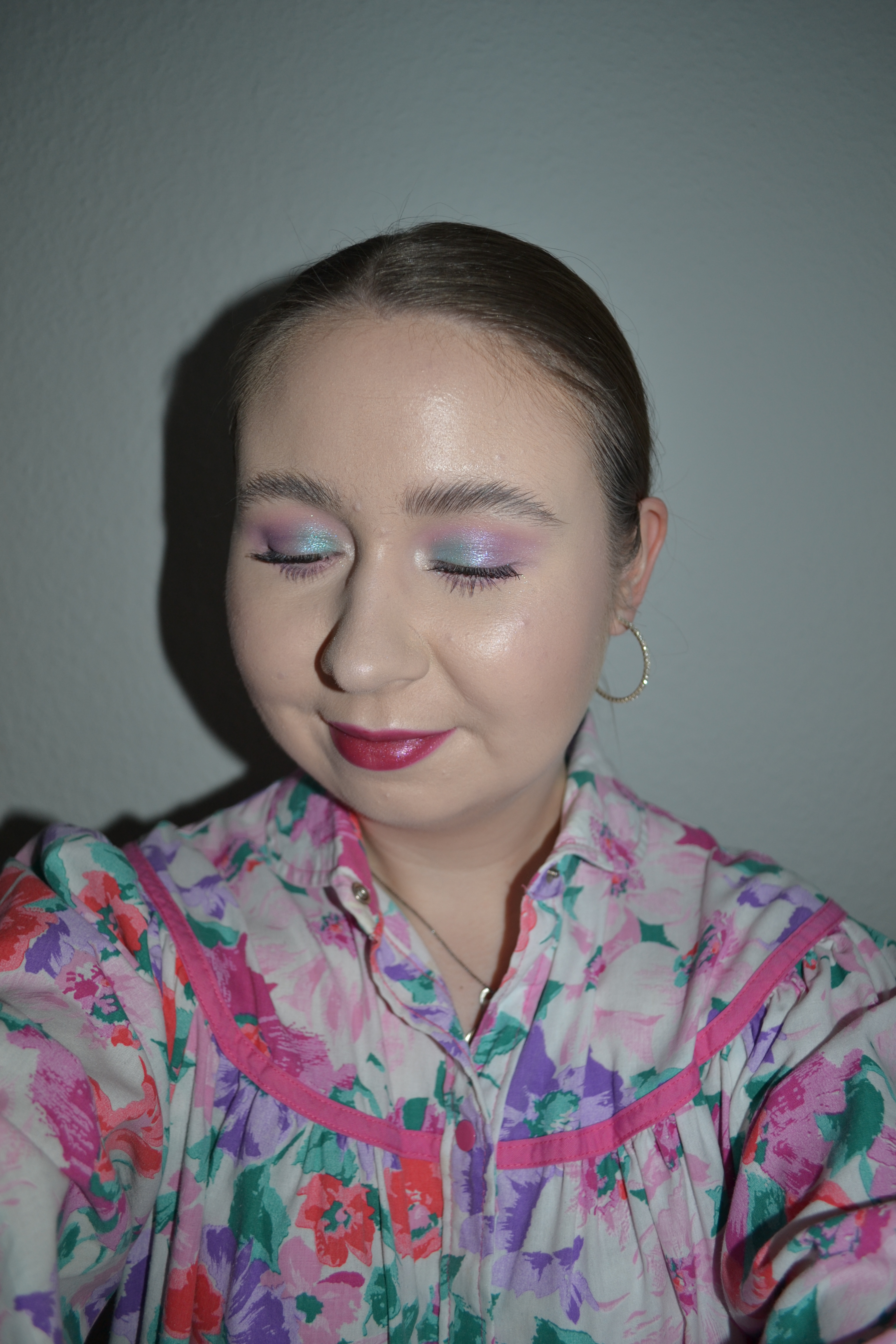 Here’s the make-up I wore with this outfit. It’s not that often that I go all out with shimmer on both eyes and lips, but I think it works in this case.